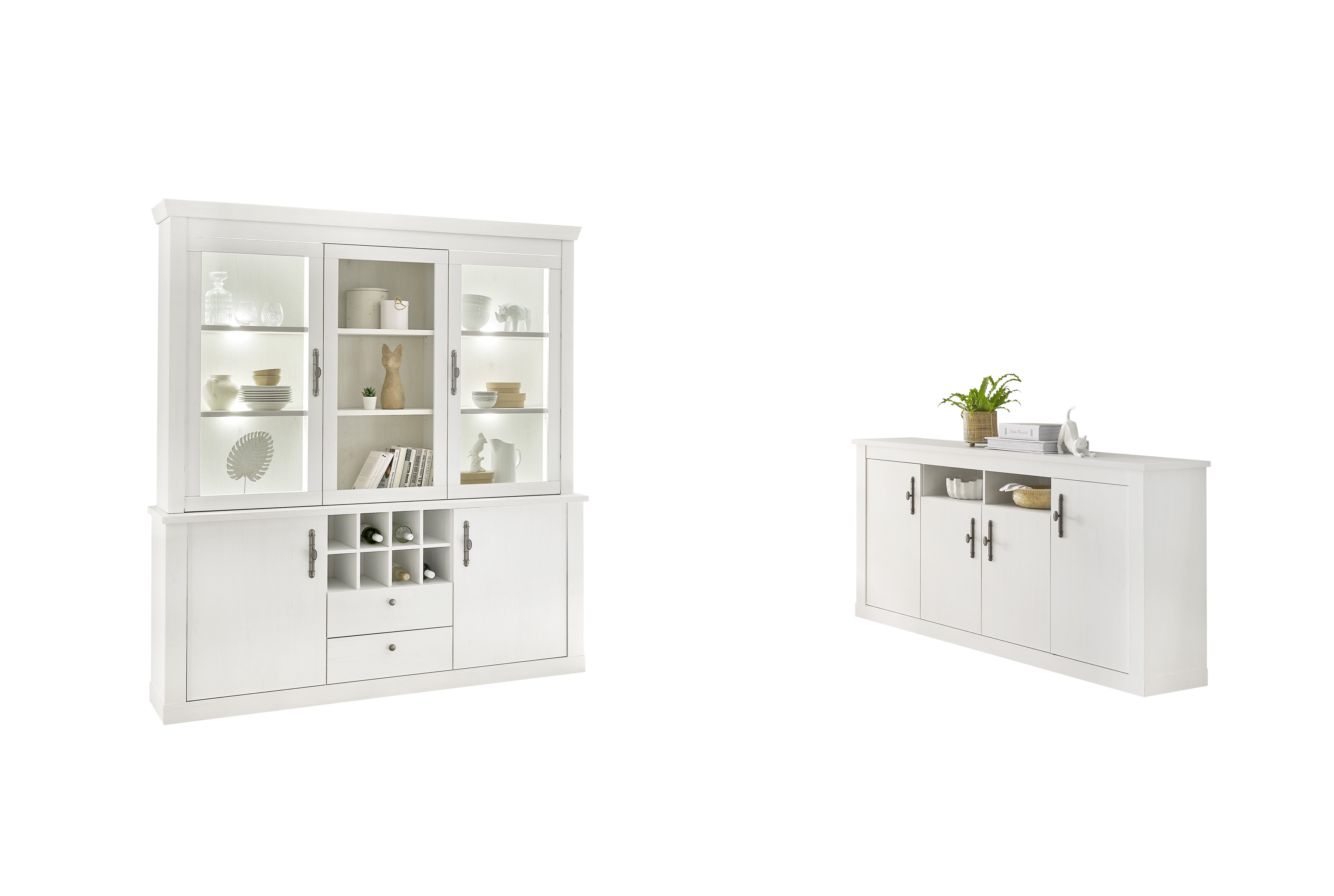 1 Buffet mit 2 Türen (dahinter je 1 Boden), mittig 2 Schubkästen und 1 Flascheneinteilung mit 8 Fächern, oben 1 Aufsatz mit 2 Glasrahmentüren, 4 Böden und 3 offenen Fächern