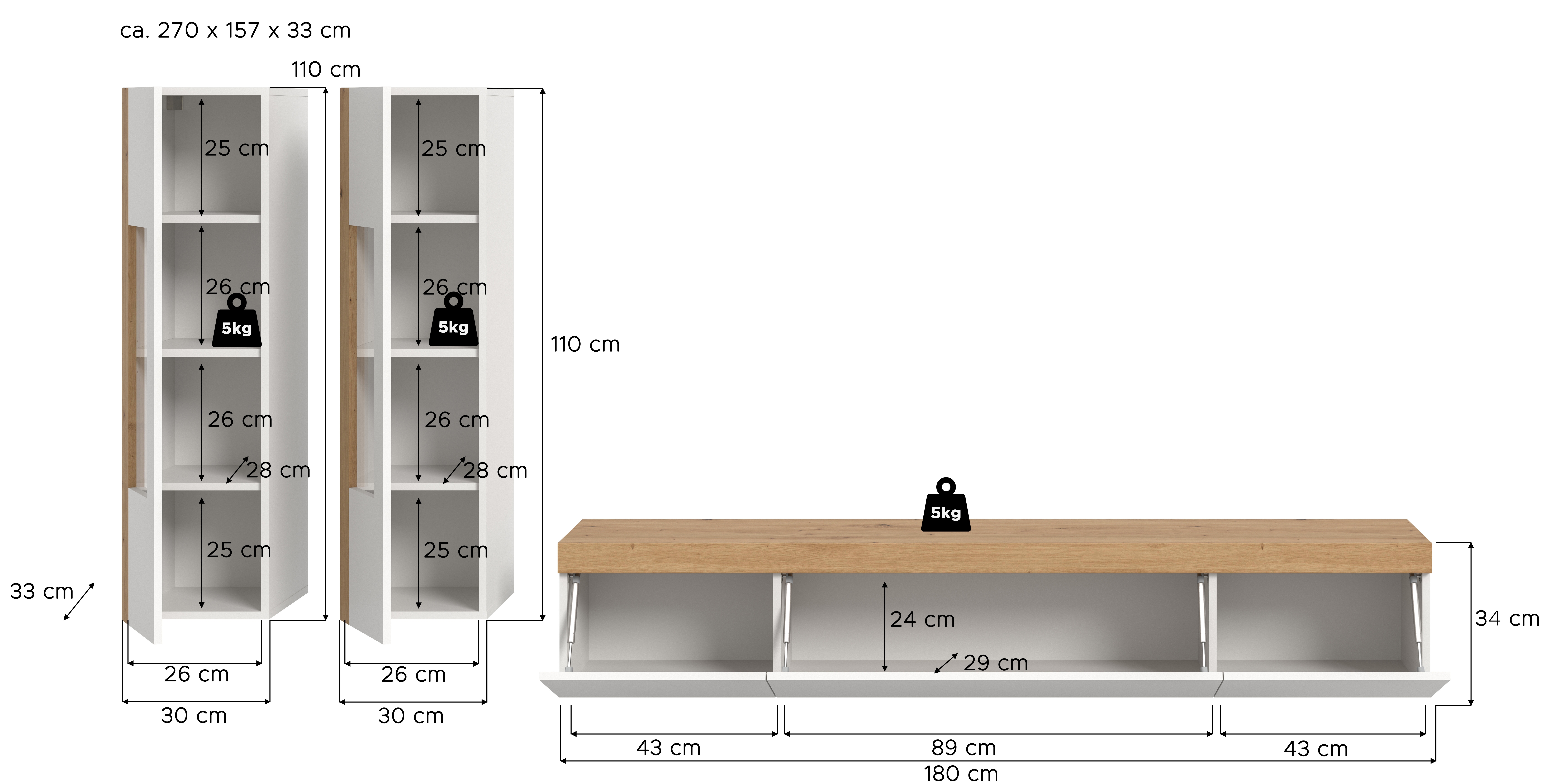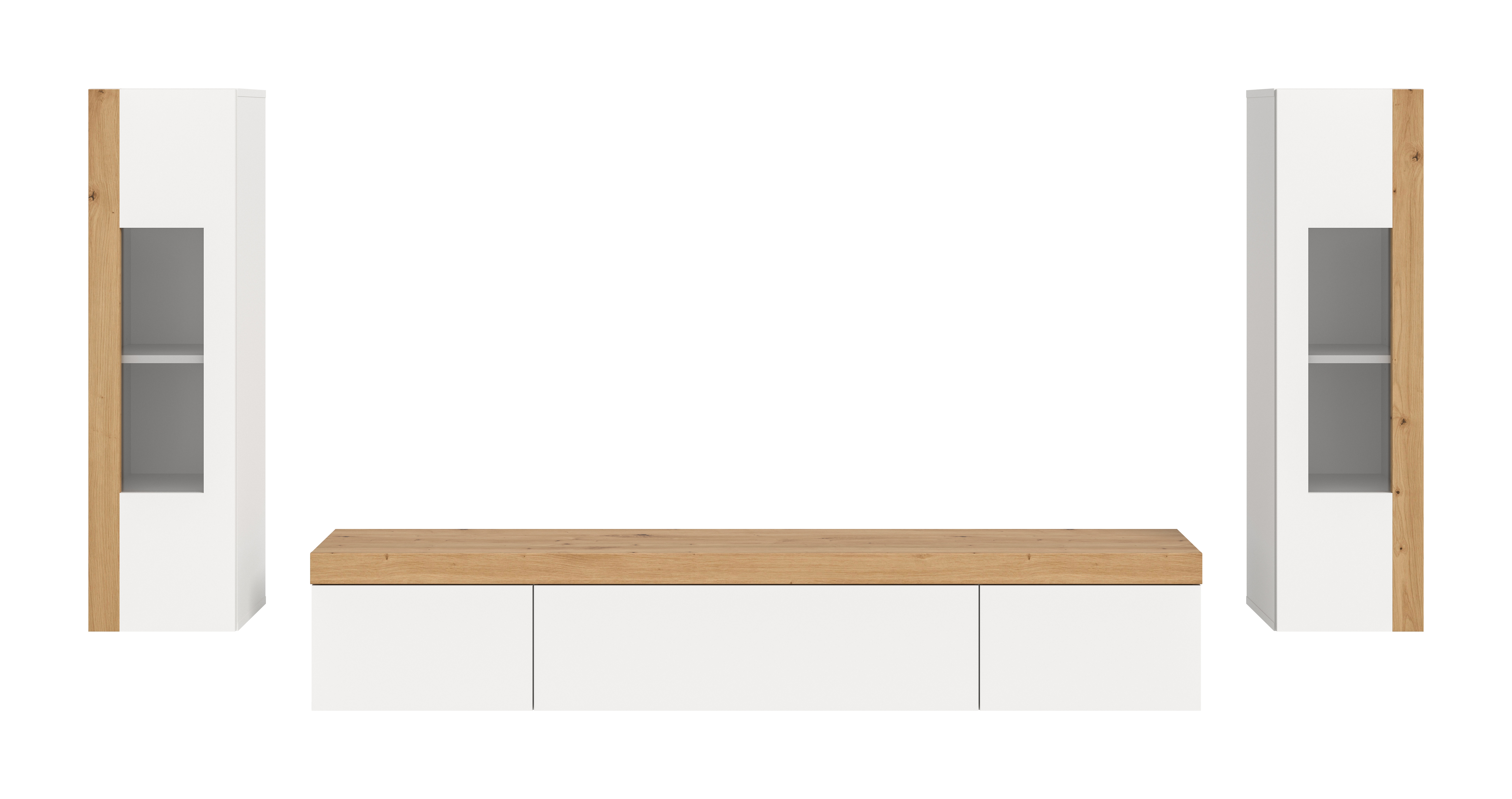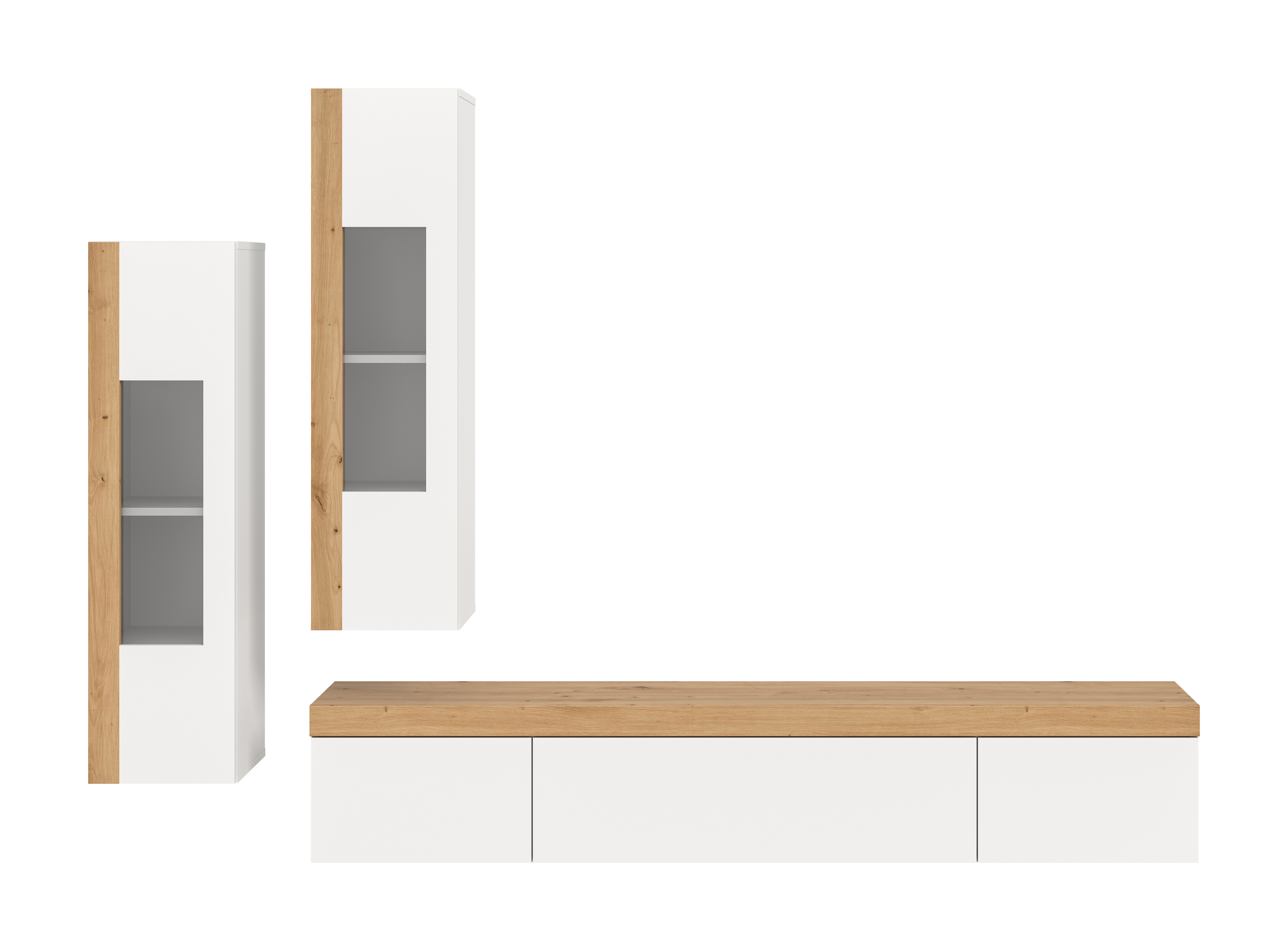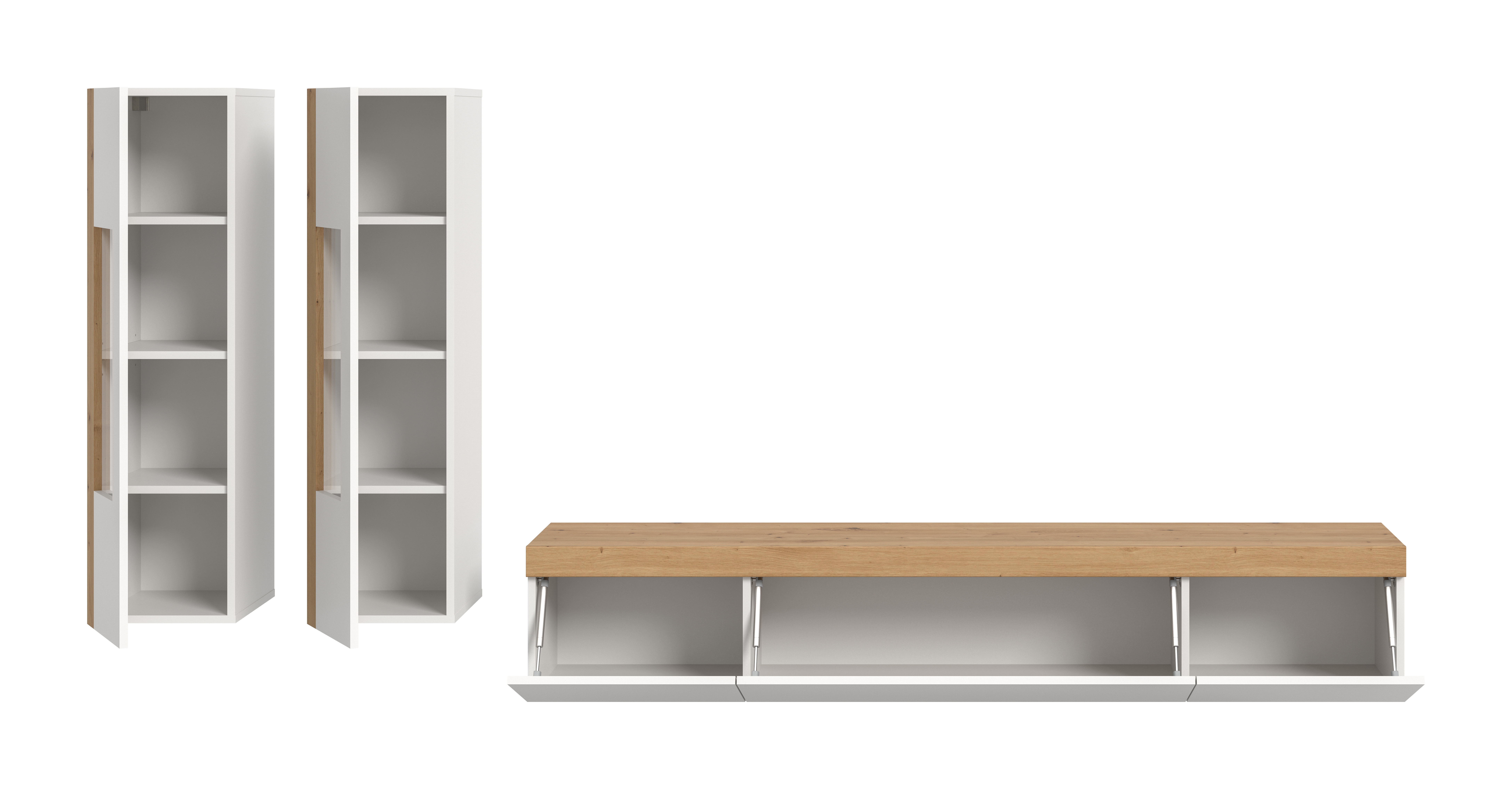 Erleben Sie die vielseitige 3-teilige Wohnkombination, die Eleganz und Funktionalität in einem bietet! Diese Kombination umfasst zwei Vitrinen und ein großzügiges Lowboard, das sowohl hängend als auch stehend montiert werden kann. Mit einem Typenabstand von 15 cm bietet die Wohnkombination optimale Nutzungsmöglichkeiten und passt perfekt in moderne Wohnräume. Perfekt für die stilvolle Aufbewahrung und Präsentation von Dekorationen und Multimedia-Geräten.