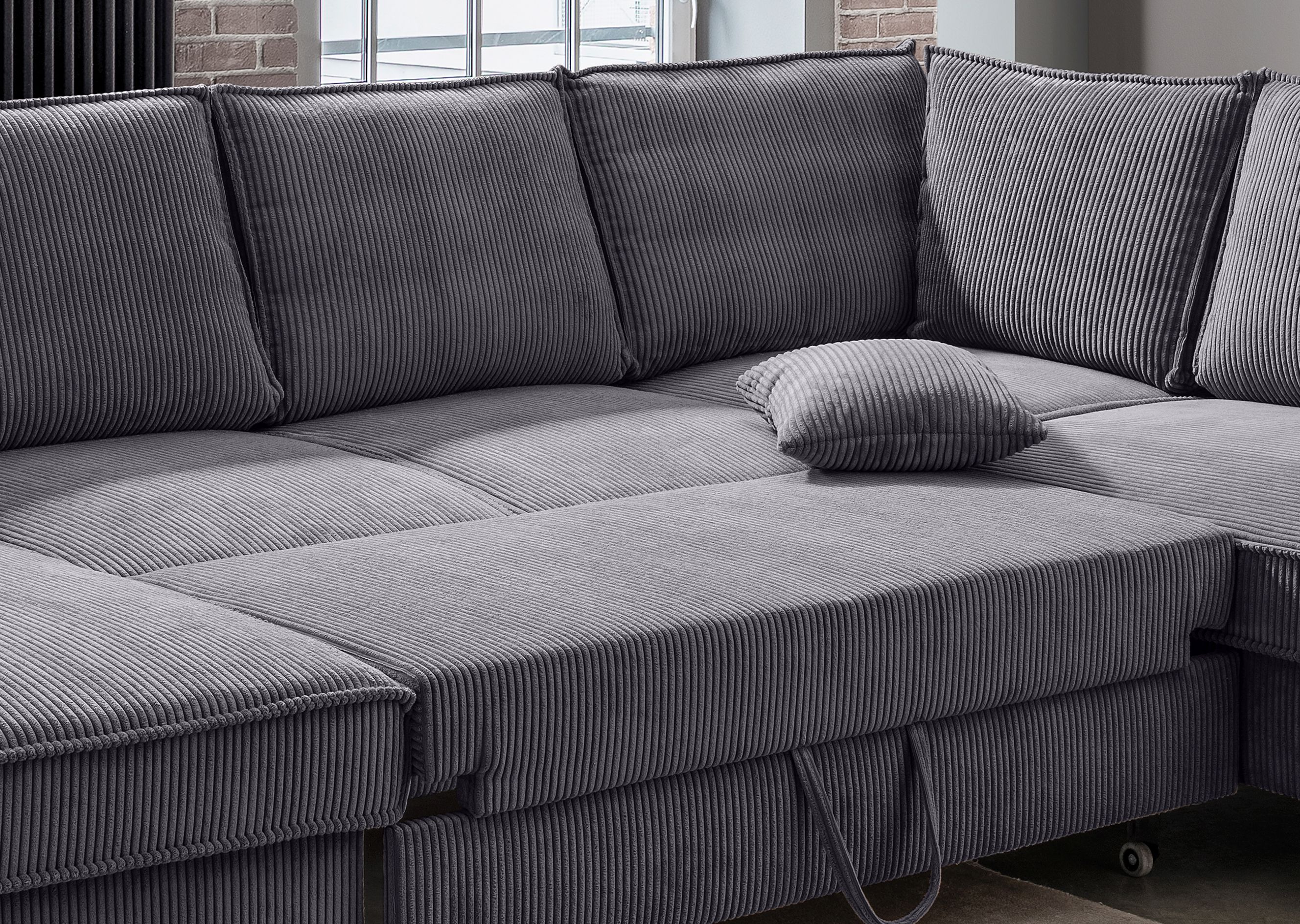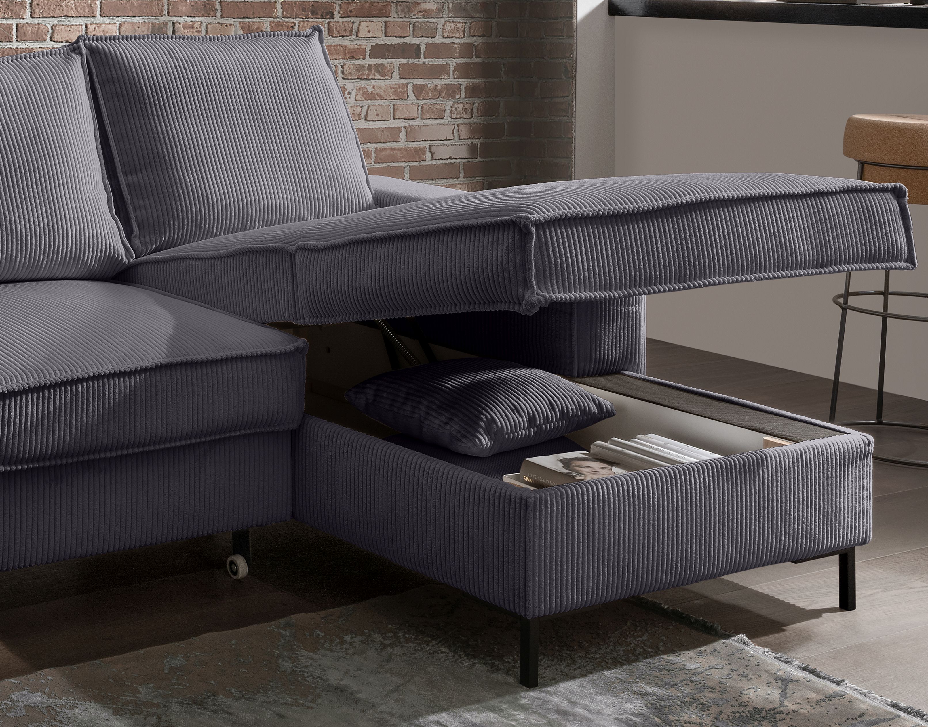 | Ausstattung Polster: | Ottomane rechts, Rücken echt, inkl. Bettkasten, inkl. Kissen | ||