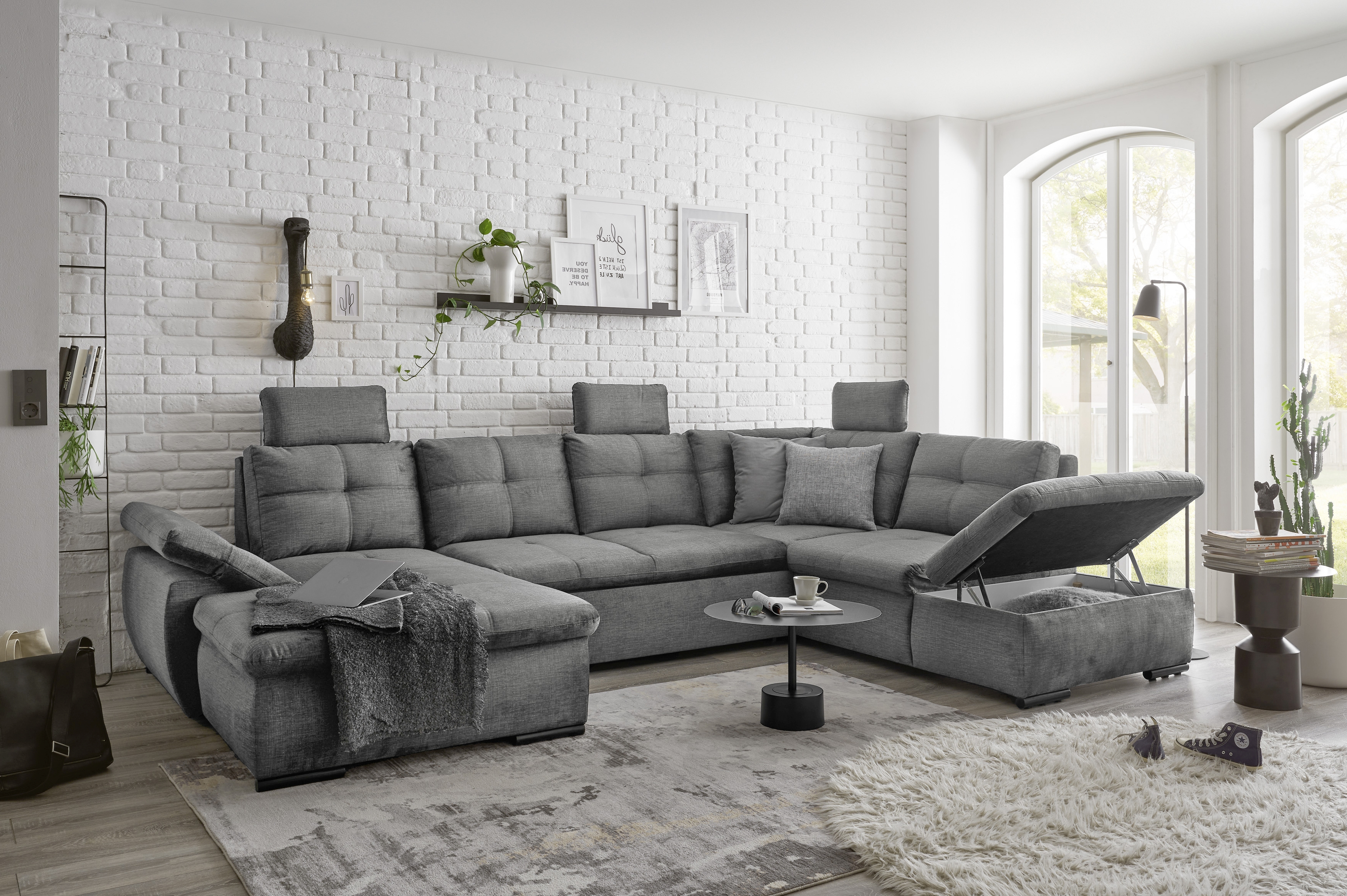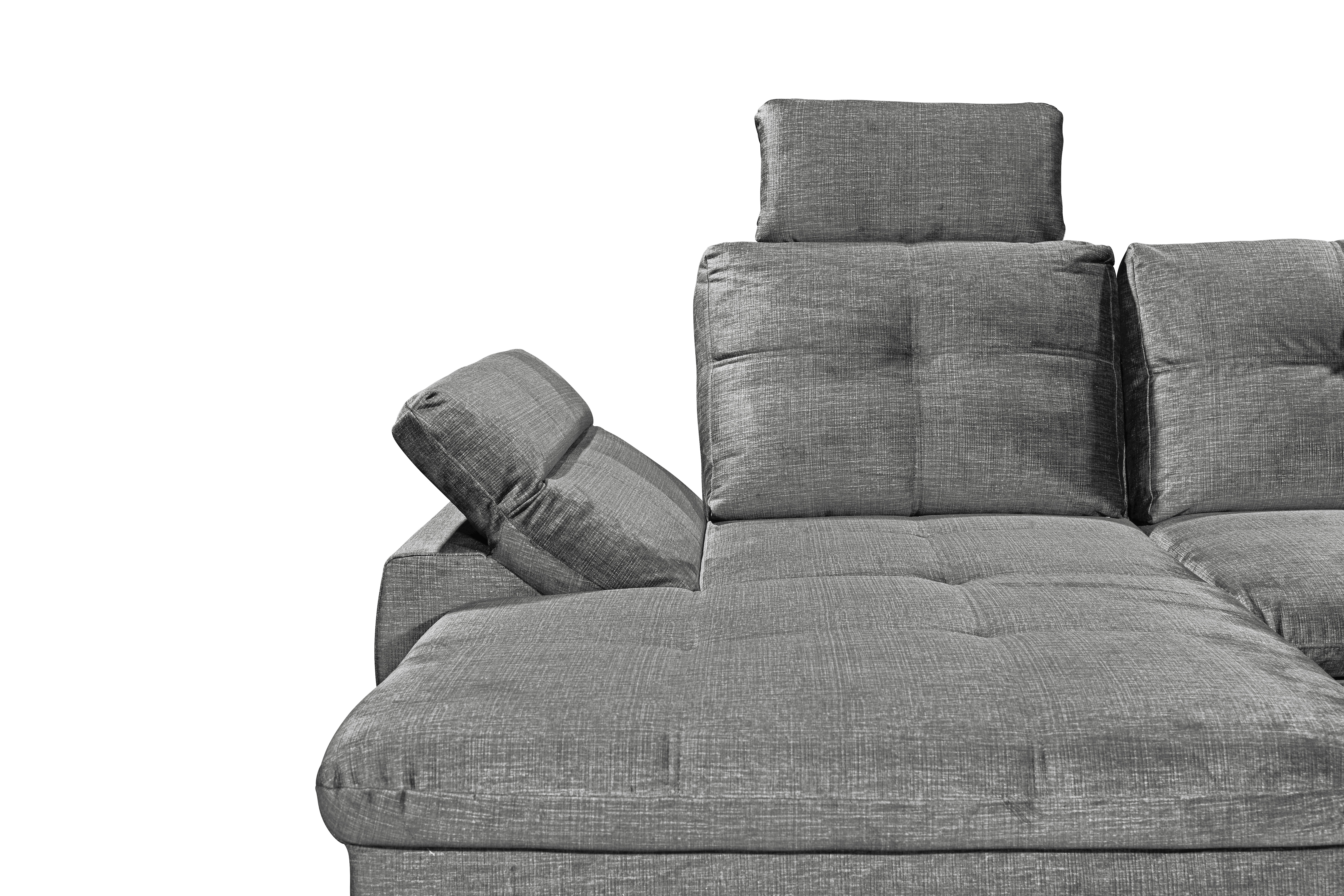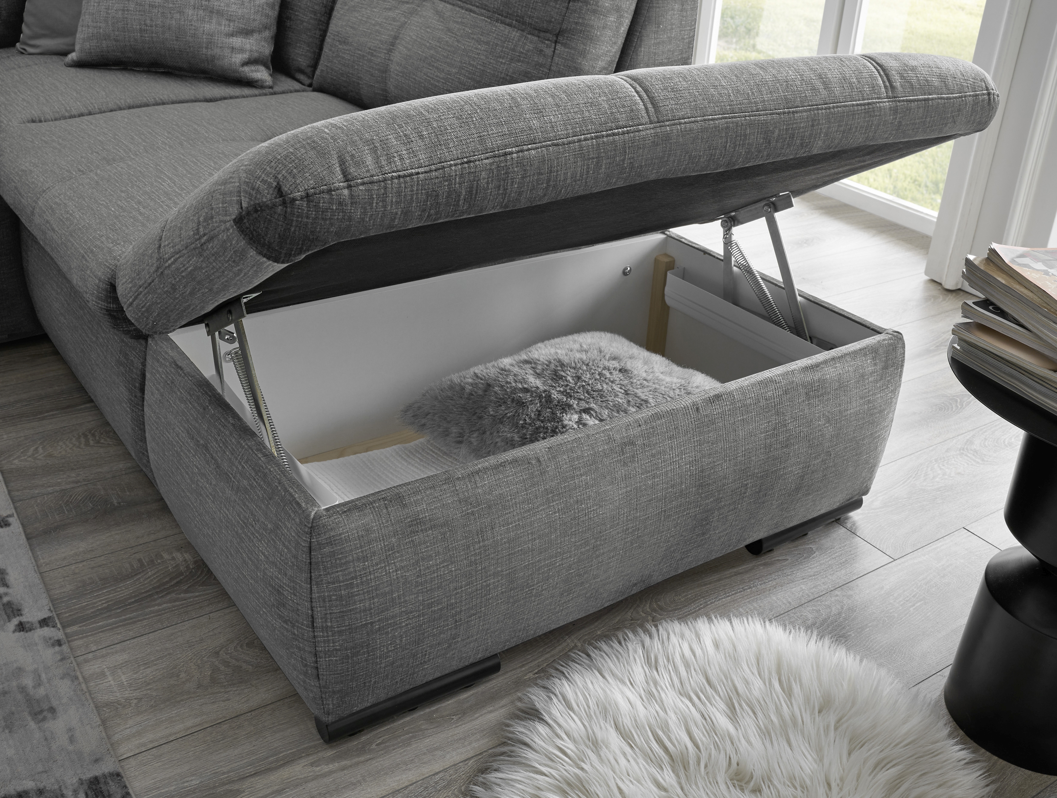| Ausstattung Polster: | Kopfstützen, Ottomane rechts, Rücken echt, inkl. Bettkasten | ||