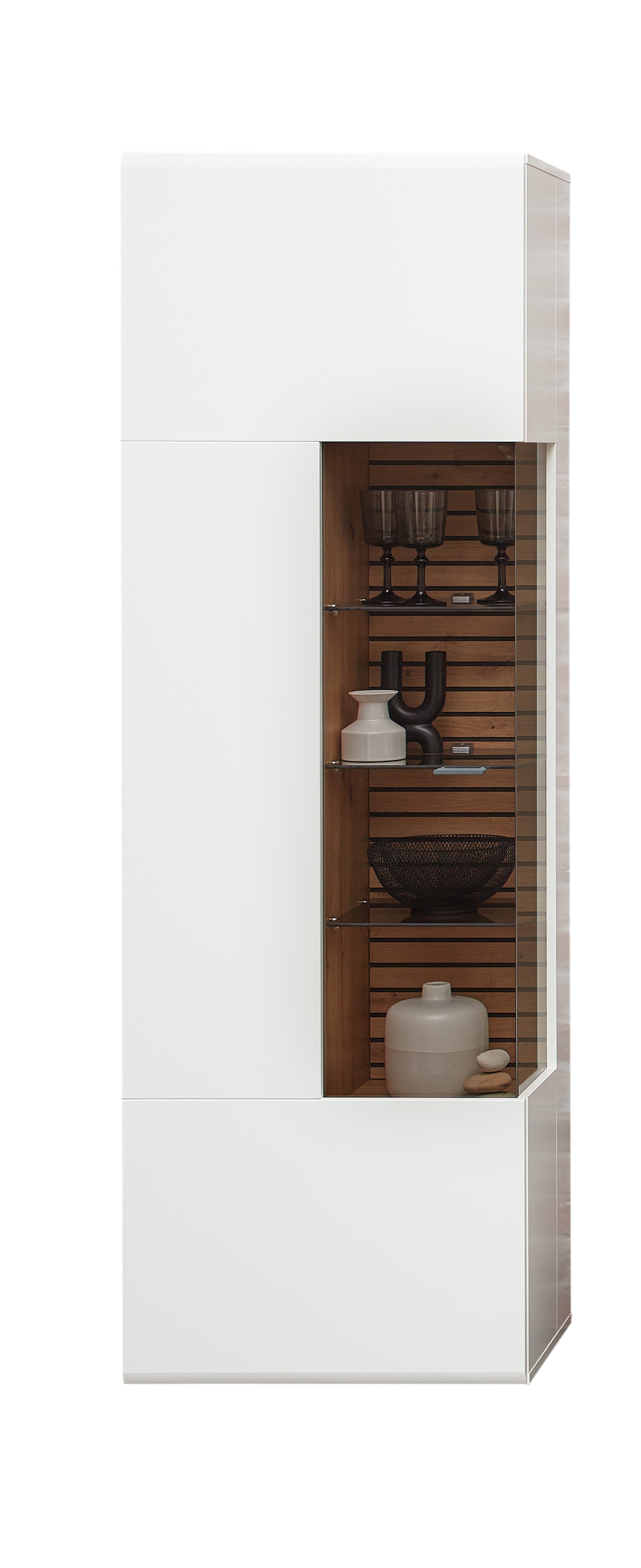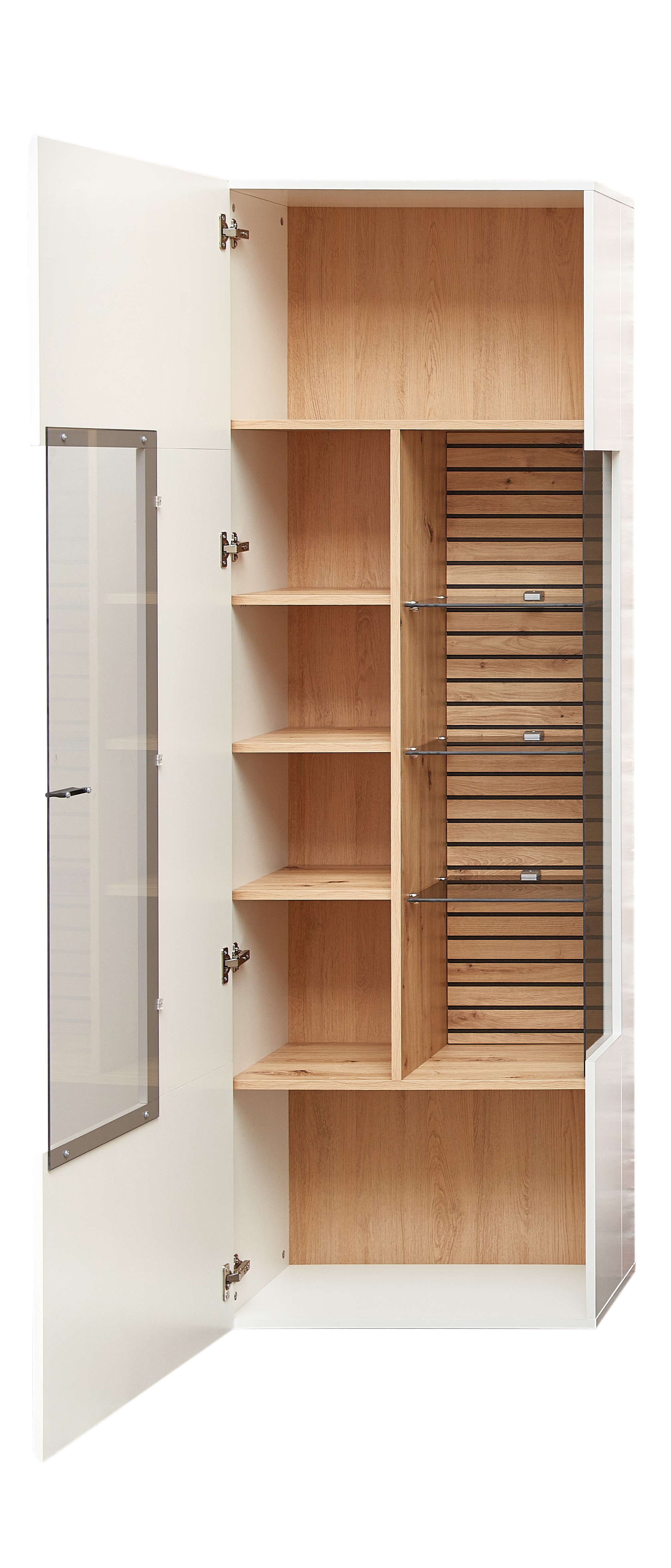 1 Vitrine mit 1 Tür mit Glaseinsatz, 2 Konstruktionsböden, 3 Böden und 3 Glasböden