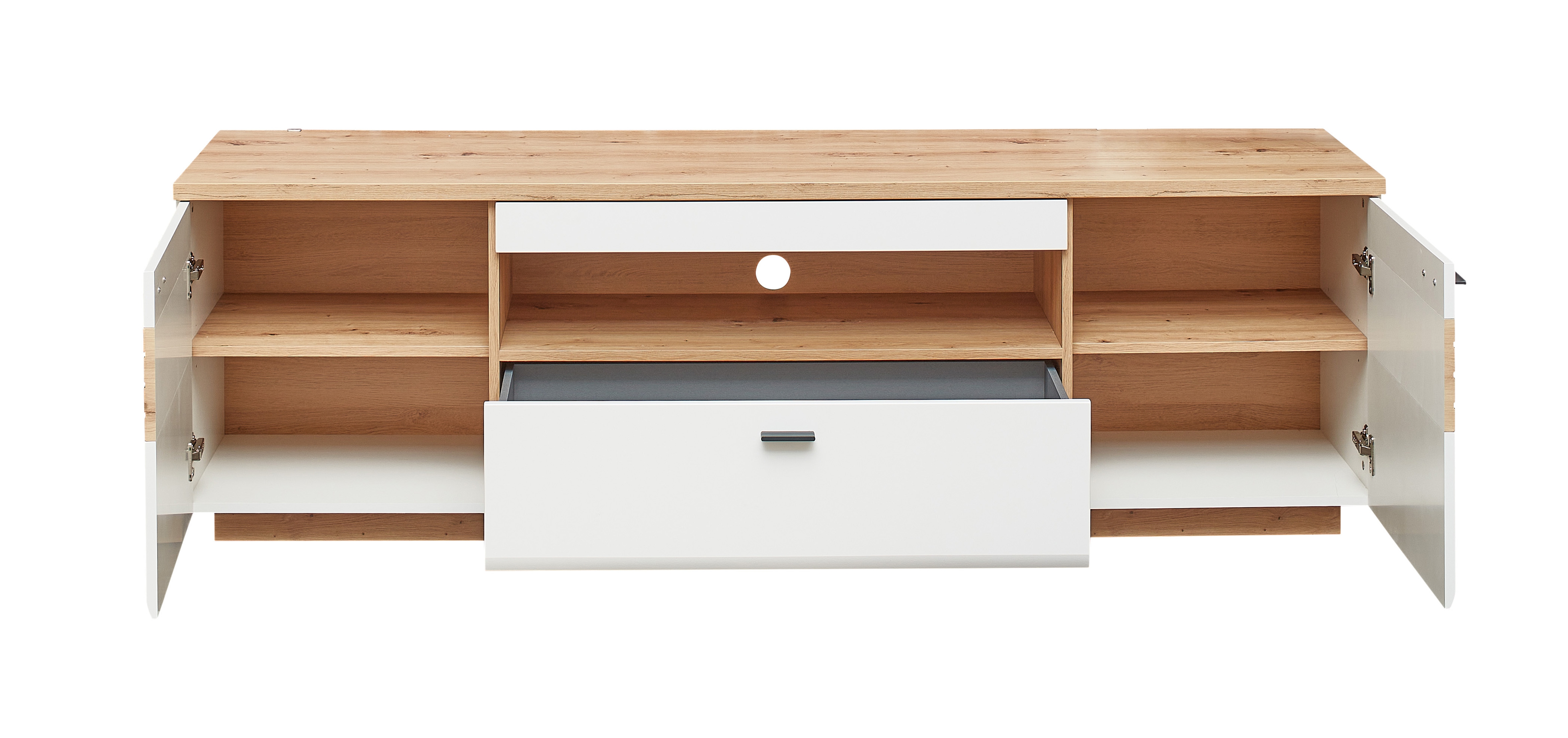 1 Lowboard mit 2 Türen, 1 Schubkasten, 1 offenes Fach und 1 Kabeldurchlass