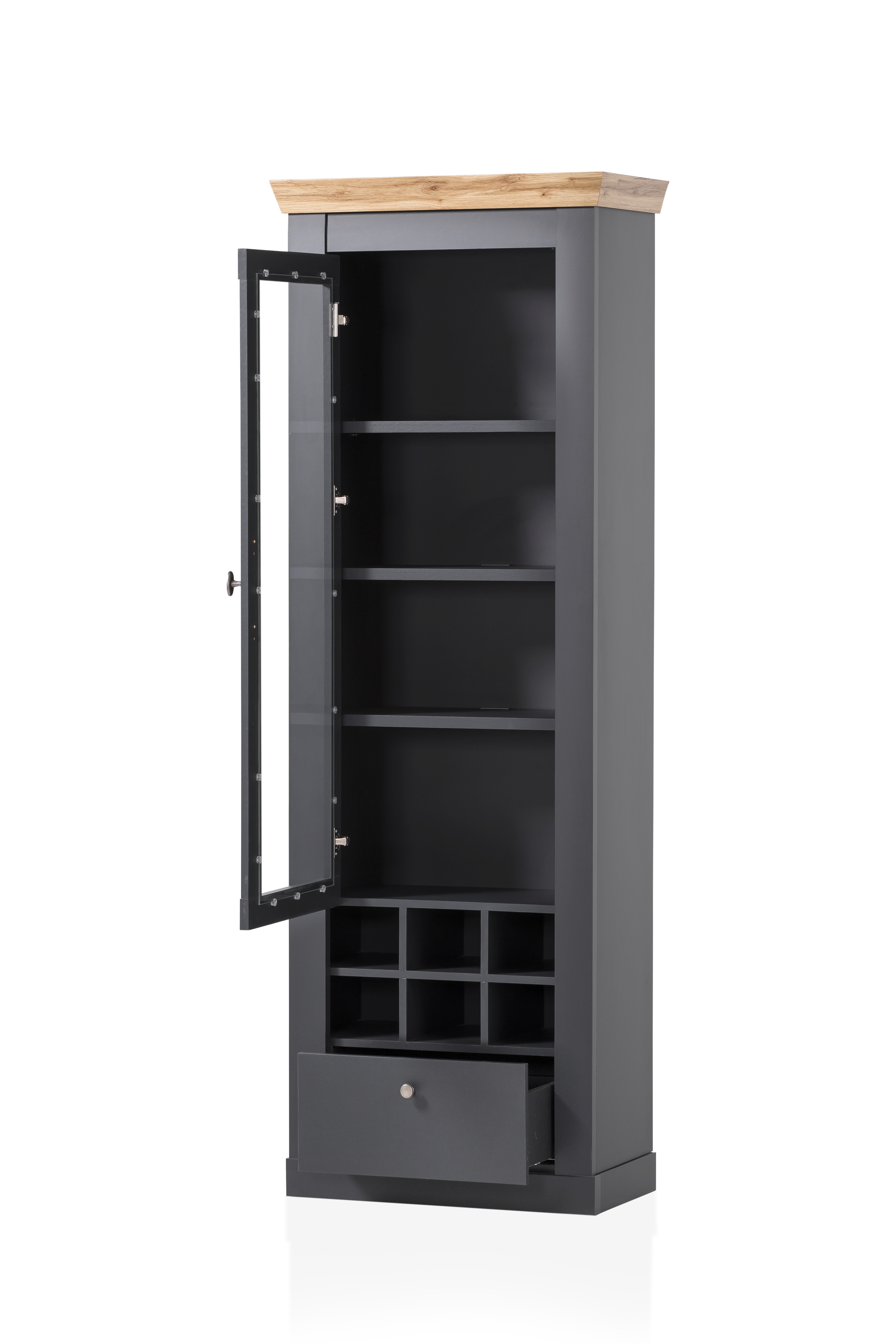 1 Vitrine mit 1 Glasrahmentür, 3 Böden, 1 Schubkasten und 1 Flascheneinteilung mit 6 Fächern