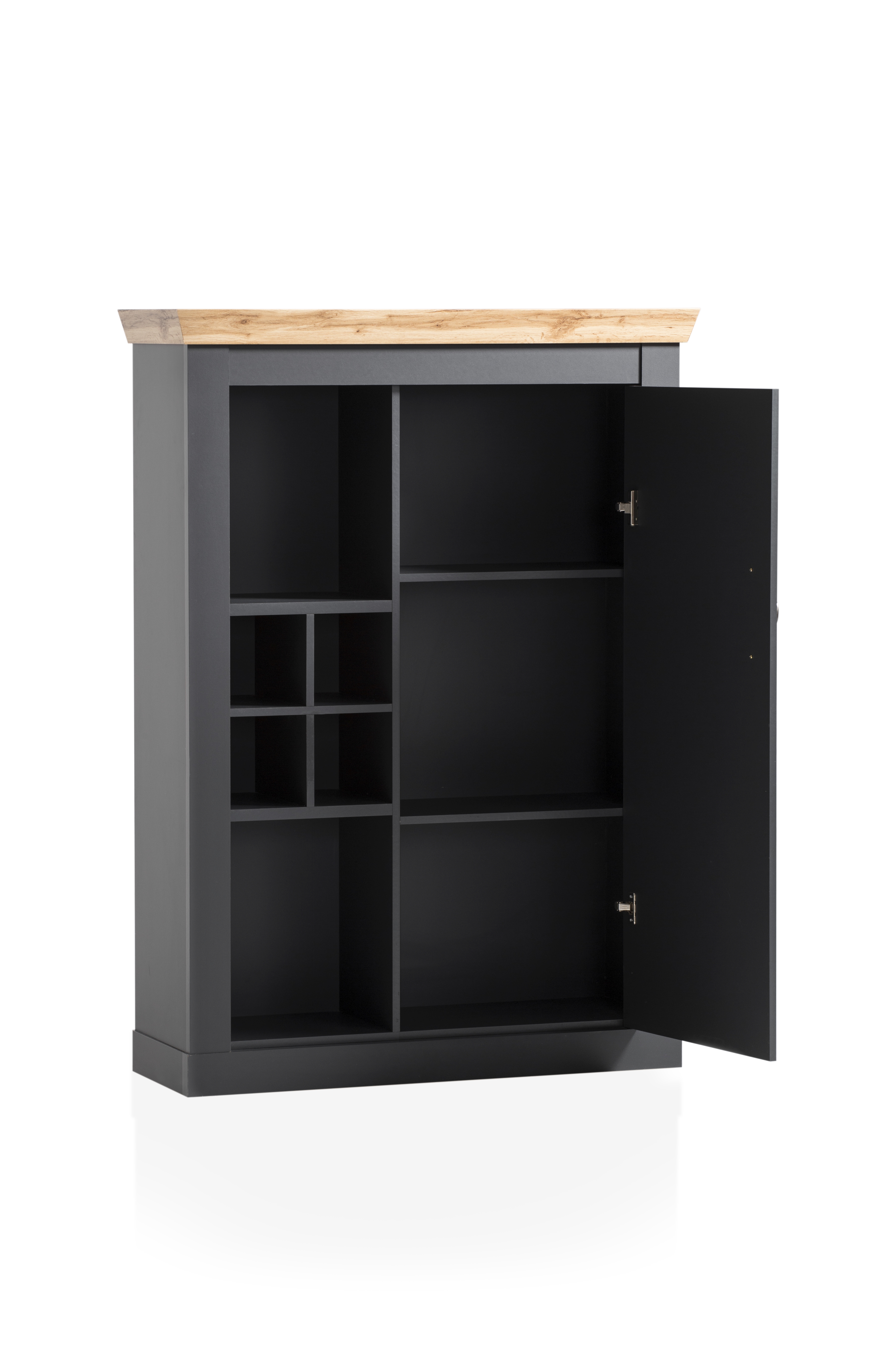 1 Kommode mit 1 Tür, 2 Böden, 1 Flascheneinteilung mit 4 Fächern und 2 offenen Fächern