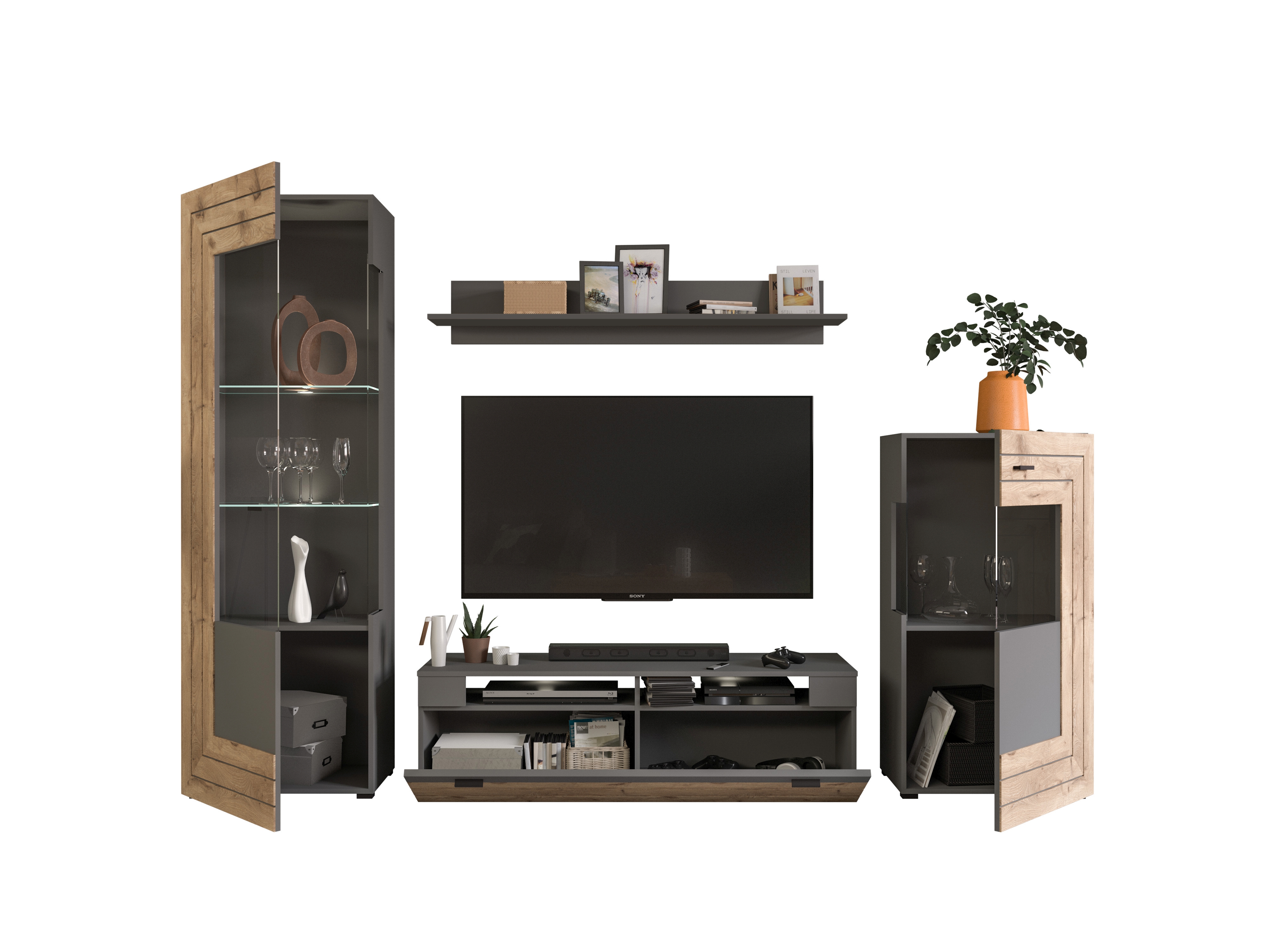 - Funktionalität: Die Wohnwandkombination bietet großzügigen Stauraum für die Aufbewahrung von Multimedia-Geräten, Büchern, Dekorationsobjekten und anderen Gegenständen, wodurch sie eine praktische Lösung zur Organisation des Wohn- und Essbereichs darstellt.