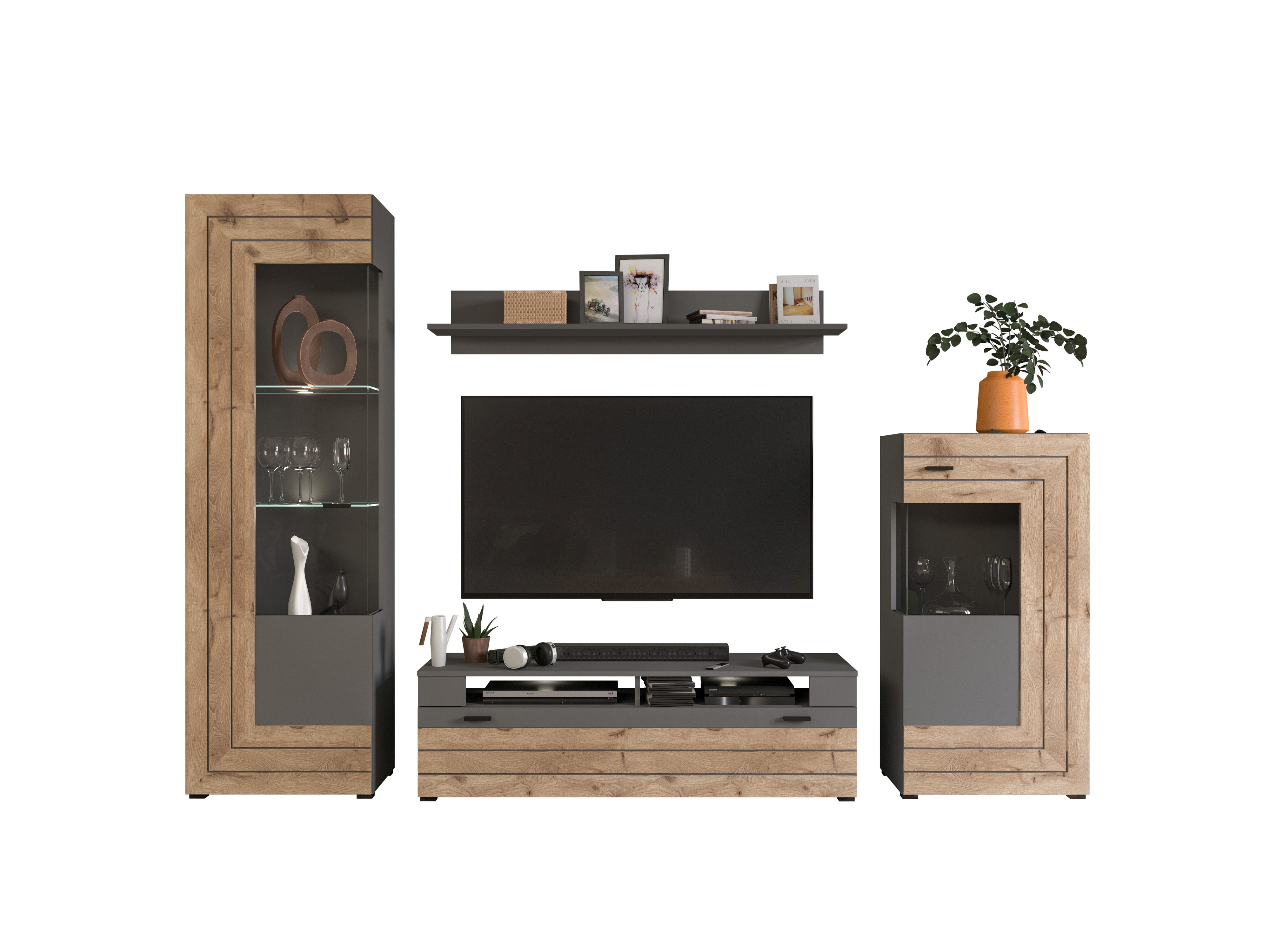 Unsere vielseitige Wohnwandkombination in ansprechendem Grau-Nachbildung bietet die perfekte Lösung für Ihr Wohnzimmer. Mit durchdachtem Design und hochwertiger Verarbeitung schafft sie nicht nur Stauraum, sondern setzt auch stilvolle Akzente in Ihrem Zuhause. Entdecken Sie jetzt die moderne Eleganz und Funktionalität dieser Wohnwandkombination, die Ihren Wohnraum bereichert und für bewundernde Blicke sorgt.
