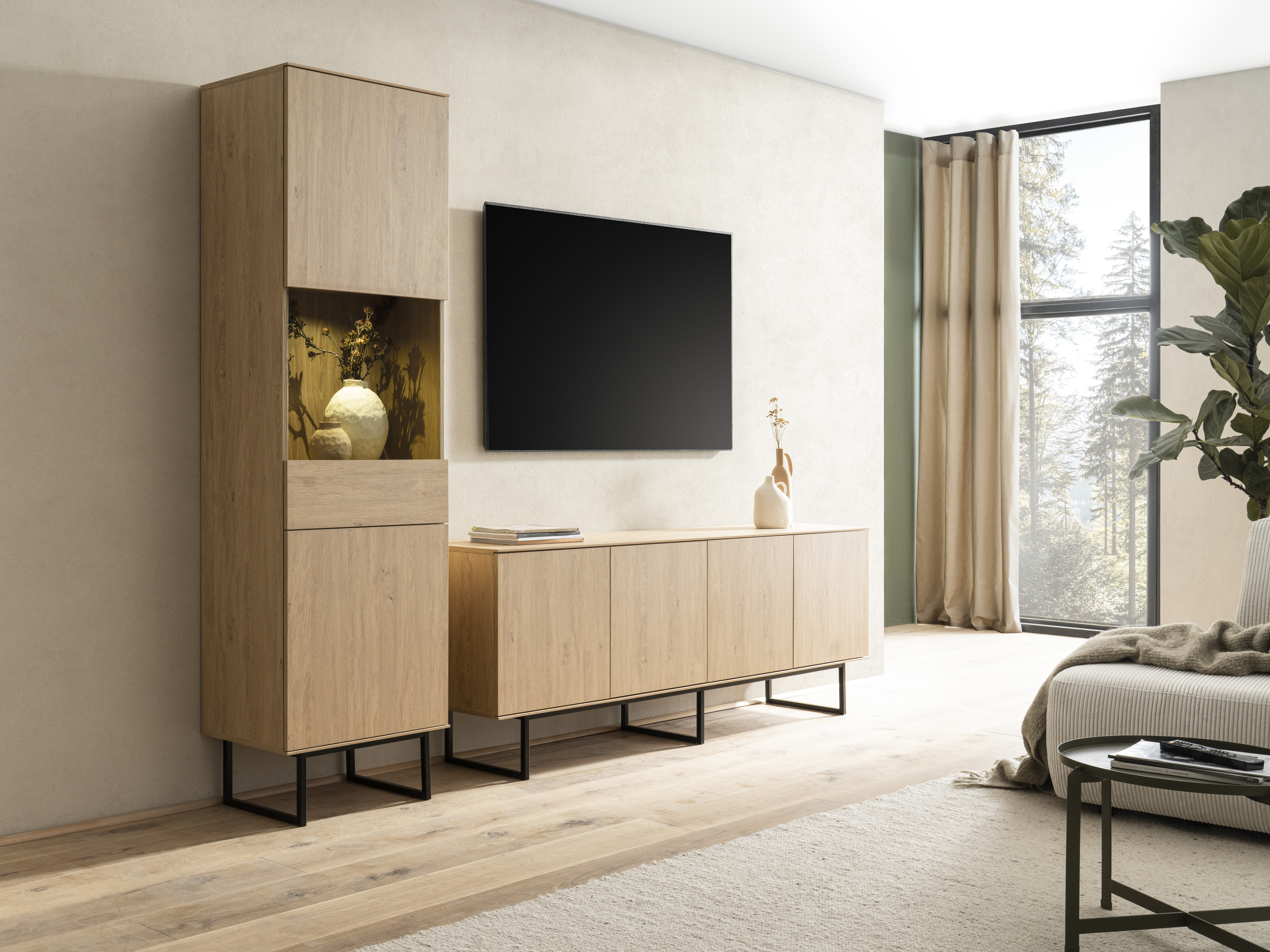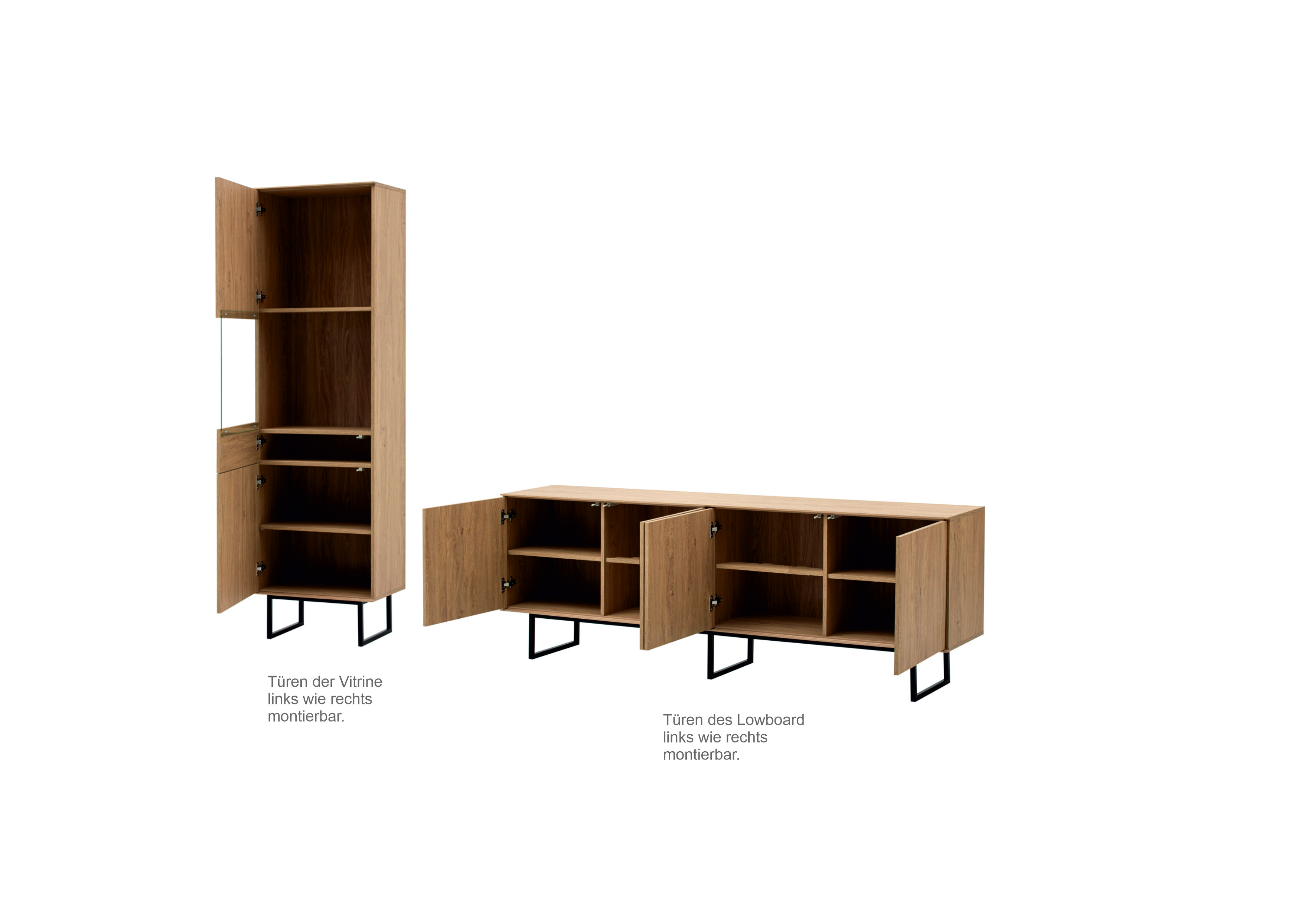 Die zweiteilige Kombination aus Lowboard und Vitrine bietet viel Stauraum für Geschirr, Bücher, Mediengeräte und Dekoration.