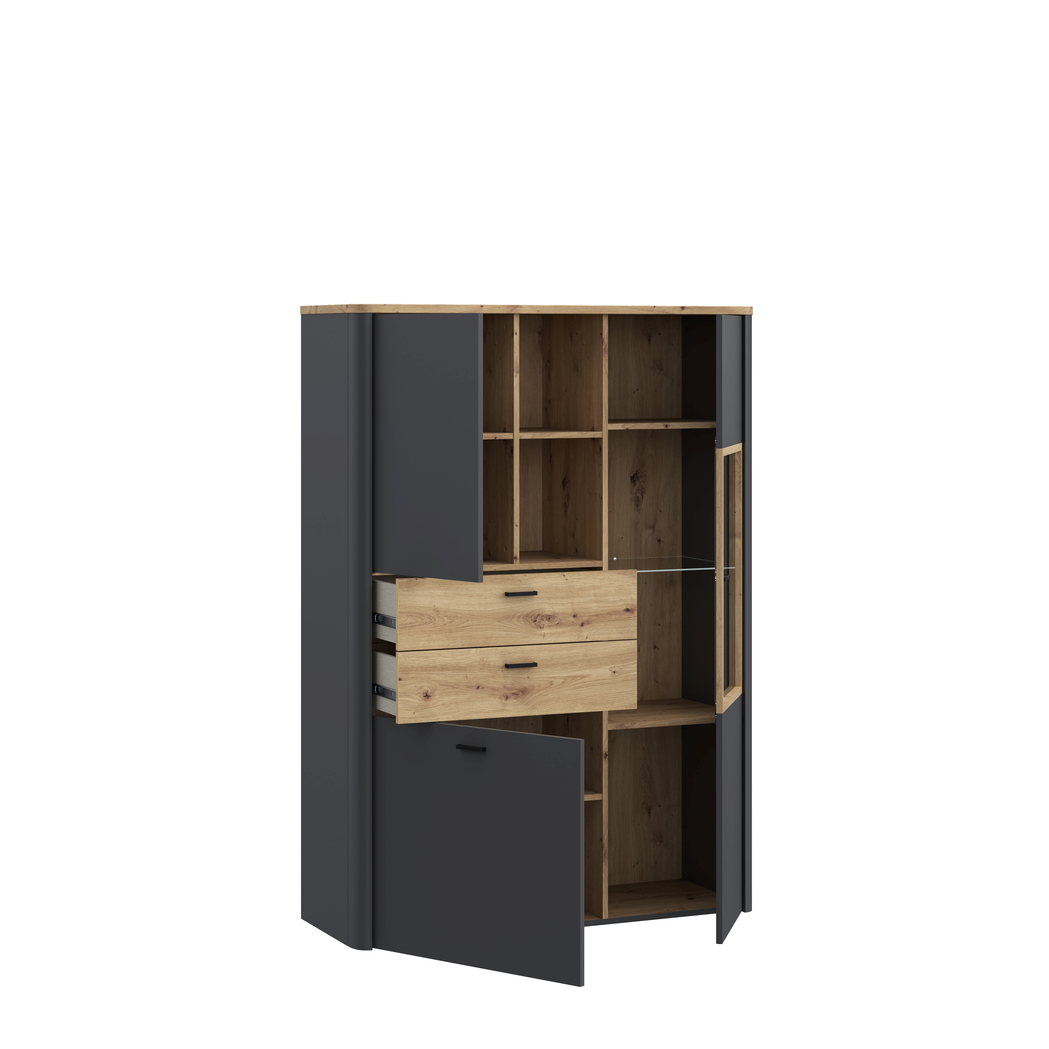 1 Vitrine mit 3 Türen (davon 1 Tür mit Glas), 2 Schubkästen, 2 offene Fächer