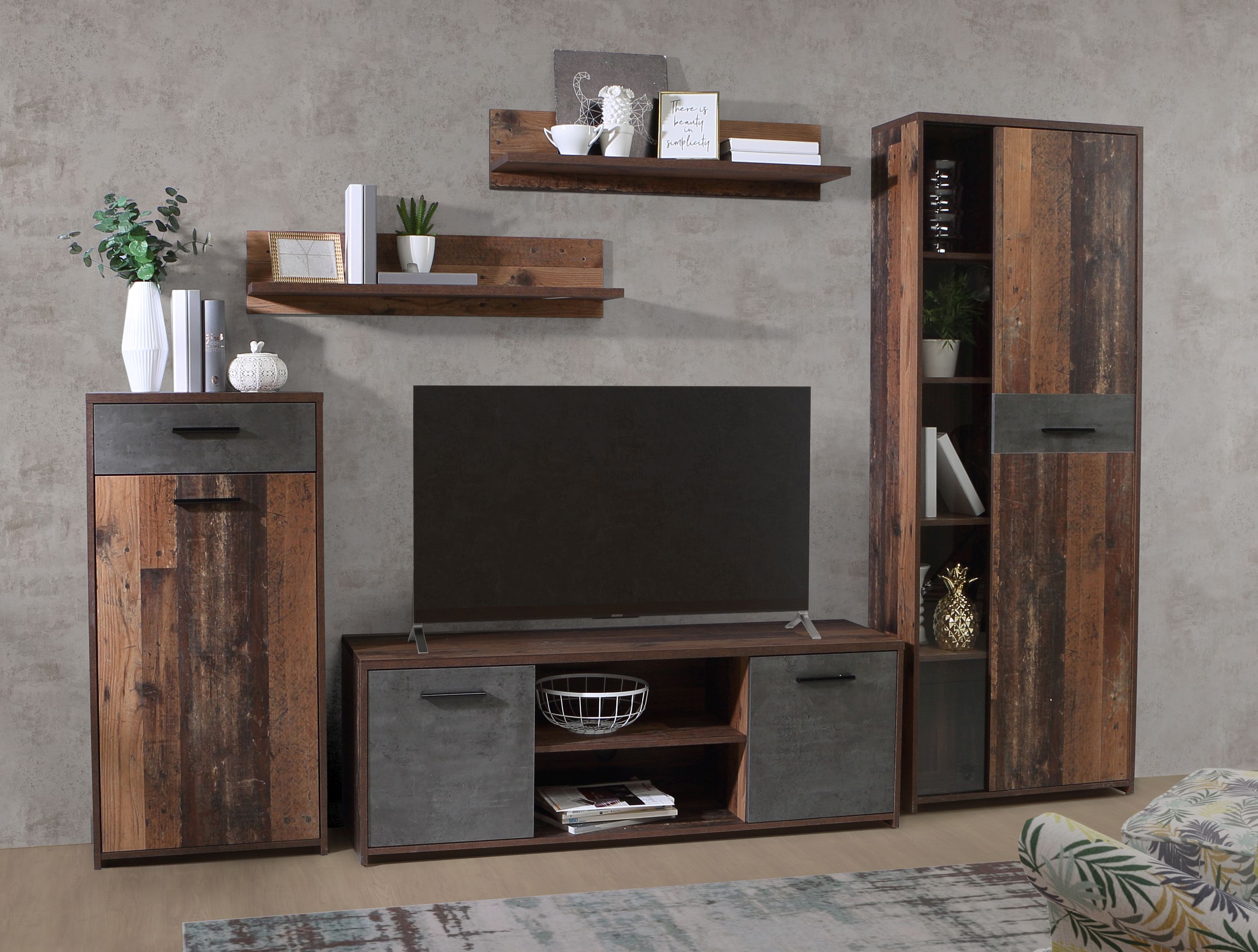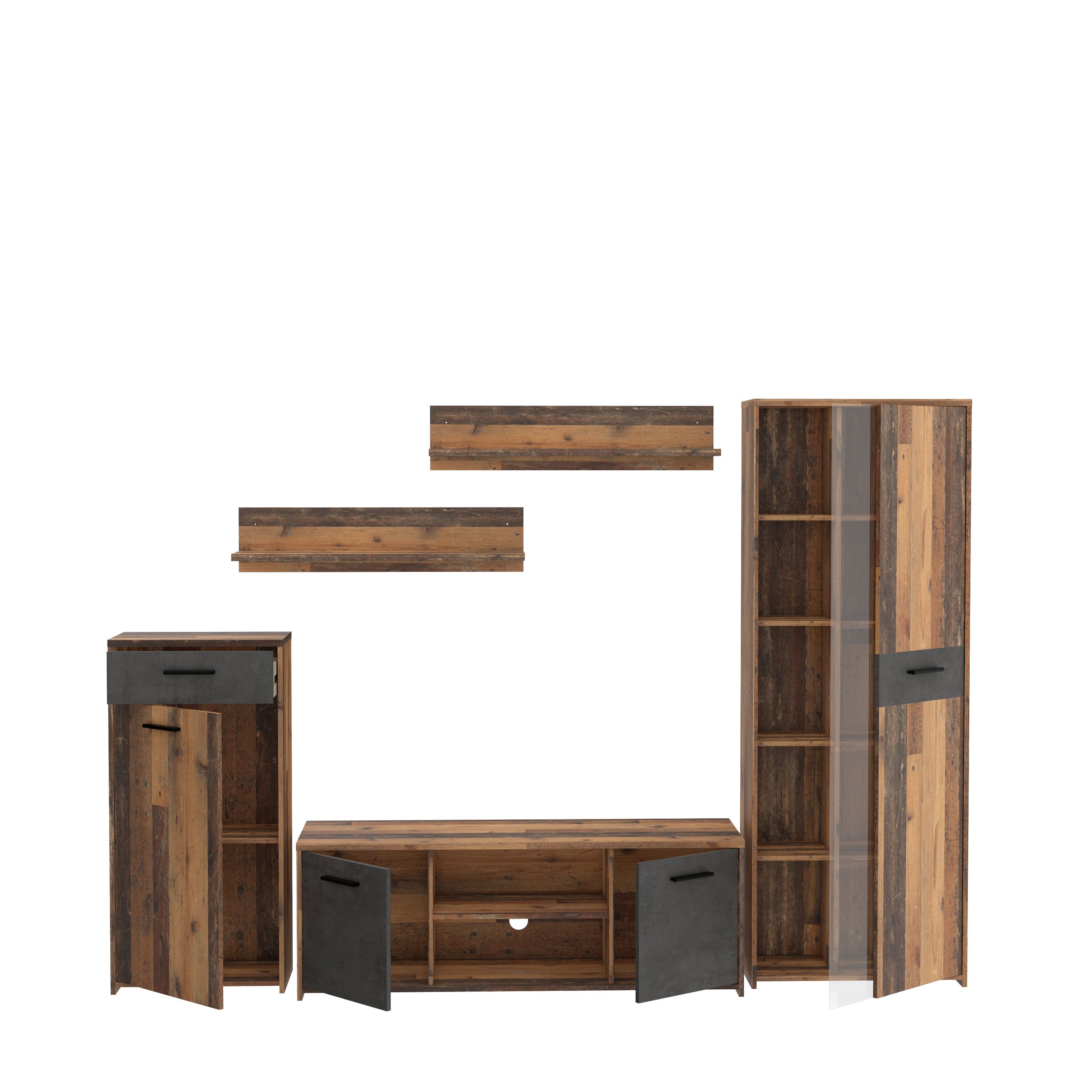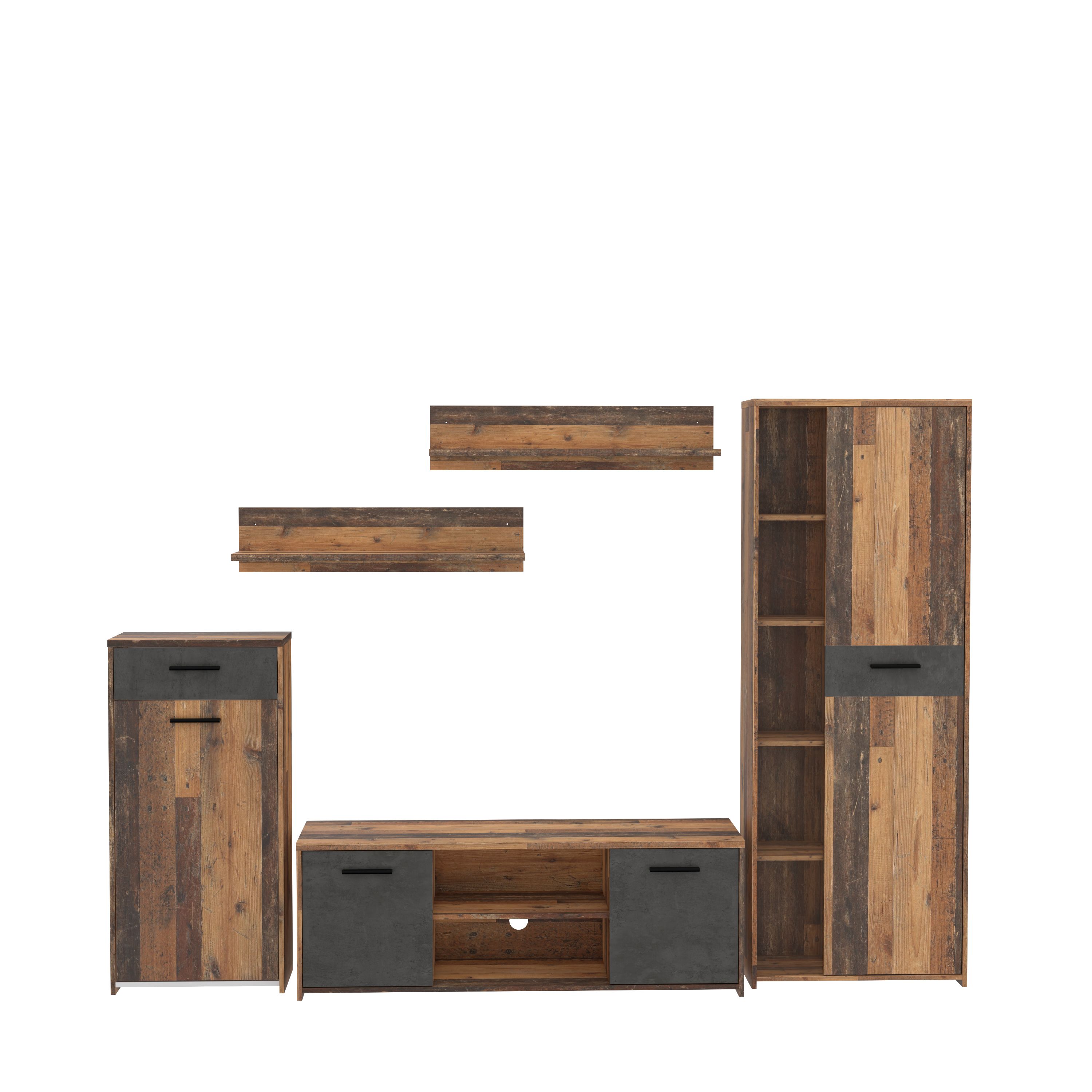 Front und Korpus: Old Wood Vintage Holznachbildung kombiniert mit Absetzungen in Concrete Optik Dark Gray