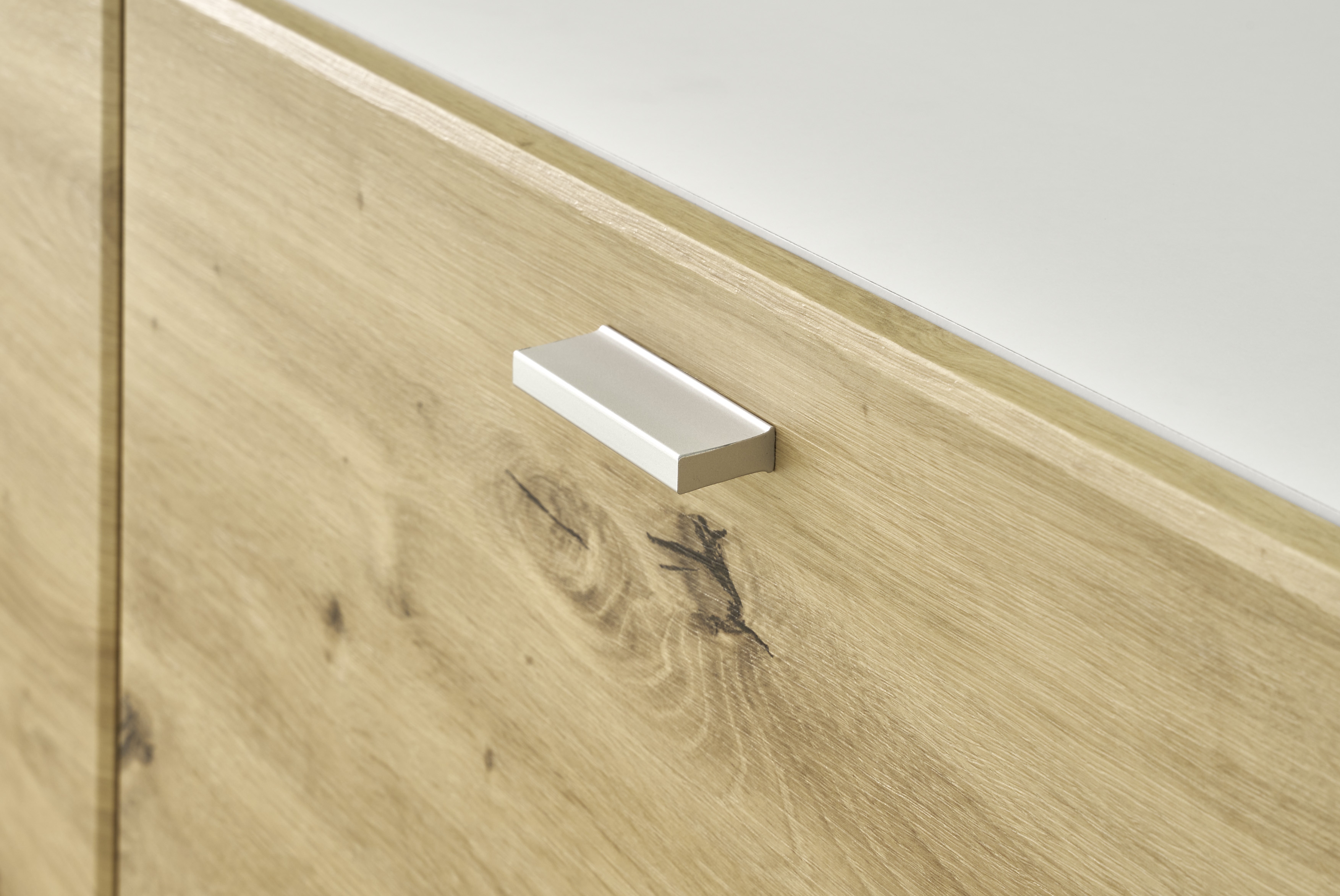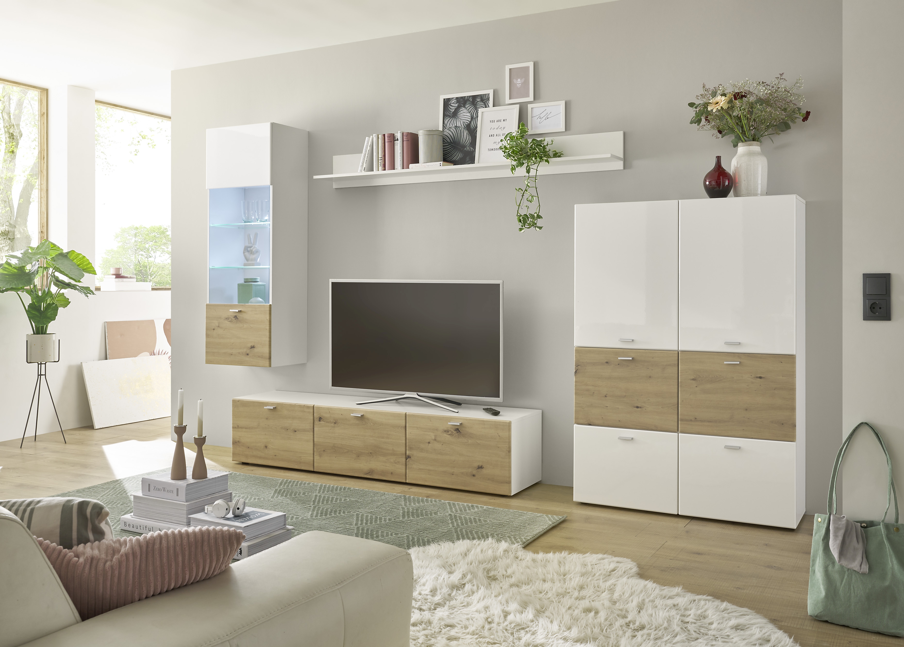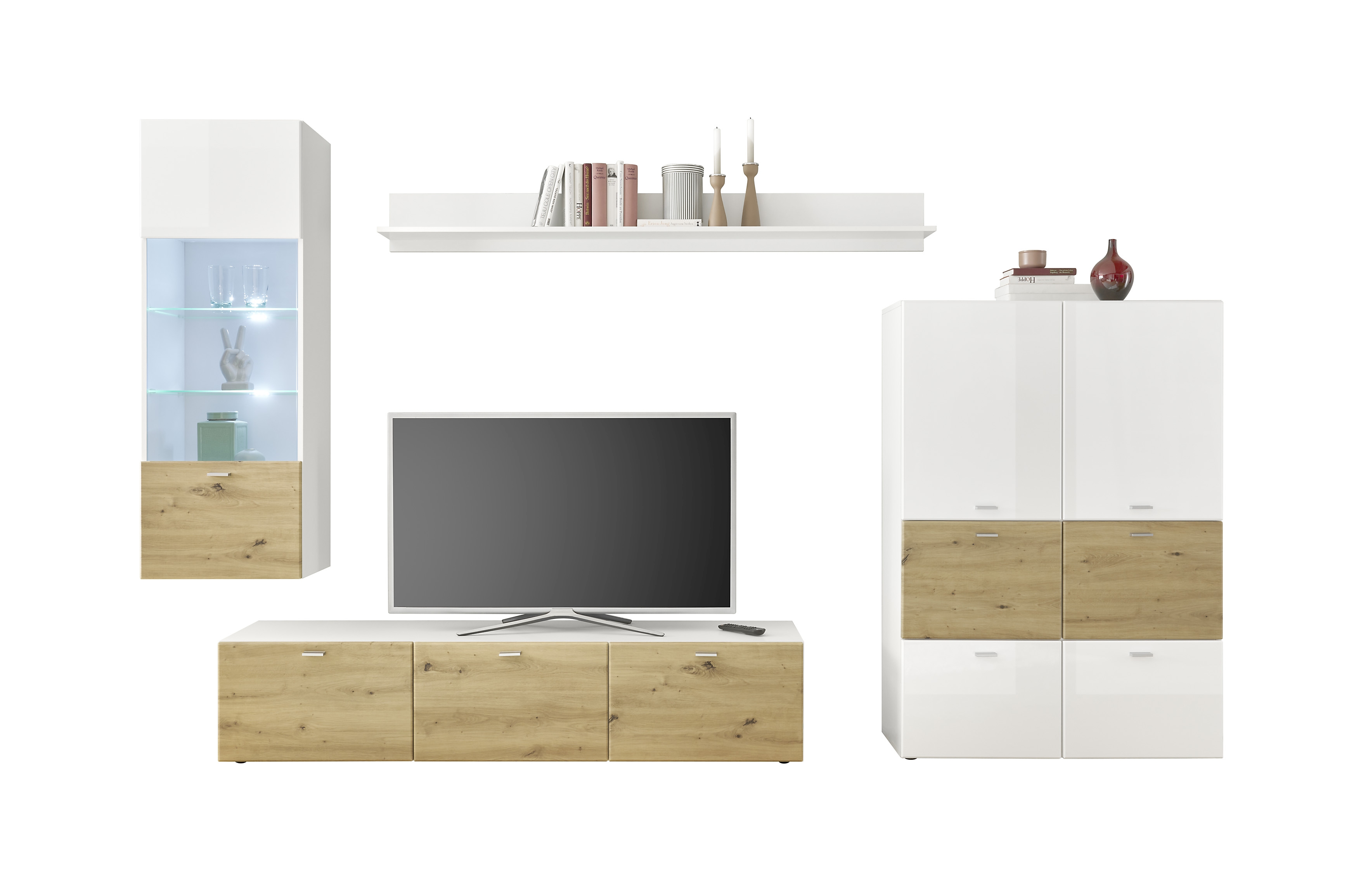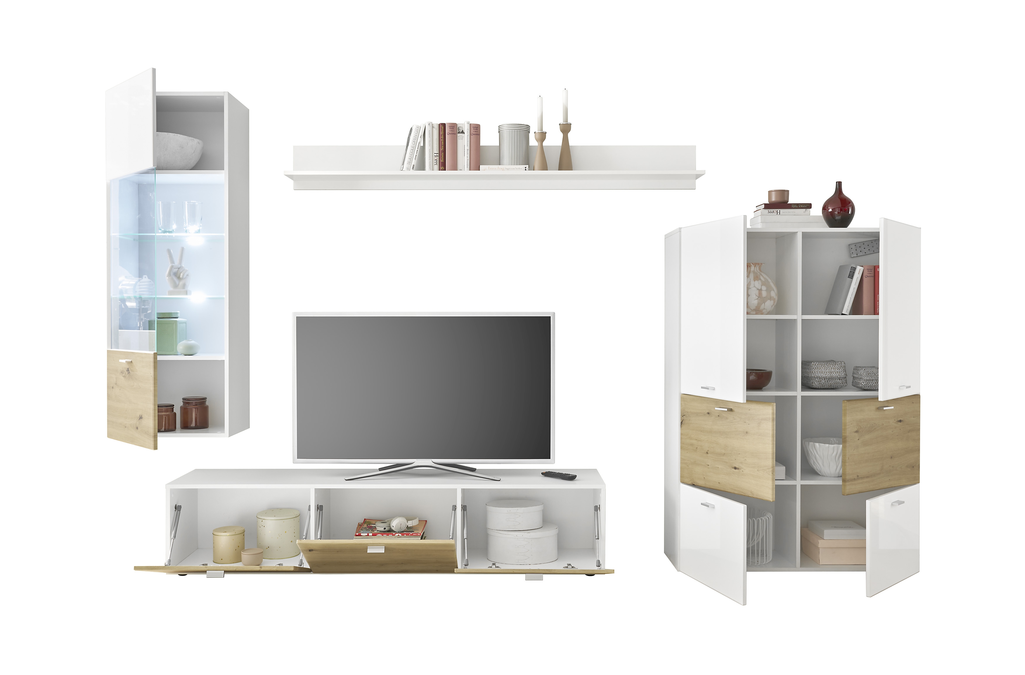Front: MDF (MitteldichteHolzfaserplatte) in Weiß Hochglanz tiefzieh mit Absetzungen in Artisan Eiche Holznachbildung
