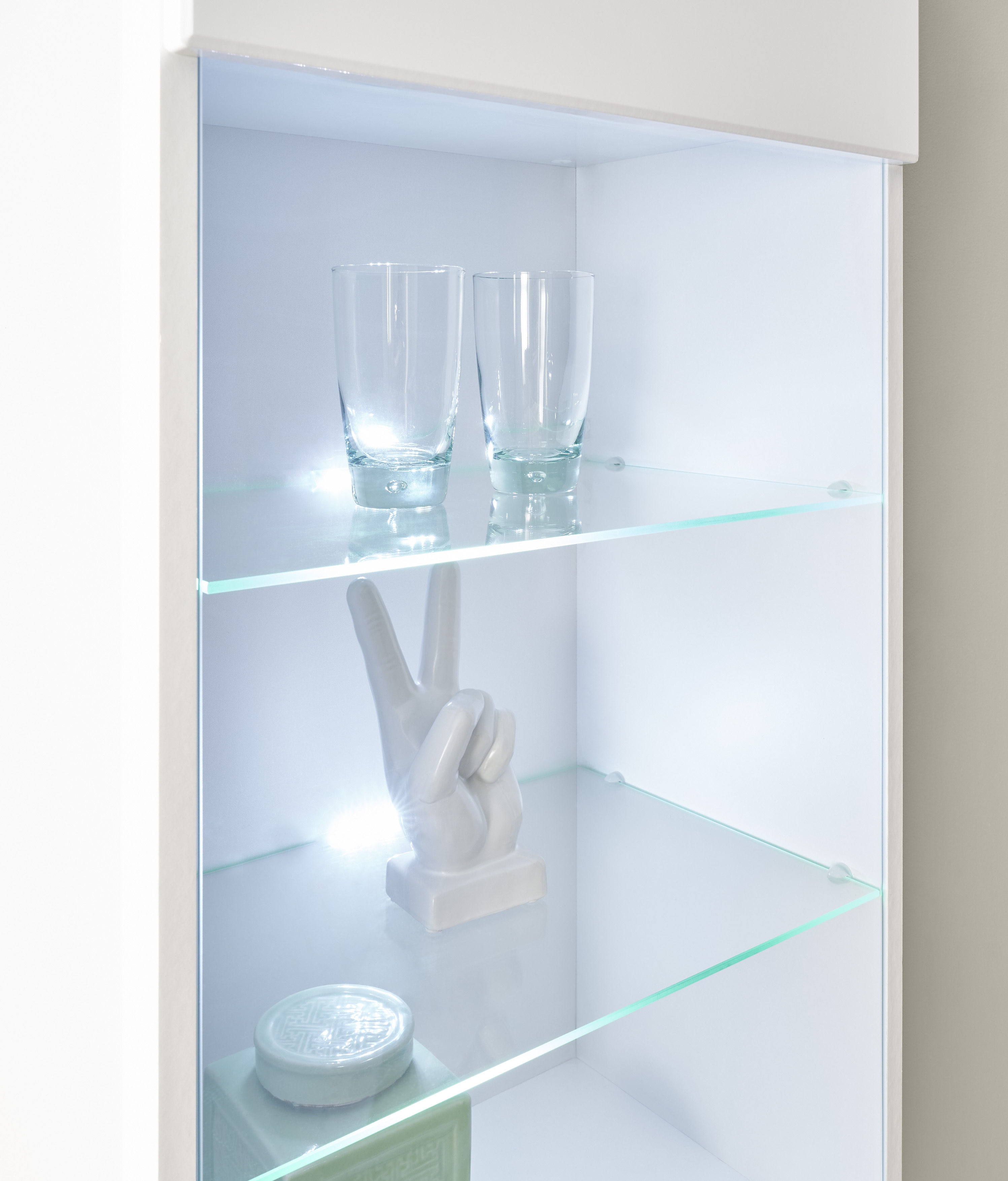 1 Hängvitrine mit 1 Glas-/Holztür, 2 Holzböden und 2 Glasböden, inklusive Beleuchtung