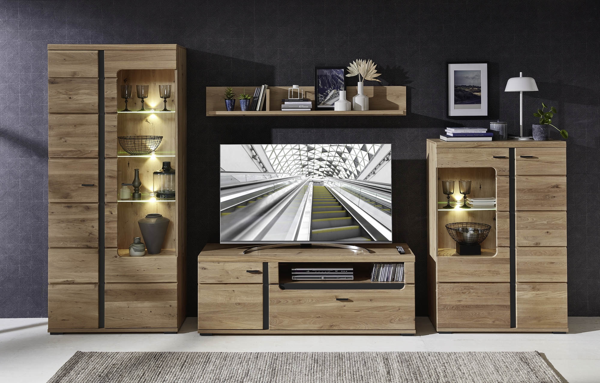 1 Vitrine mit 1 Holztür, 1 Glas-/Holztür, 5 Holzböden und 3 Glasböden inklusive LED-Beleuchtung
