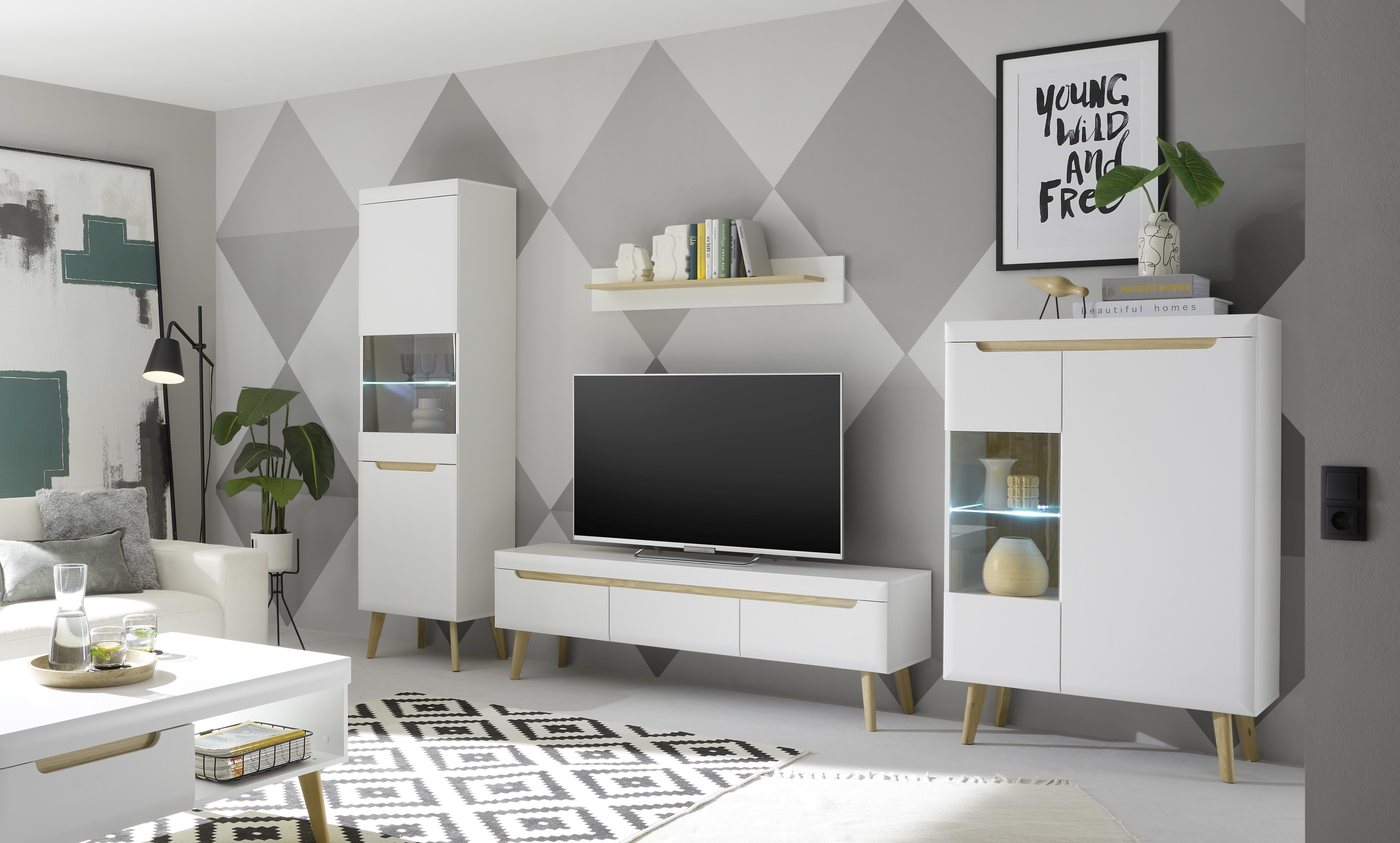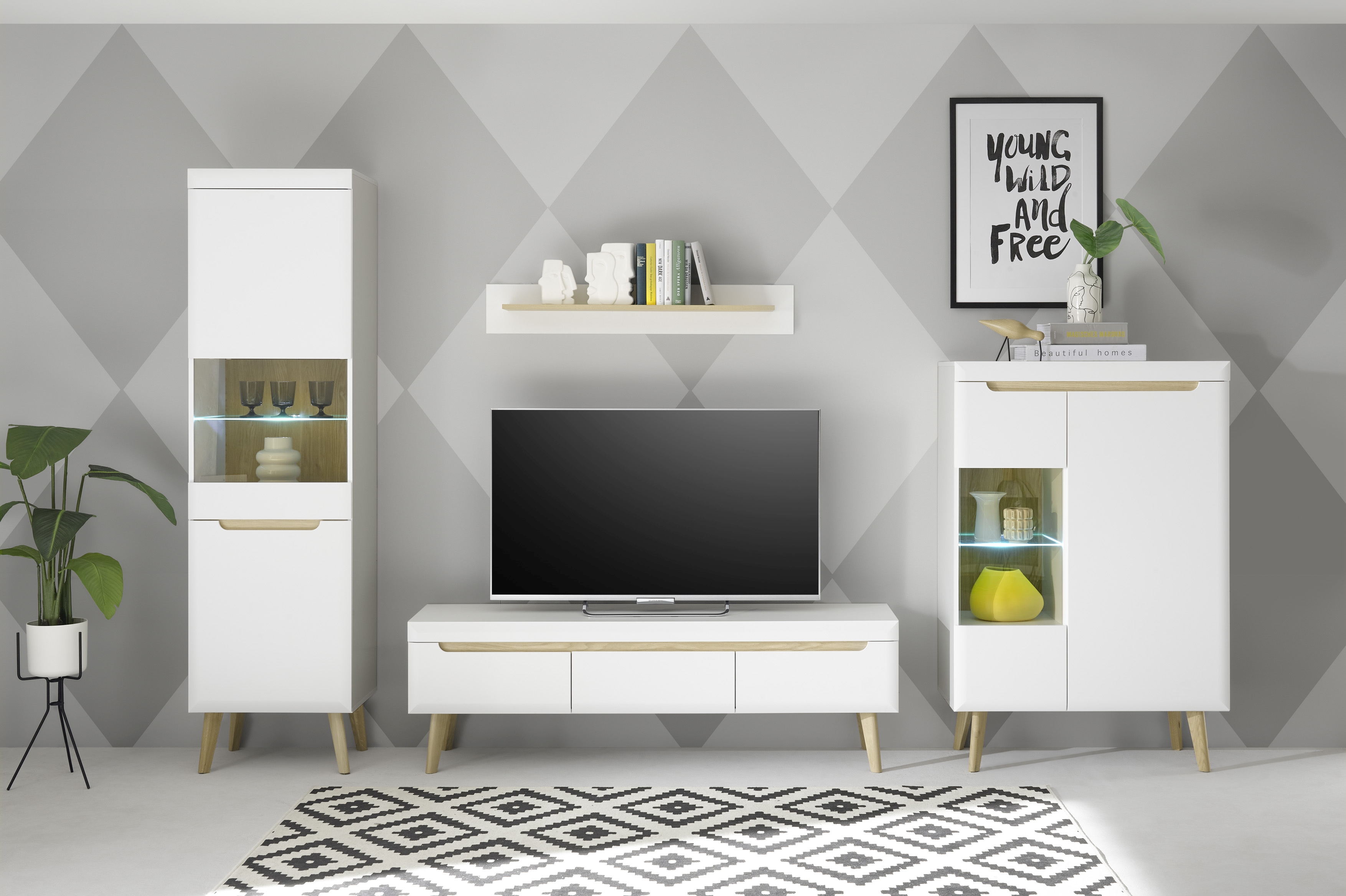 1 Highboardvitrine mit 1 Tür mit Glasausschnitt, 1 Tür, 1 Glasboden und 4 Böden