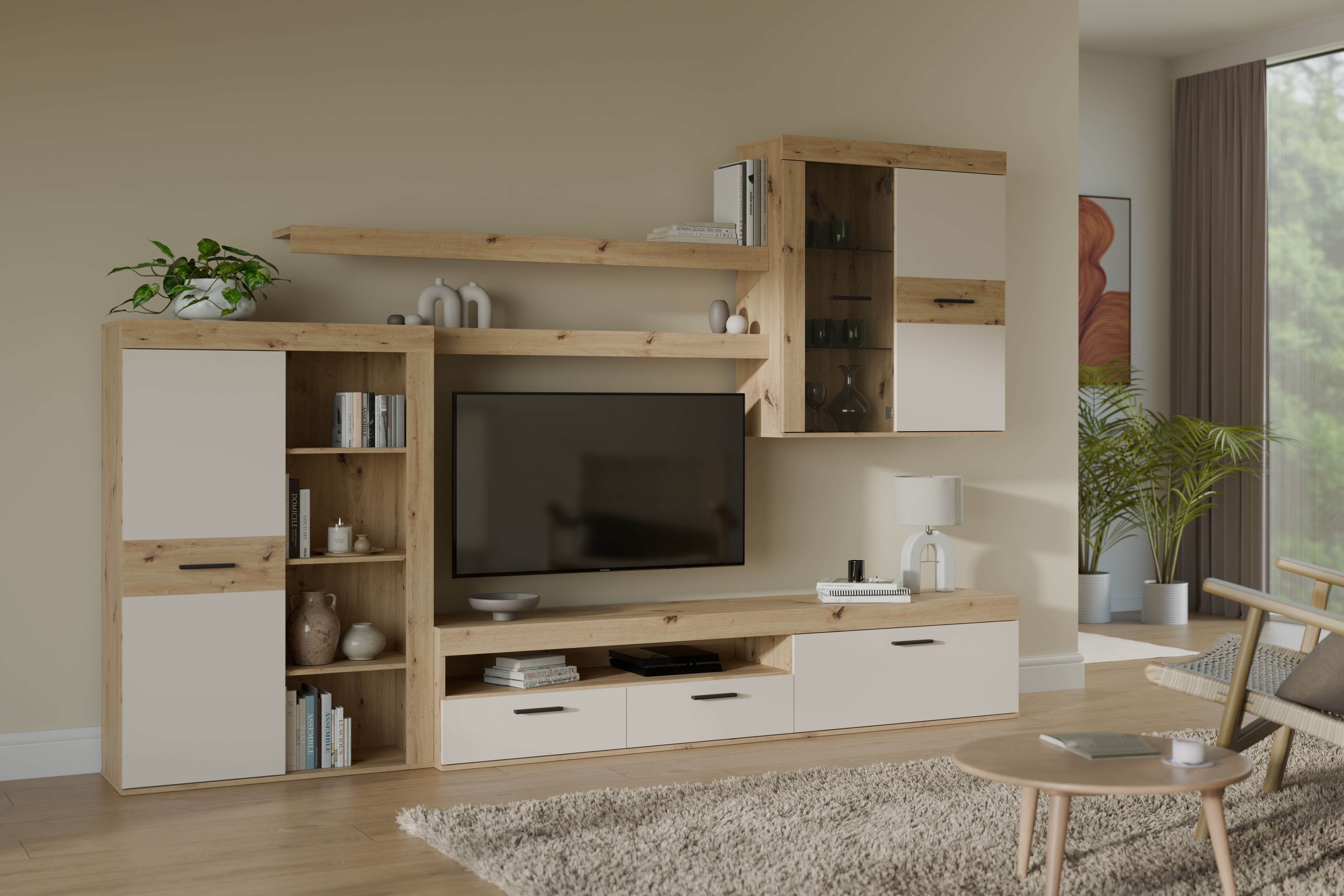 Front: Sand Holznachbildung kombiniert mit Absetzungen in Artisan Eiche Holznachbildung