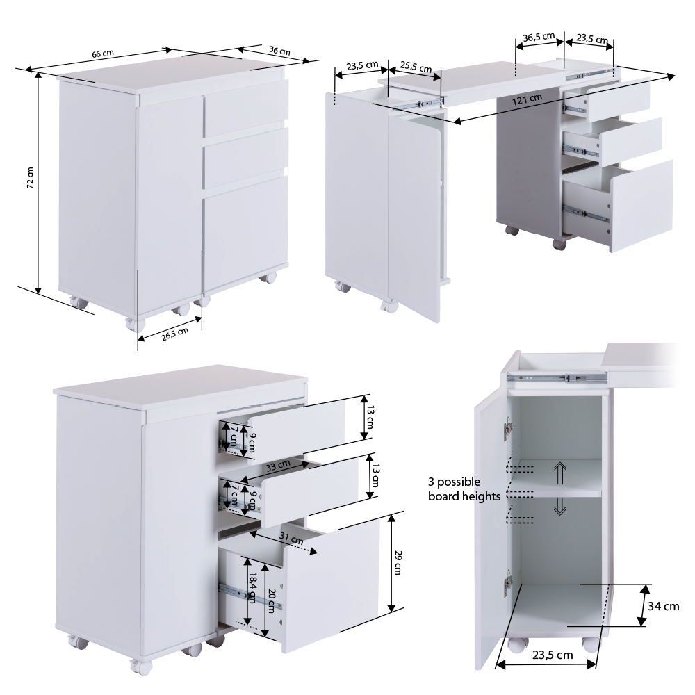 Im geschlossenen Zustand misst der Tisch nur 66 cm, während er auf 121 cm verlängert werden kann, wenn Sie ihn für größere Aufgaben oder als Arbeitsbereich benötigen.