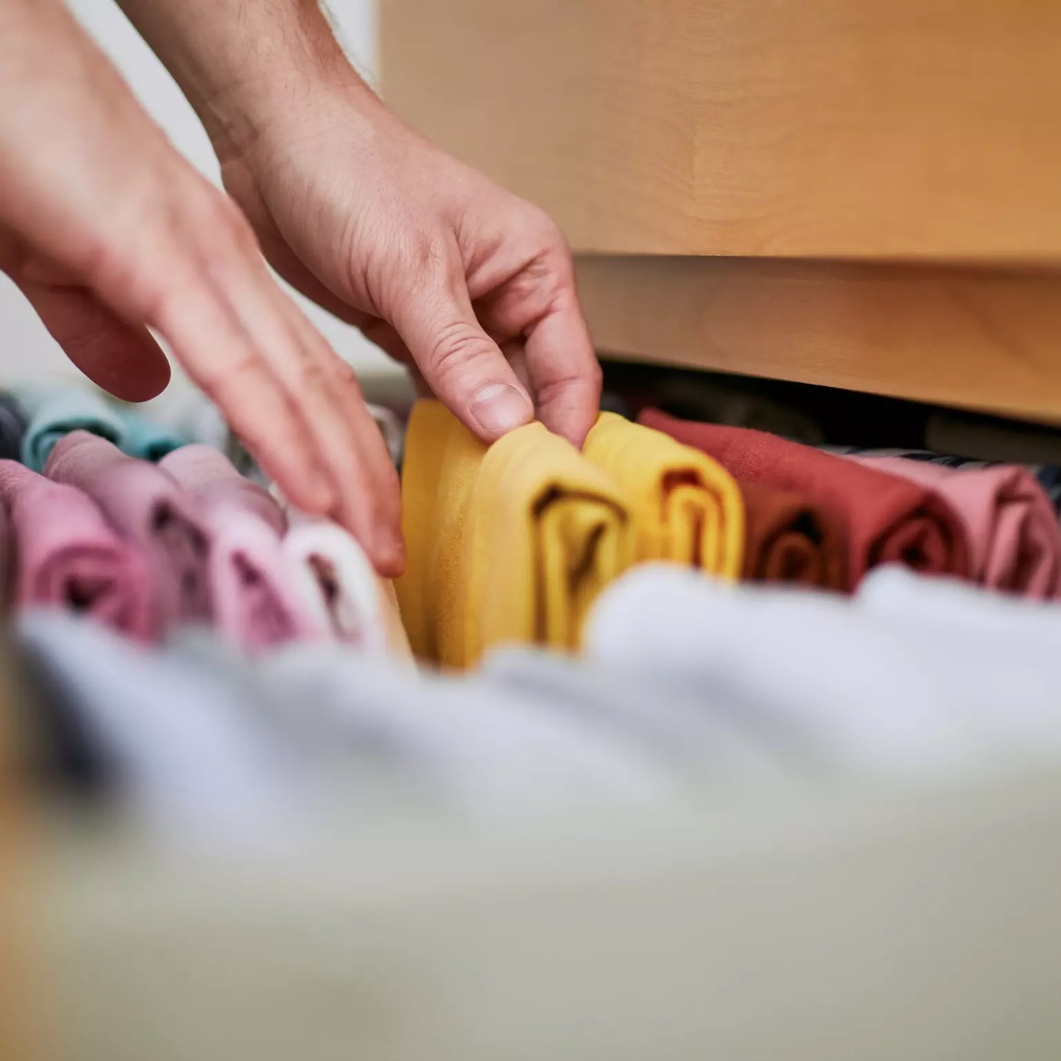Eine Möglichkeit, Ihre Kleidung zu sortieren, ist nach Kleidungsstücken. Sie können zum Beispiel alle T-Shirts auf einen Stapel legen, die Hosen zusammenfalten und Pullover separat aufhängen. So haben Sie die verschiedenen Kleidungsstücke direkt griffbereit und sparen Zeit beim Anziehen.