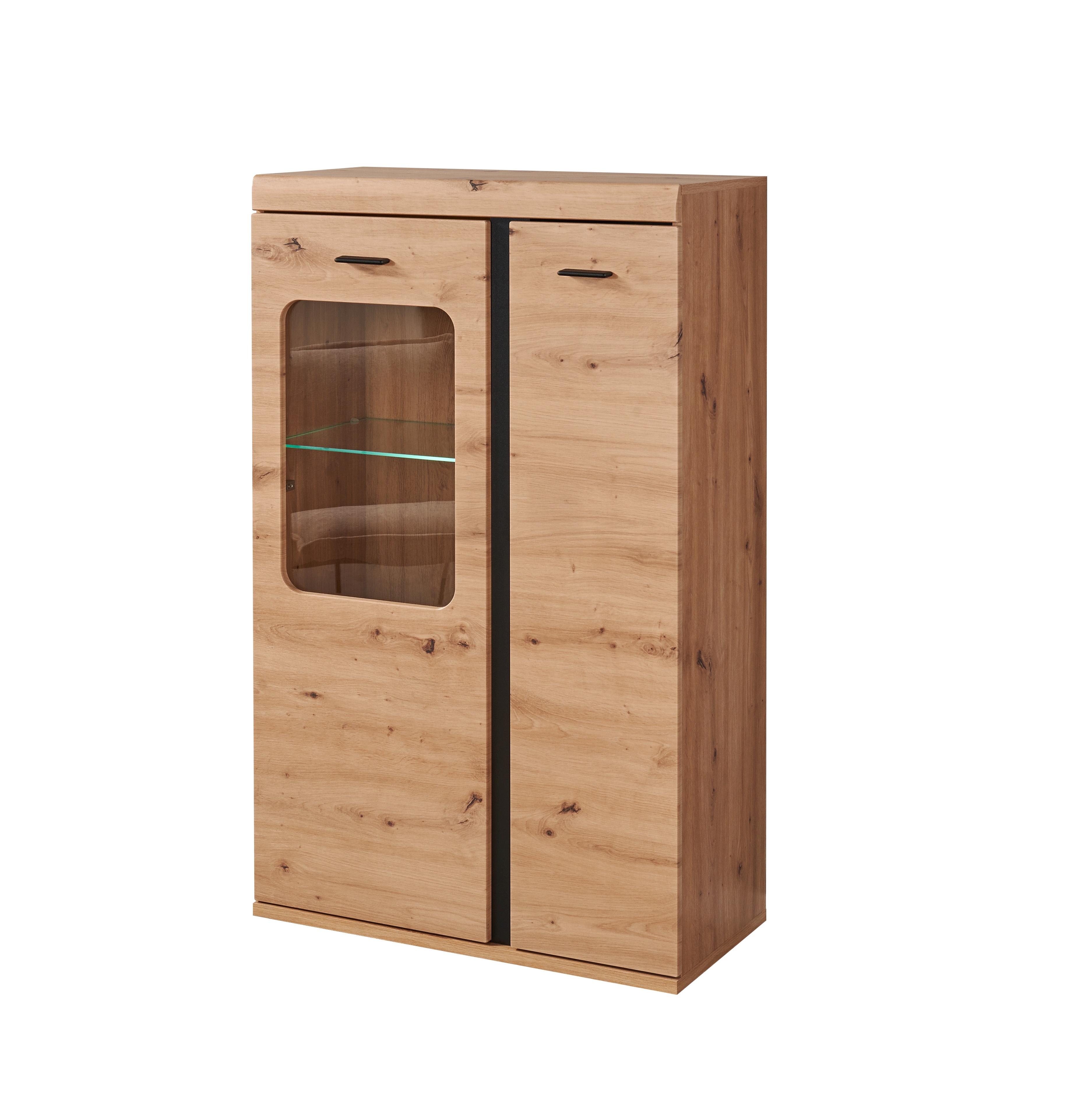 Façade : décor chêne Artisan, MDF (panneau de fibres de bois de densité moyenne) pelliculé avec contrastes ton noir (panneaux de particules mélaminés) / verre
