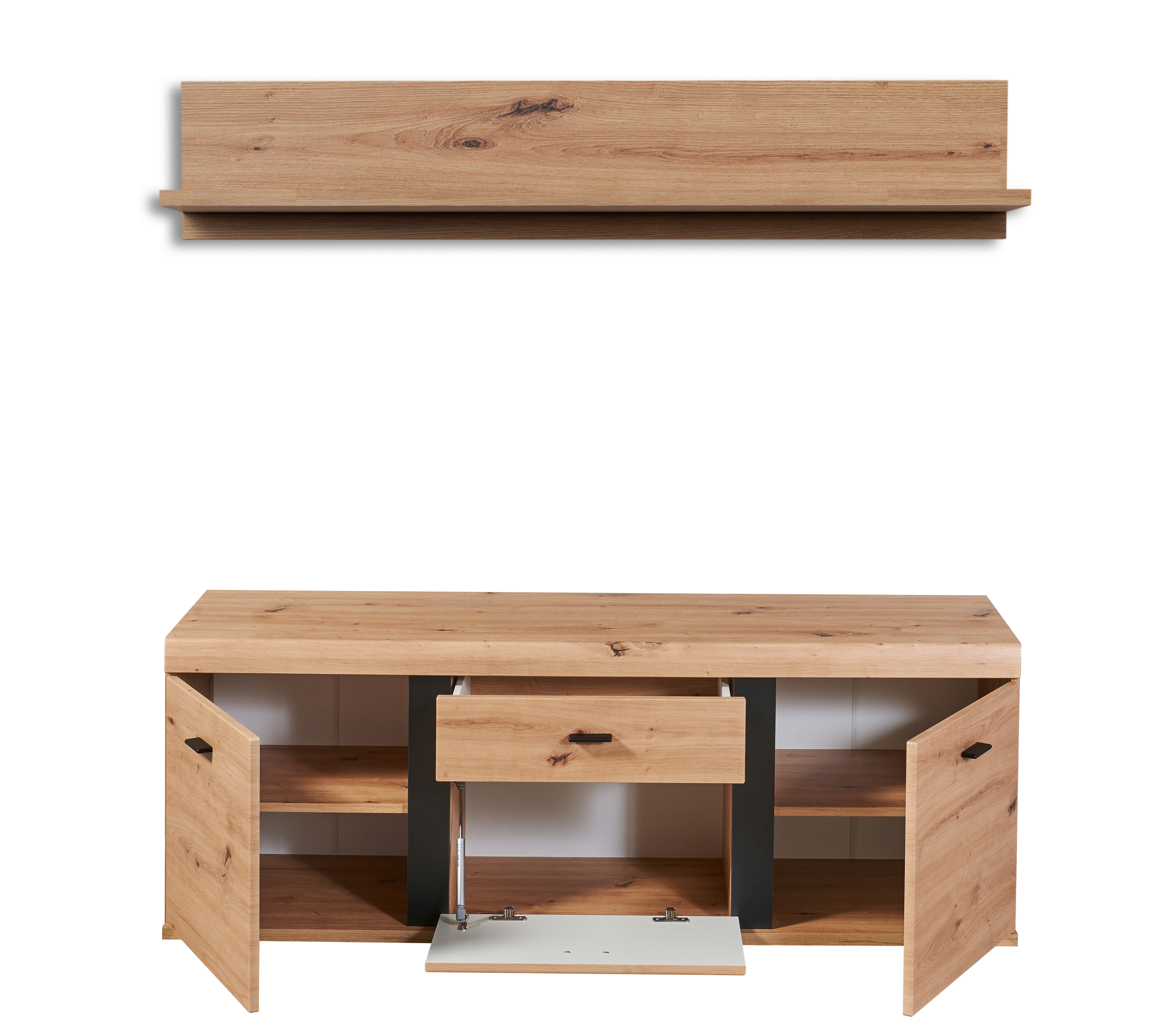 1 banc TV avec 2 portes, 1 abattant, 1 tiroir et 2 tablettes fixes