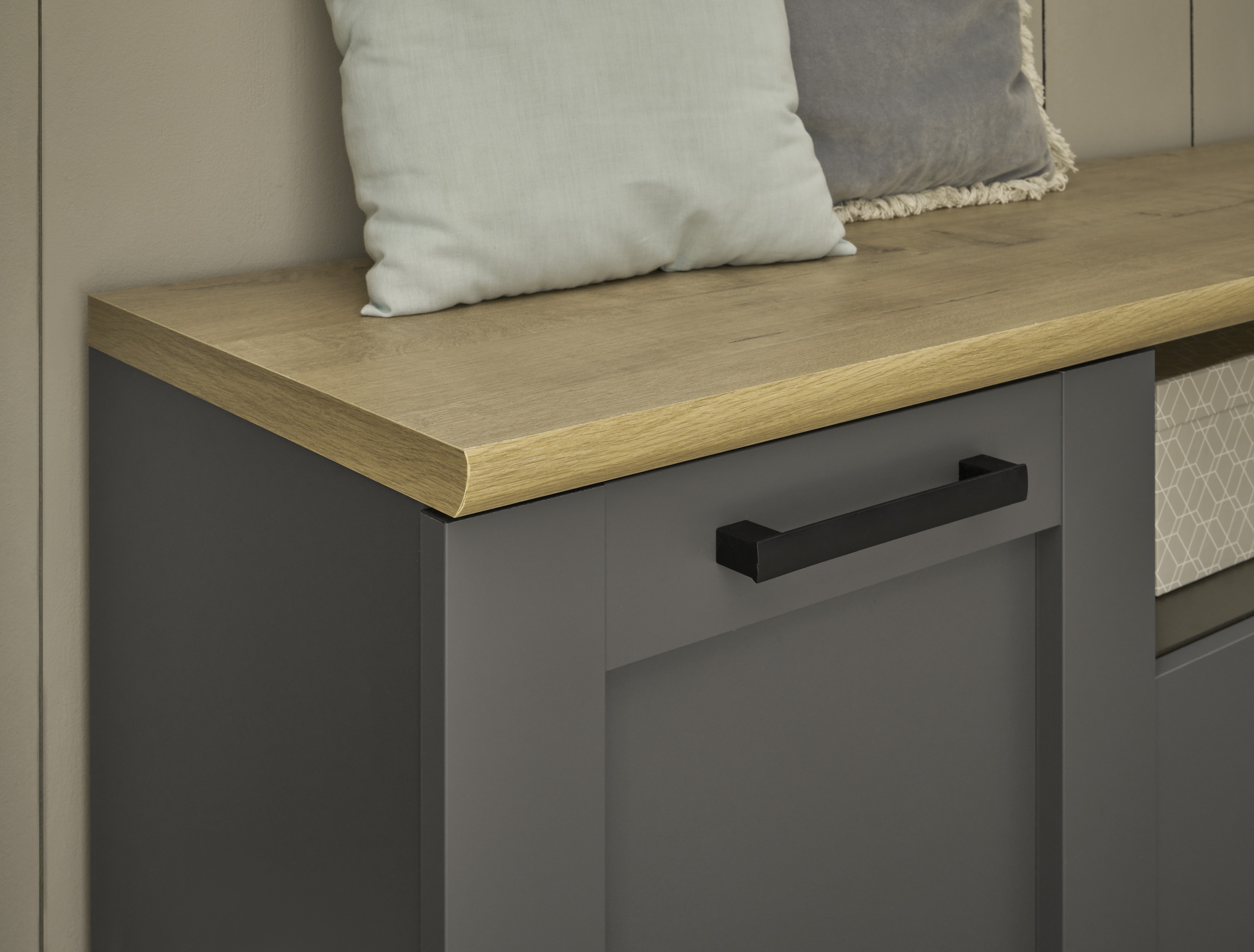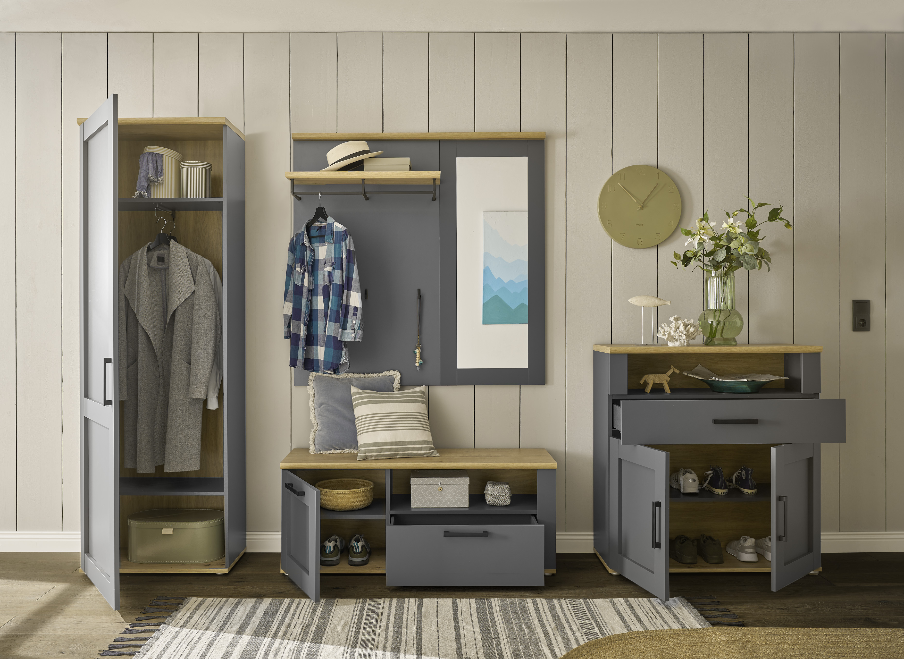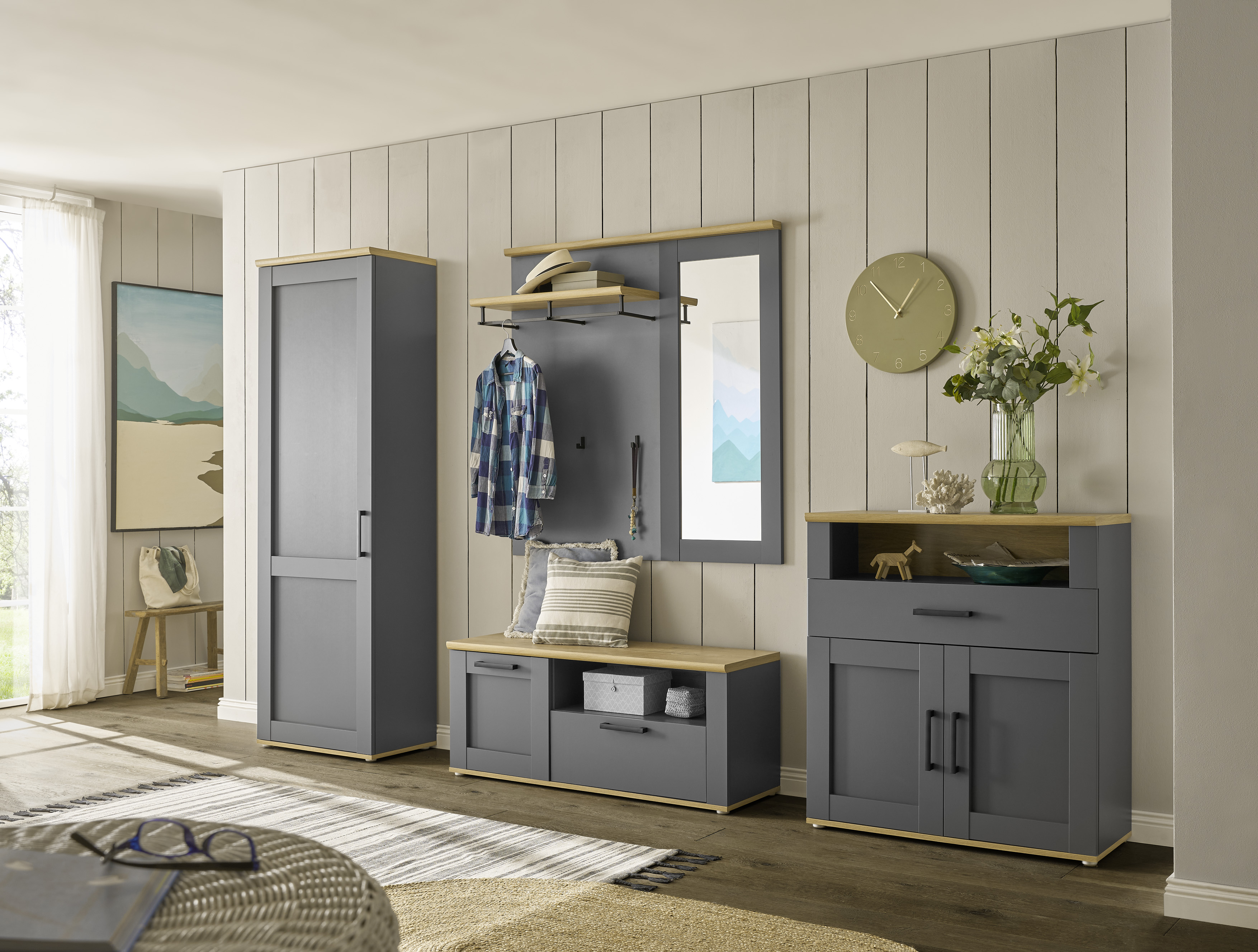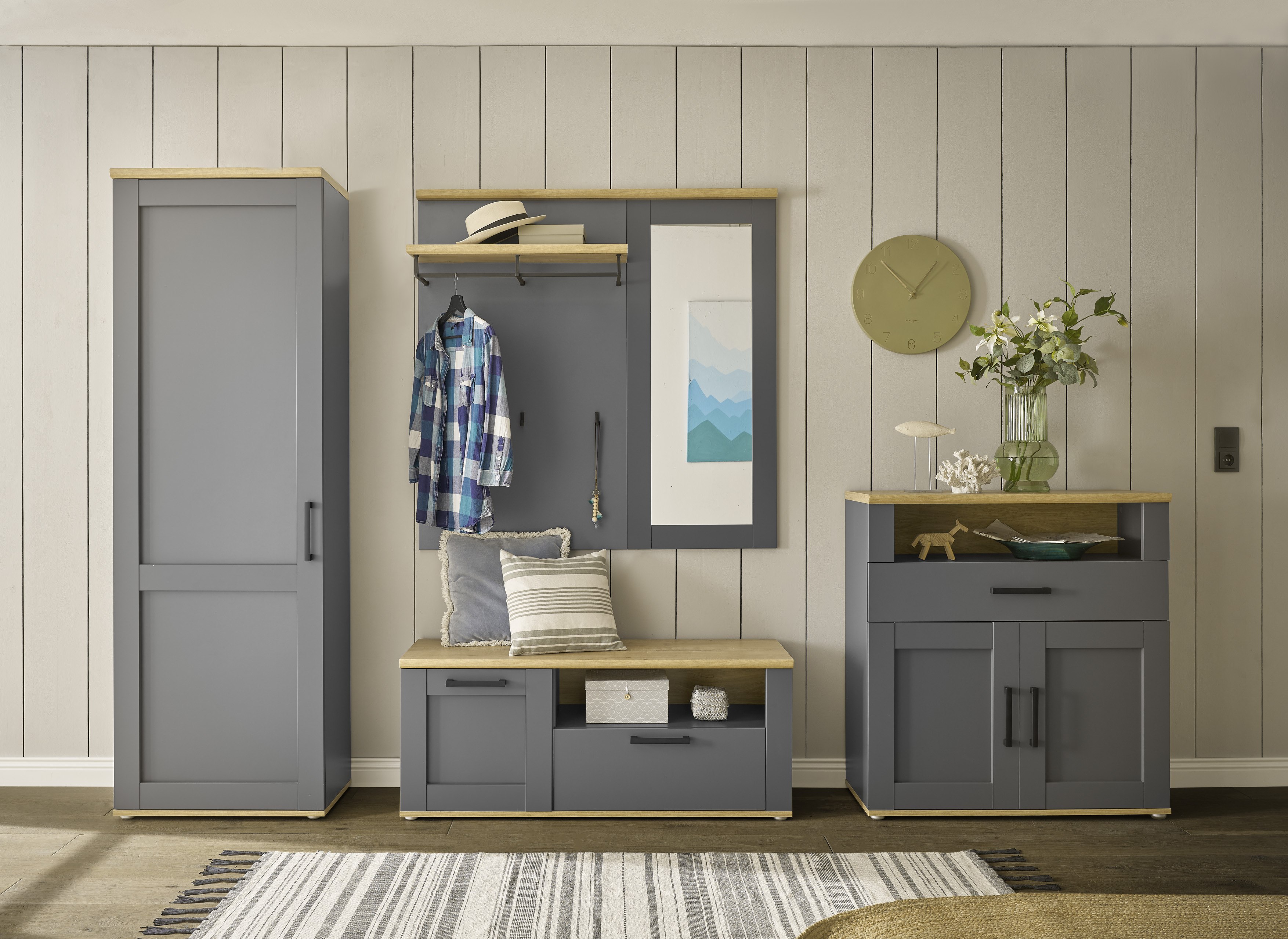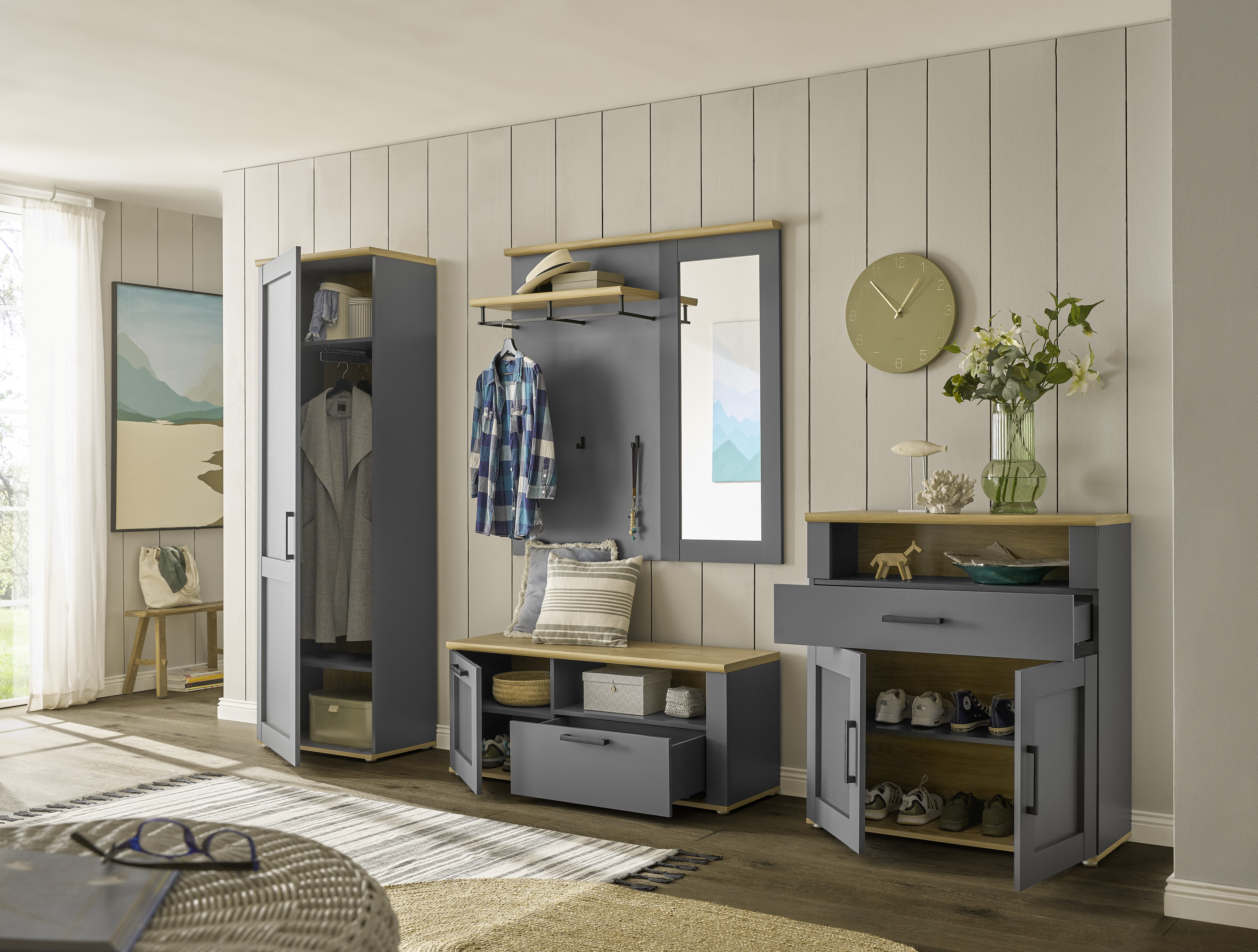 Le vestiaire rencontre l'élégance : l'ensemble vestiaire gris avec imitation chêne Artisan apporte une touche intemporelle à votre couloir, dressing ou bureau tout en garantissant un rangement optimal. Le corps gris est complété par le chêne Artisan chaleureux, les façades en MDF dessinent des lignes claires et les poignées noires accentuent le design.