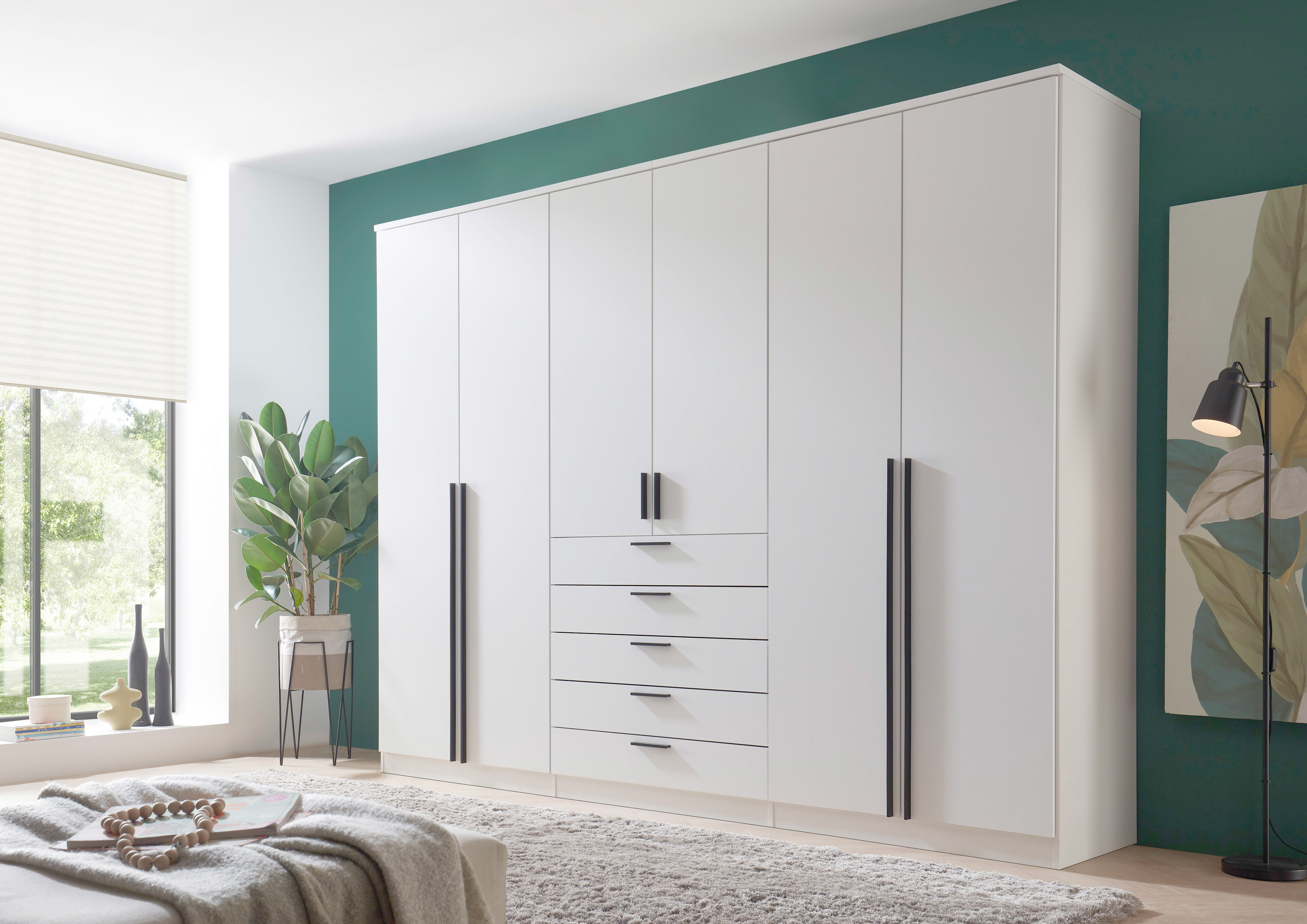 Répartition intérieure : 2 parois médianes ; à gauche et à droite, à chaque fois, 1 tablette et 1 barre de penderie ; au centre : 2 tablettes