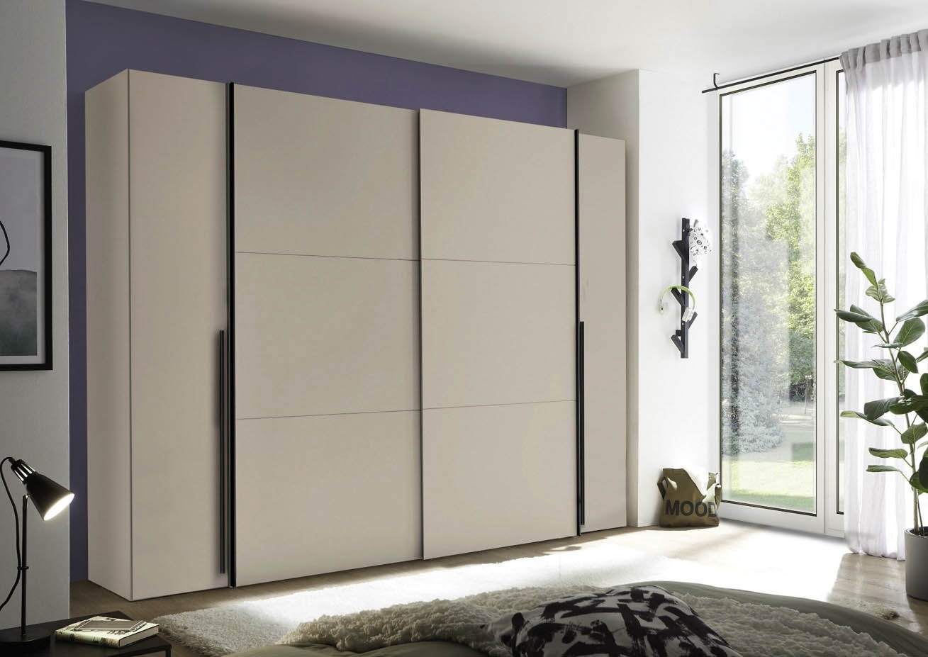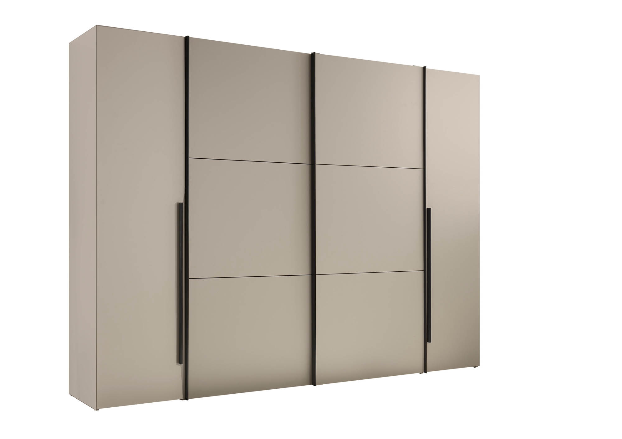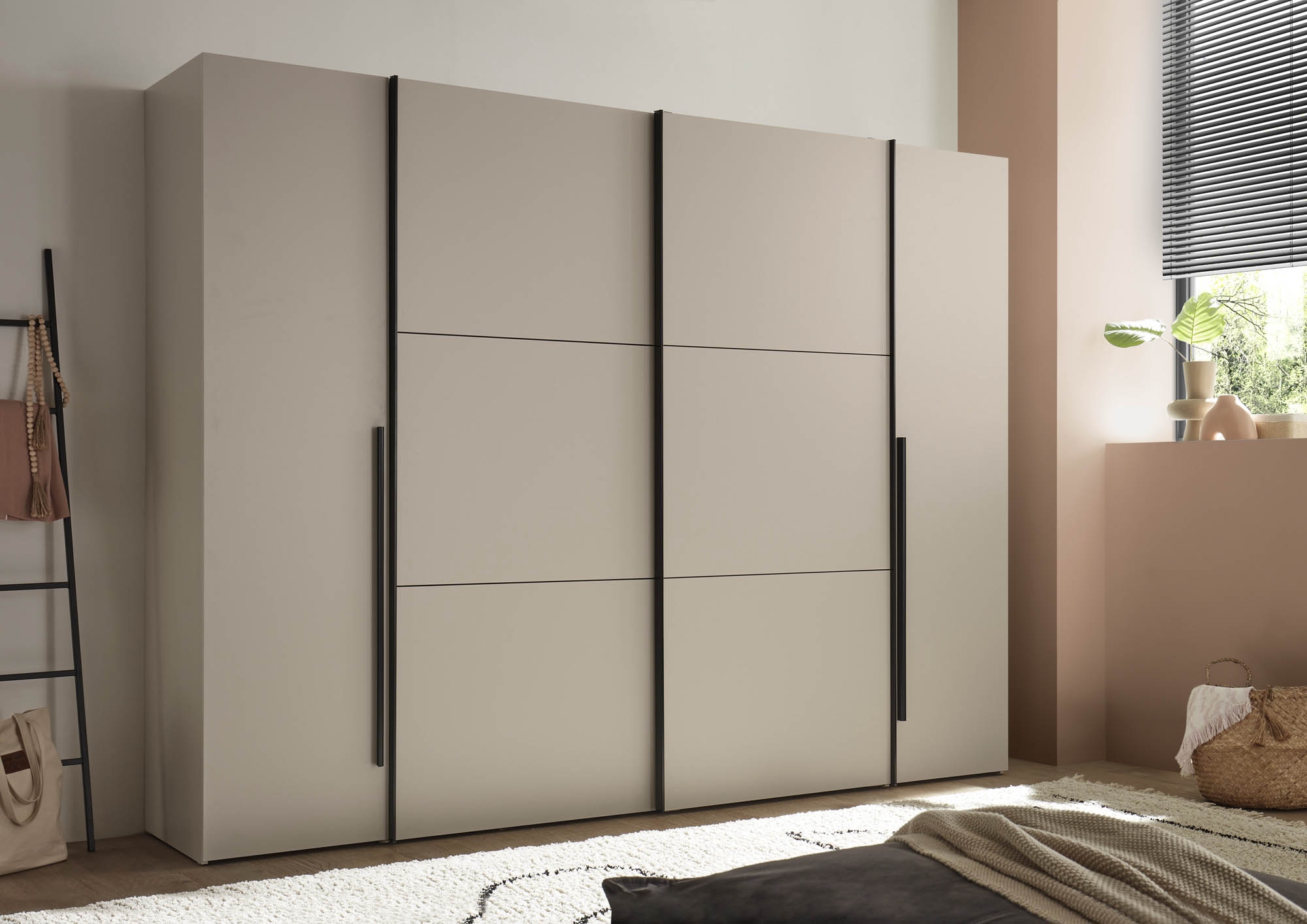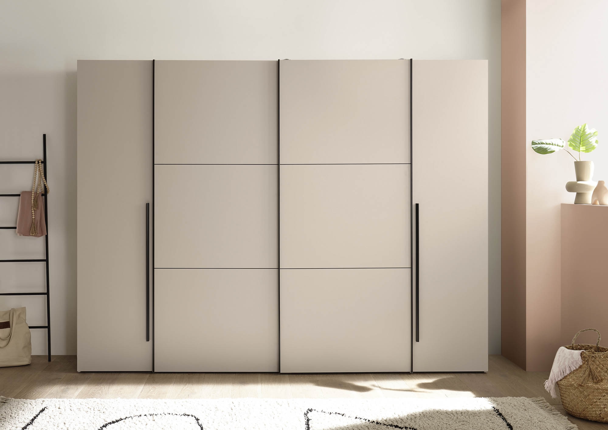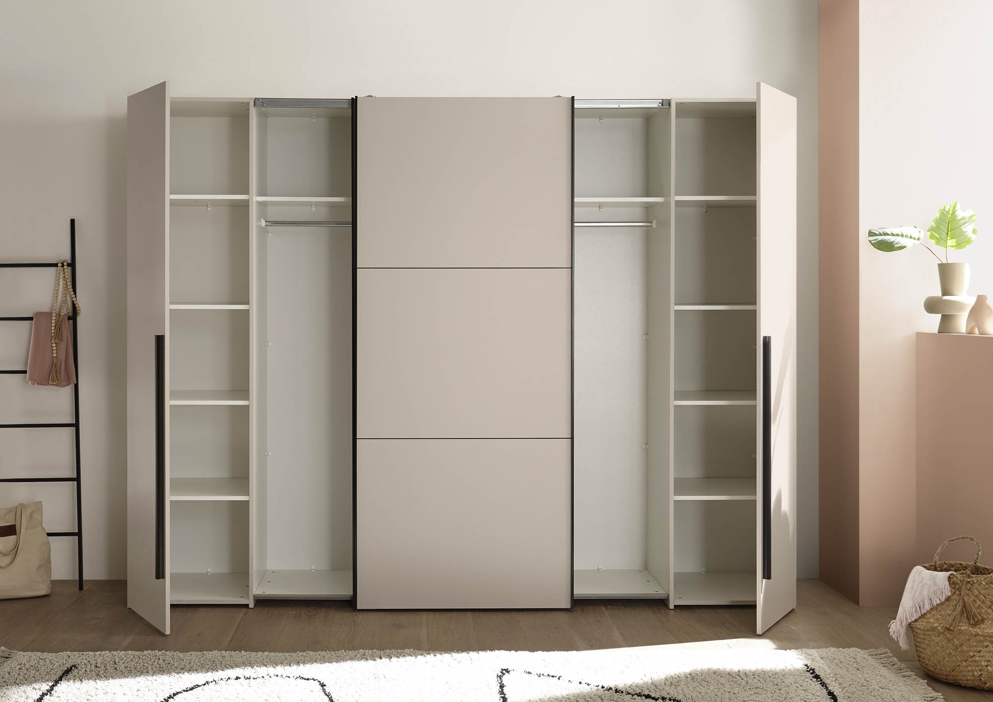 Cette armoire fonctionnelle à portes coulissantes et battantes en cachemire offre un espace de rangement généreux pour les vêtements et le linge. Avec deux portes battantes extérieures et deux portes coulissantes centrales, elle combine des systèmes de portes classiques et modernes en un seul meuble. L'aménagement intérieur bien pensé, avec trois cloisons centrales, plusieurs étagères et deux tringles à vêtements, permet un rangement structuré. La teinte uniforme en cachemire confère un aspect calme et discret et peut être combinée de nombreuses façons. Idéal pour les clients soucieux de leur budget qui recherchent un espace de rangement et une fonctionnalité au quotidien. La livraison est à monter soi-même – instructions et matériel de montage inclus.