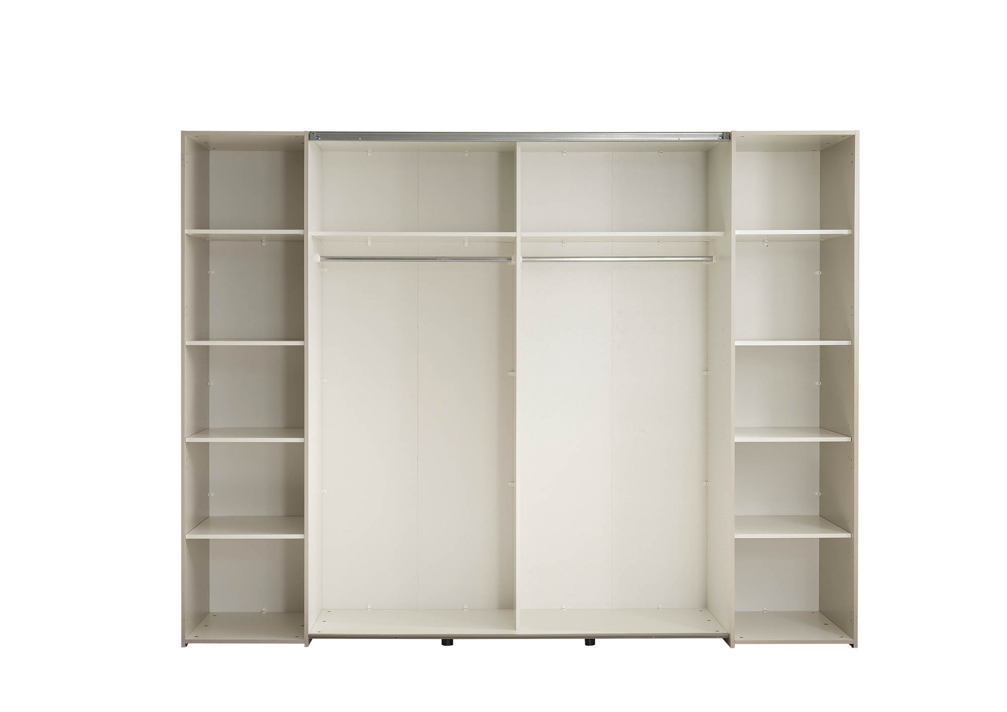 Aménagement intérieur : 3 cloisons centrales ; 4 étagères à gauche et à droite ; 1 étagère et 1 tringle à vêtements au centre