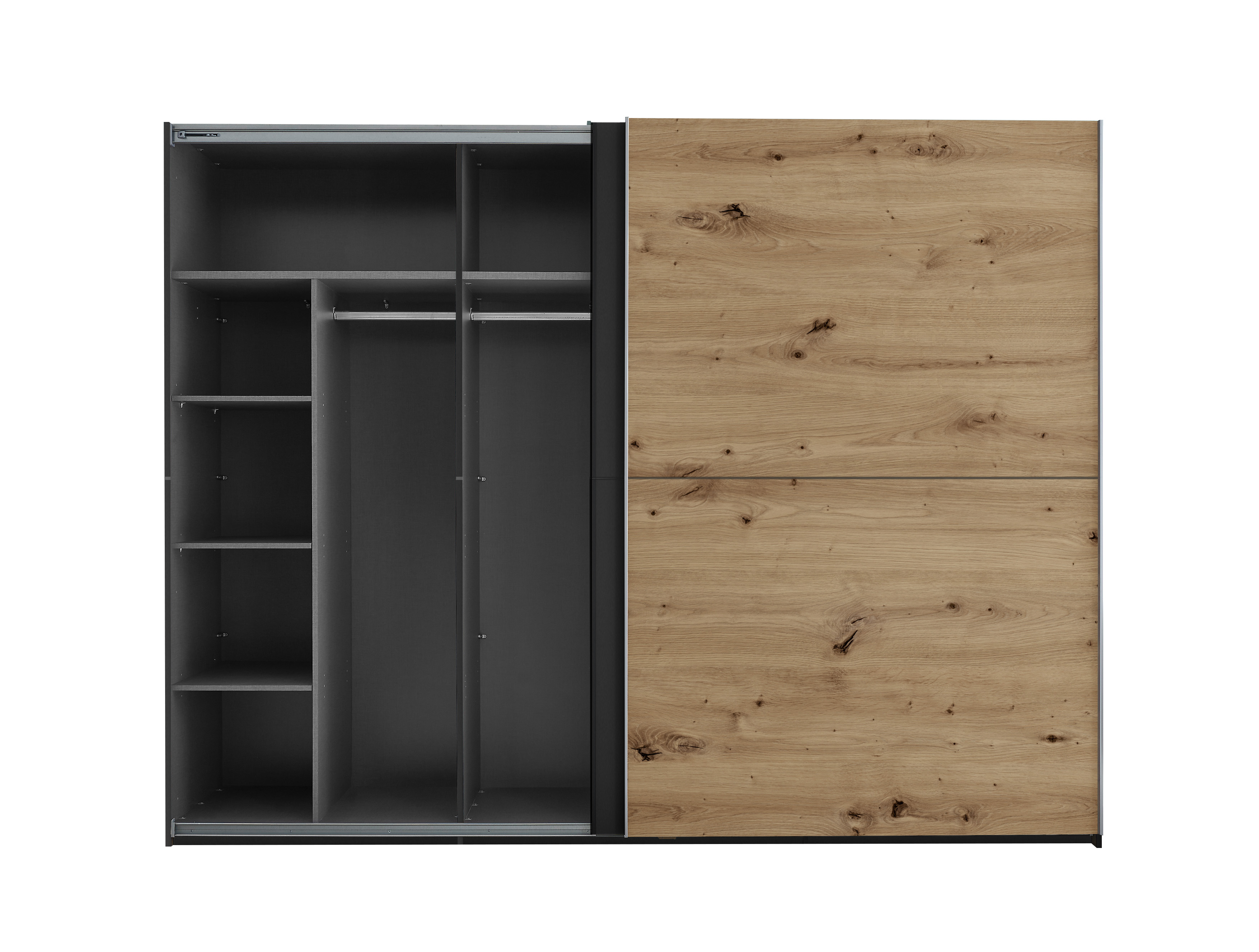 Répartition intérieure : 2 parois médianes, à gauche et à droite, à chaque fois 1 grande tablette, 3 petites tablettes et 1 barre de penderie avec, au centre, 1 tablette et 1 barre de penderie