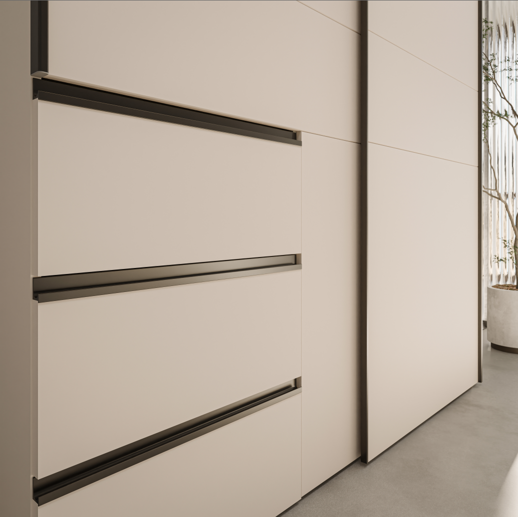 - Look intemporel et moderne : les surfaces couleur sable avec poignees noires s'adaptent a de nombreux styles d'interieur.