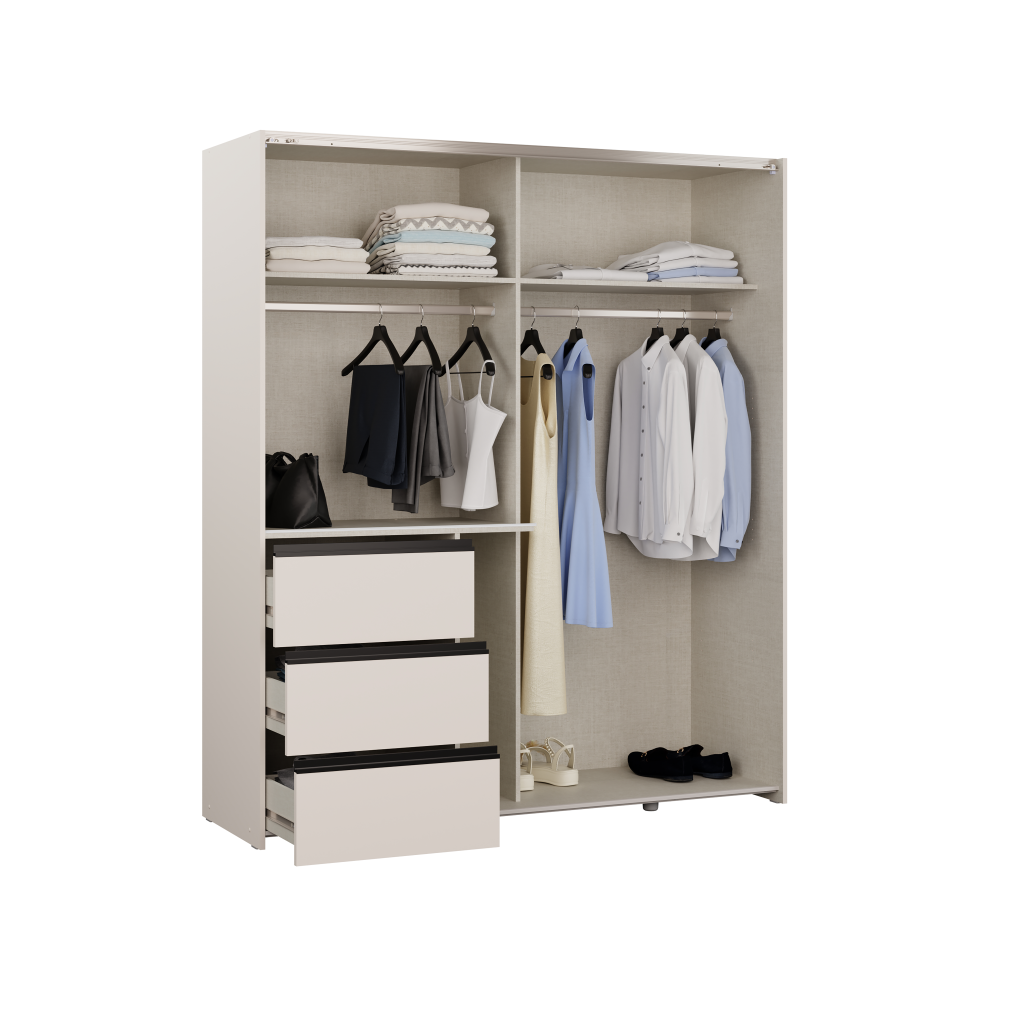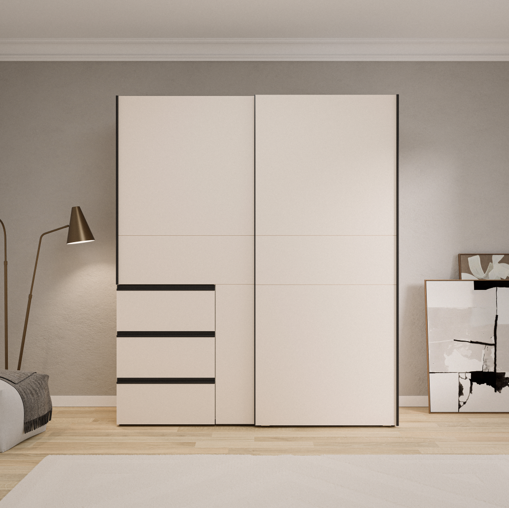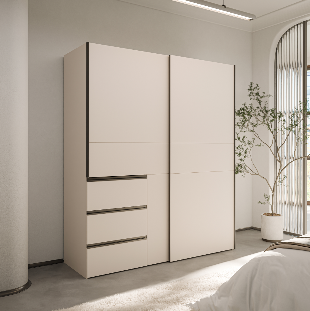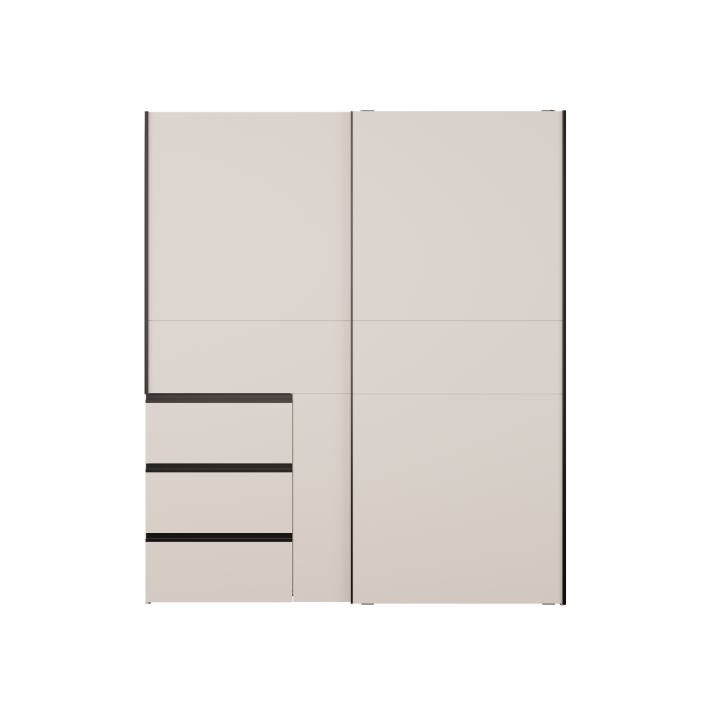 Cette armoire moderne a portes coulissantes de couleur sable seduit par son design intemporel et sa fonctionnalite pratique. La facade et le corps harmonieusement assortis de couleur sable lui conferent un aspect calme et elegant, tandis que les poignees noires apportent une touche stylee. Grace a ses deux portes coulissantes faciles a manipuler, cette armoire est egalement ideale pour les petites pieces. Trois tiroirs integres offrent un espace de rangement supplementaire pour le linge, les accessoires ou les objets du quotidien. L'armoire s'integre facilement dans les chambres a coucher ou les dressings modernes.