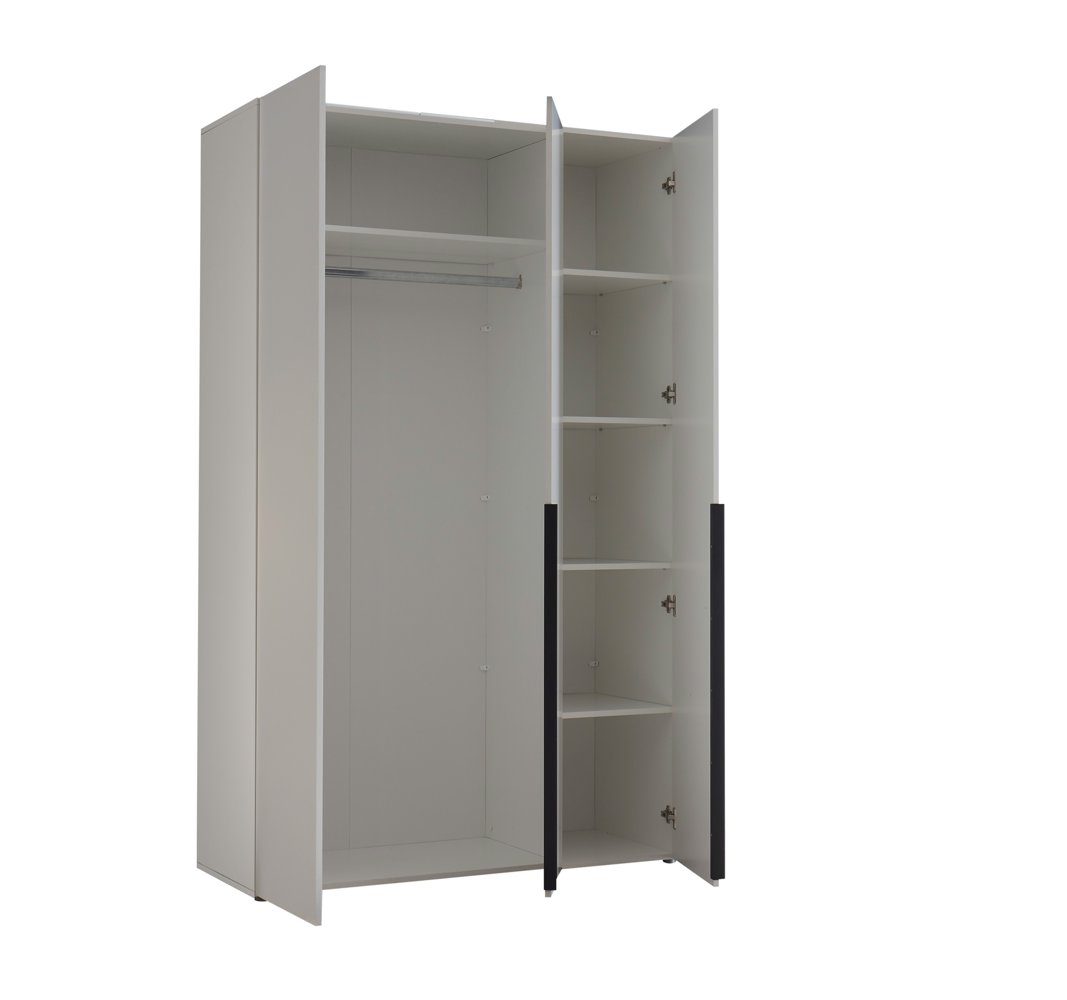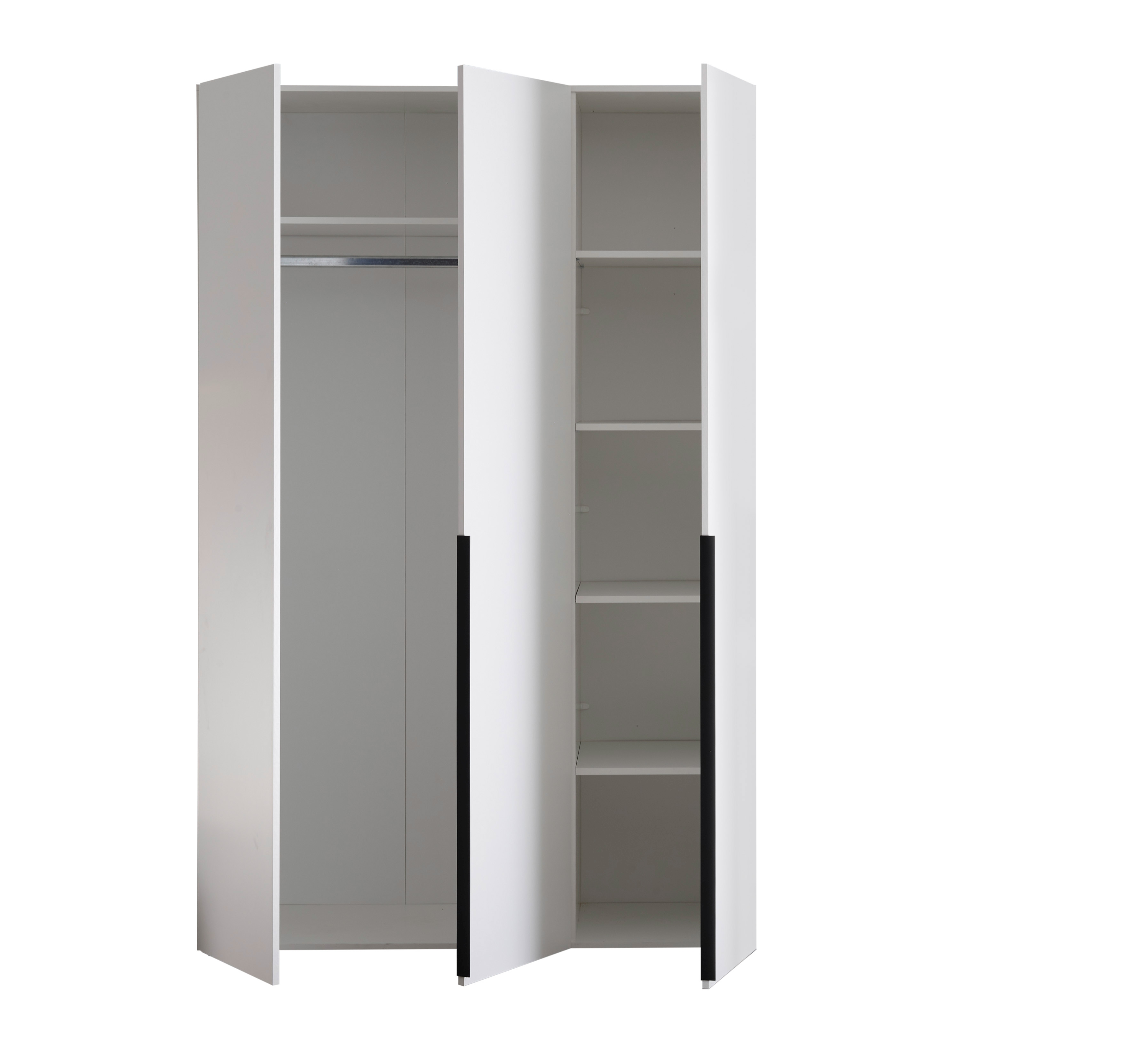 Répartition intérieure : 1 paroi médiane ; à gauche : 1 tablette et 1 barre de penderie ; à droite : 4 tablettes