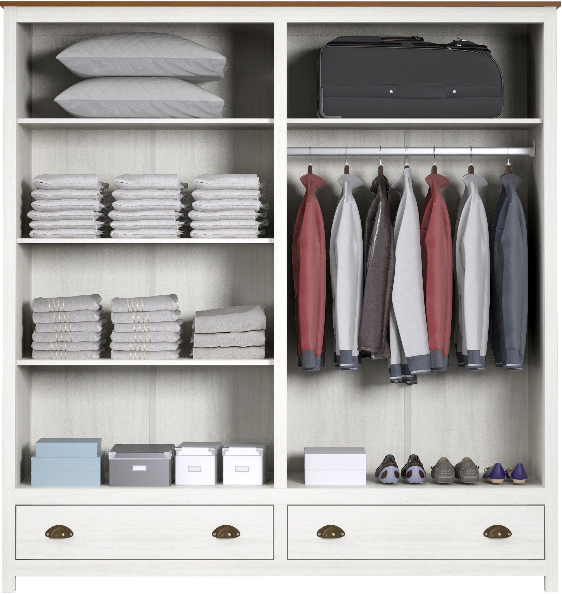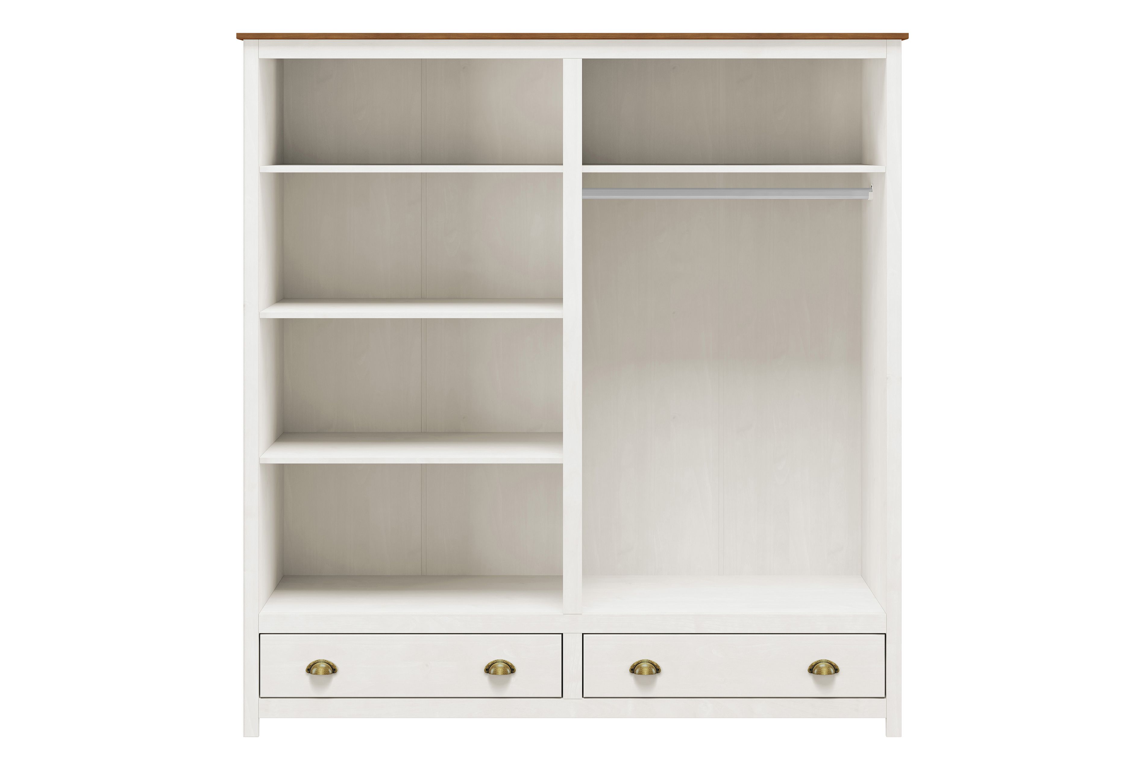 L'armoire à vêtements 4 portes est en bois de pin massif. Derrière les deux portes de droite se trouvent une barre de penderie et une tablette amovible. Derrière les deux portes de gauche se situent 3 tablettes amovibles. L'armoire offre ainsi beaucoup de place pour ranger les vestes, manteaux et pantalons. Les gants, les mouchoirs et les foulards trouveront facilement leur place dans les deux tiroirs du bas avec coulisses et poignées en métal. La surface de l'armoire en bois est laquée ton blanc avec un panneau supérieur dans une teinte de contraste ton marron.