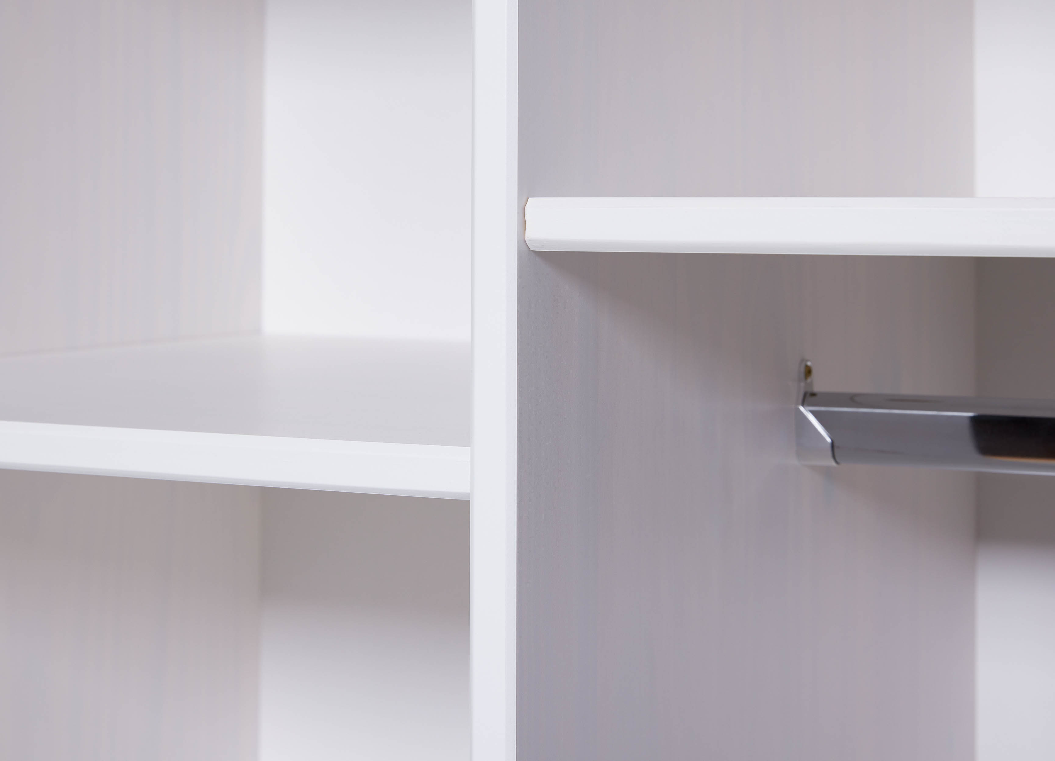 - Derrière la porte de droite et la porte de gauche se trouvent, à chaque fois, une tablette et une barre de penderie
