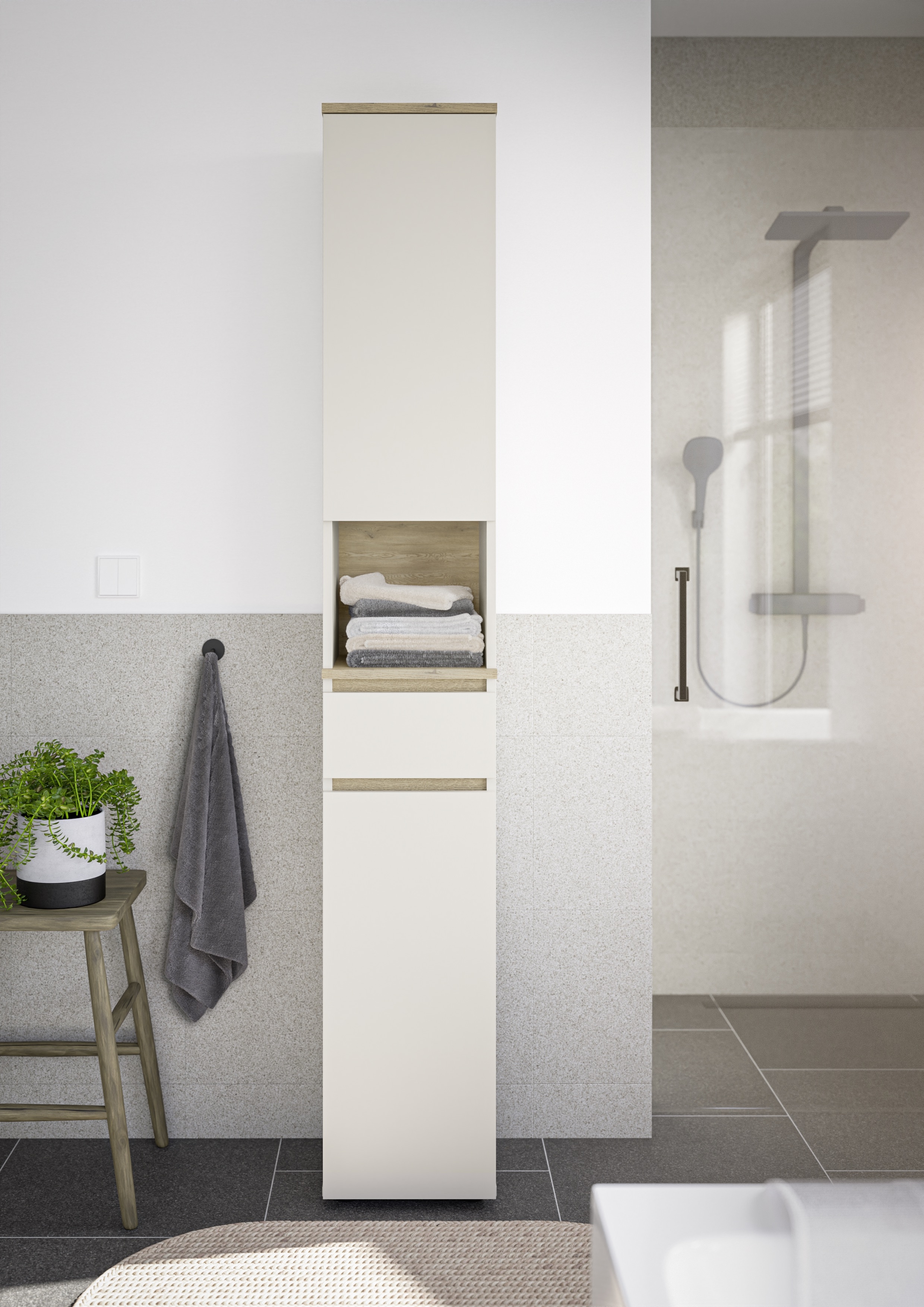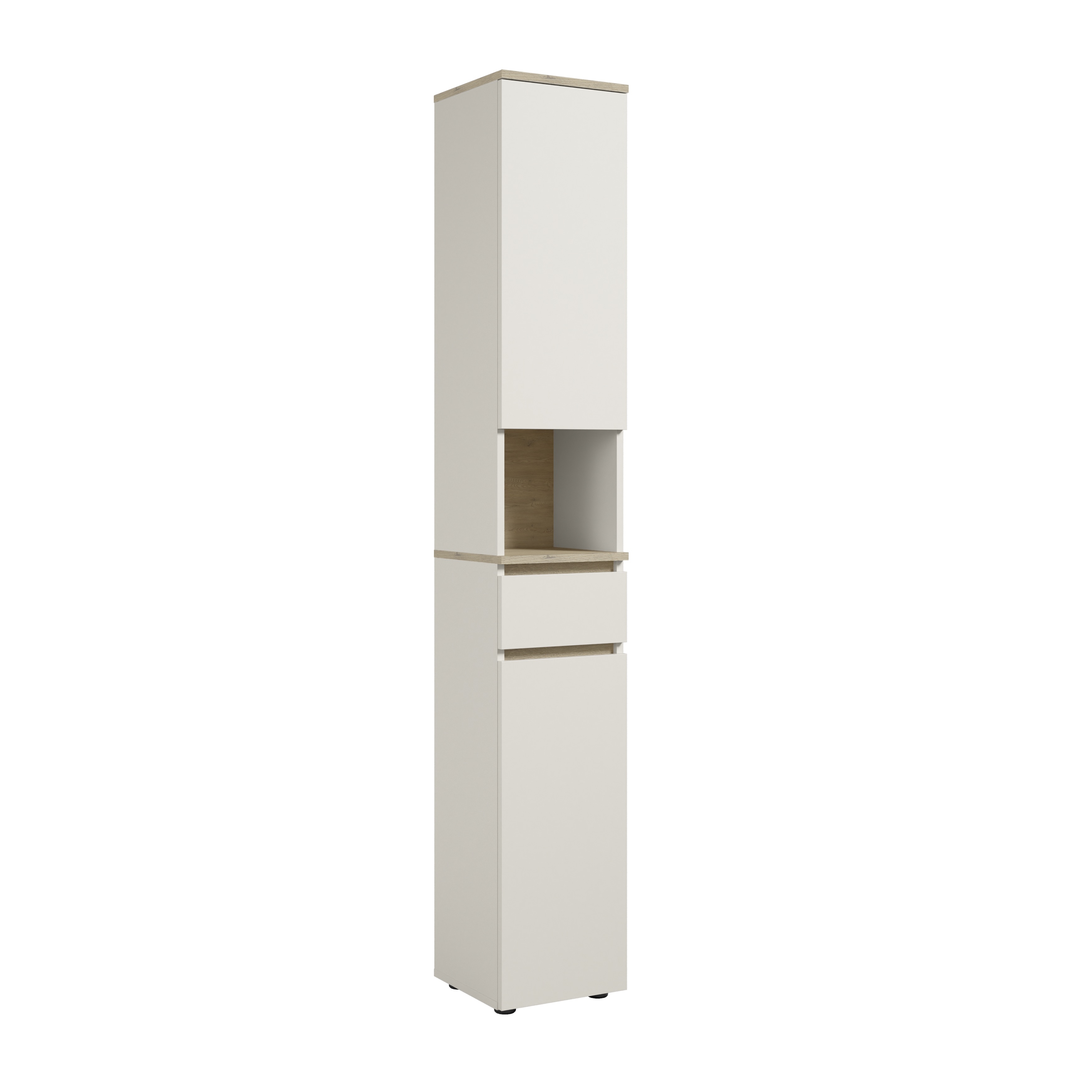 Cette armoire haute en cachemire avec des contrastes en imitation bois de chêne Cremona offre des possibilités de rangement pratiques dans un format étroit. Le revêtement mélaminé facile d'entretien garantit une surface résistante au quotidien. Derrière deux portes se trouvent deux étagères qui offrent un espace de rangement flexible pour les articles ménagers, les provisions ou les textiles. Un compartiment ouvert est idéal pour les objets qui doivent être rapidement accessibles. Des patins ronds en plastique noir assurent la stabilité de l'armoire. Les couleurs sobres s'intègrent bien dans les intérieurs modernes et économiques, que ce soit dans le couloir, la salle de bains ou la buanderie.