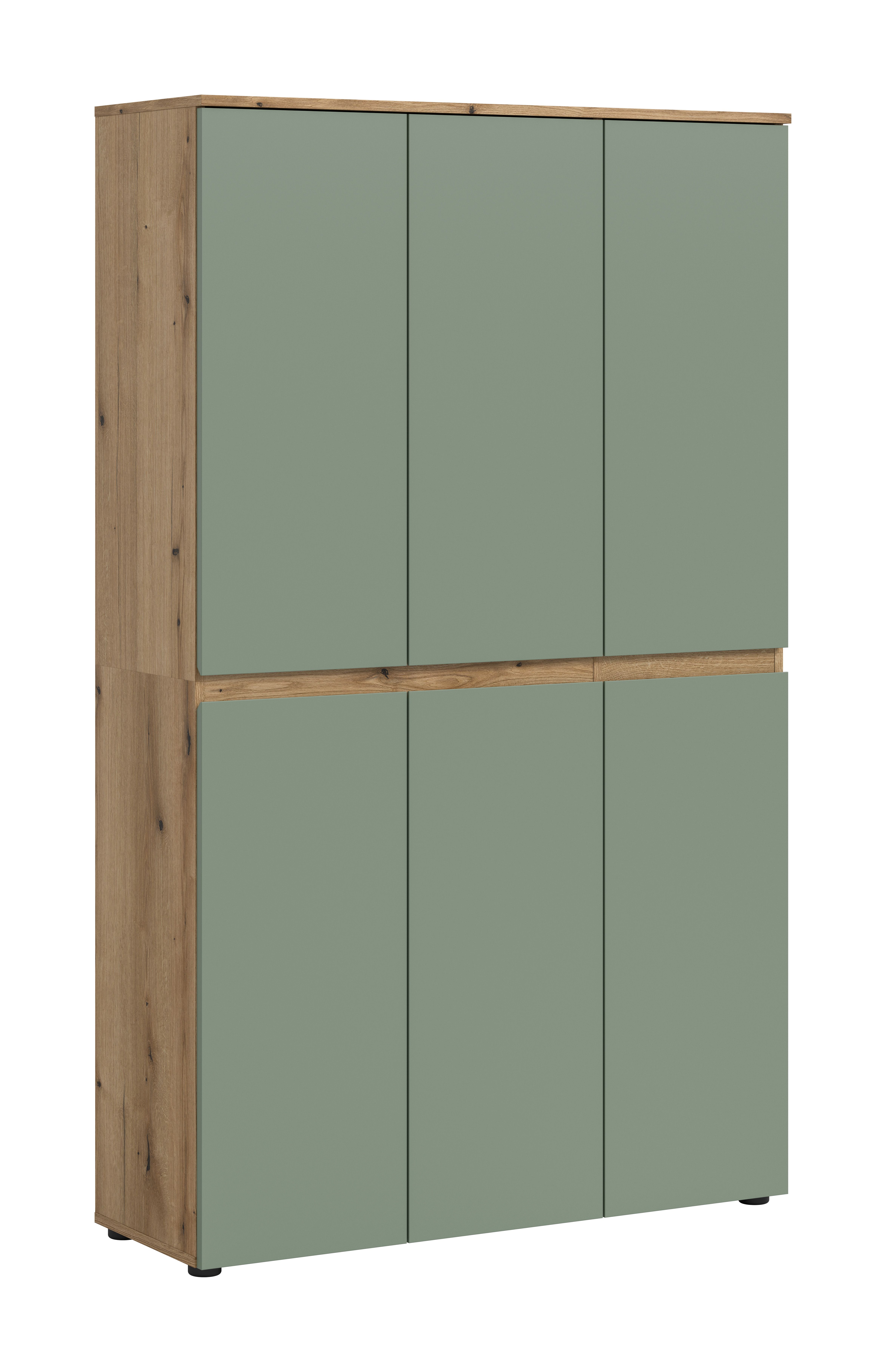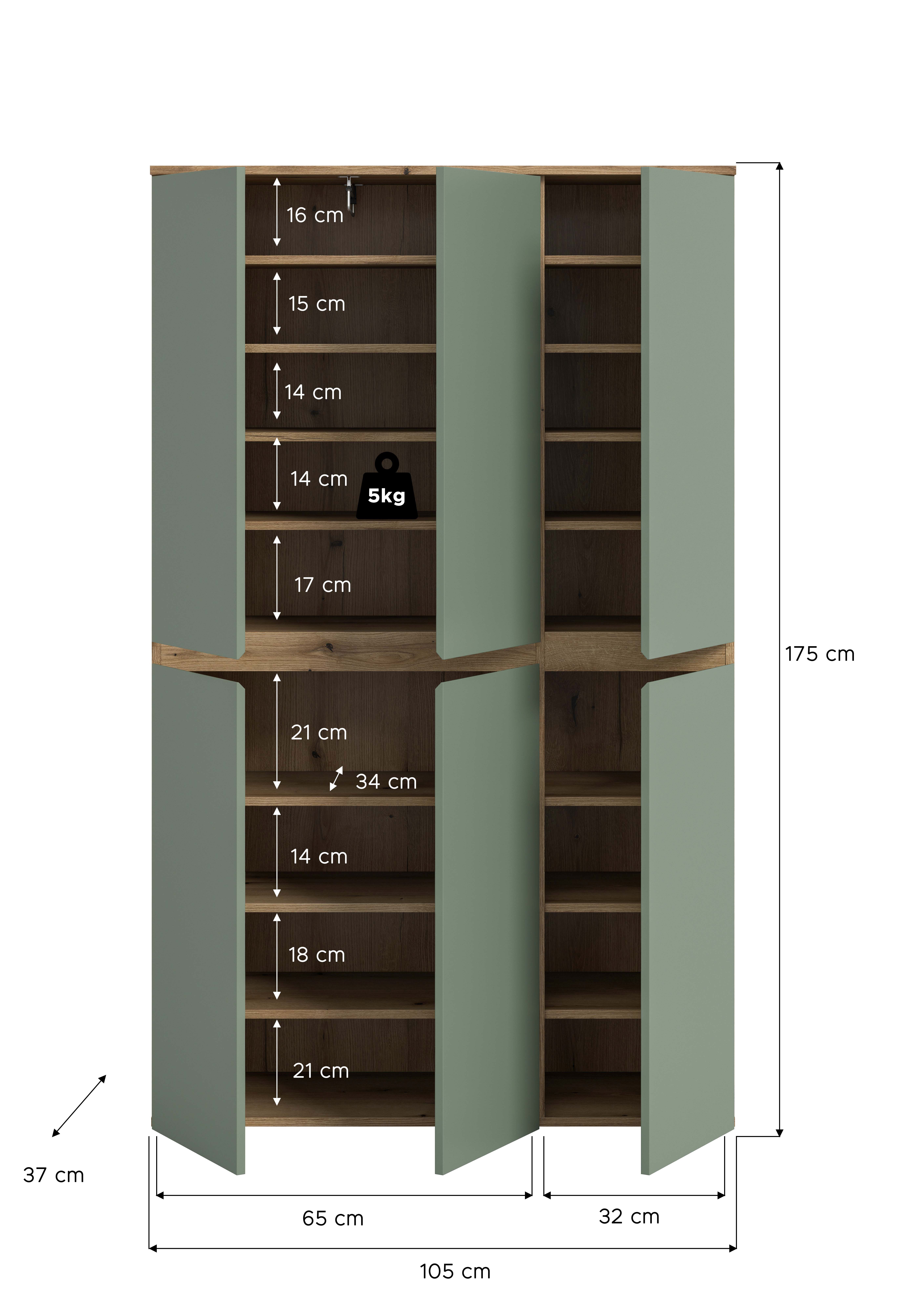 Cette armoire multifonction pratique dans un décor chêne Evoke et ton smoke green combine intelligemment rangement et organisation (dimensions : 105 x 175 x 37 cm). Grâce à sa barre de penderie robuste, les vestes, les manteaux et les chemises y trouveront facilement leur place, tandis que 14 tablettes amovibles réglables en hauteur assurent une flexibilité maximale en matière de répartition intérieure. Cette armoire s’adaptera aisément à vos besoins pour ranger chaussures, textiles, classeurs ou accessoires ménagers. Avec son design intemporel, elle s’intègre harmonieusement dans n’importe quelle pièce, mais trouvera aussi sa place dans l’entrée ou à la cave. Vous cherchez un rangement peu encombrant ? Cette armoire est faite pour vous !