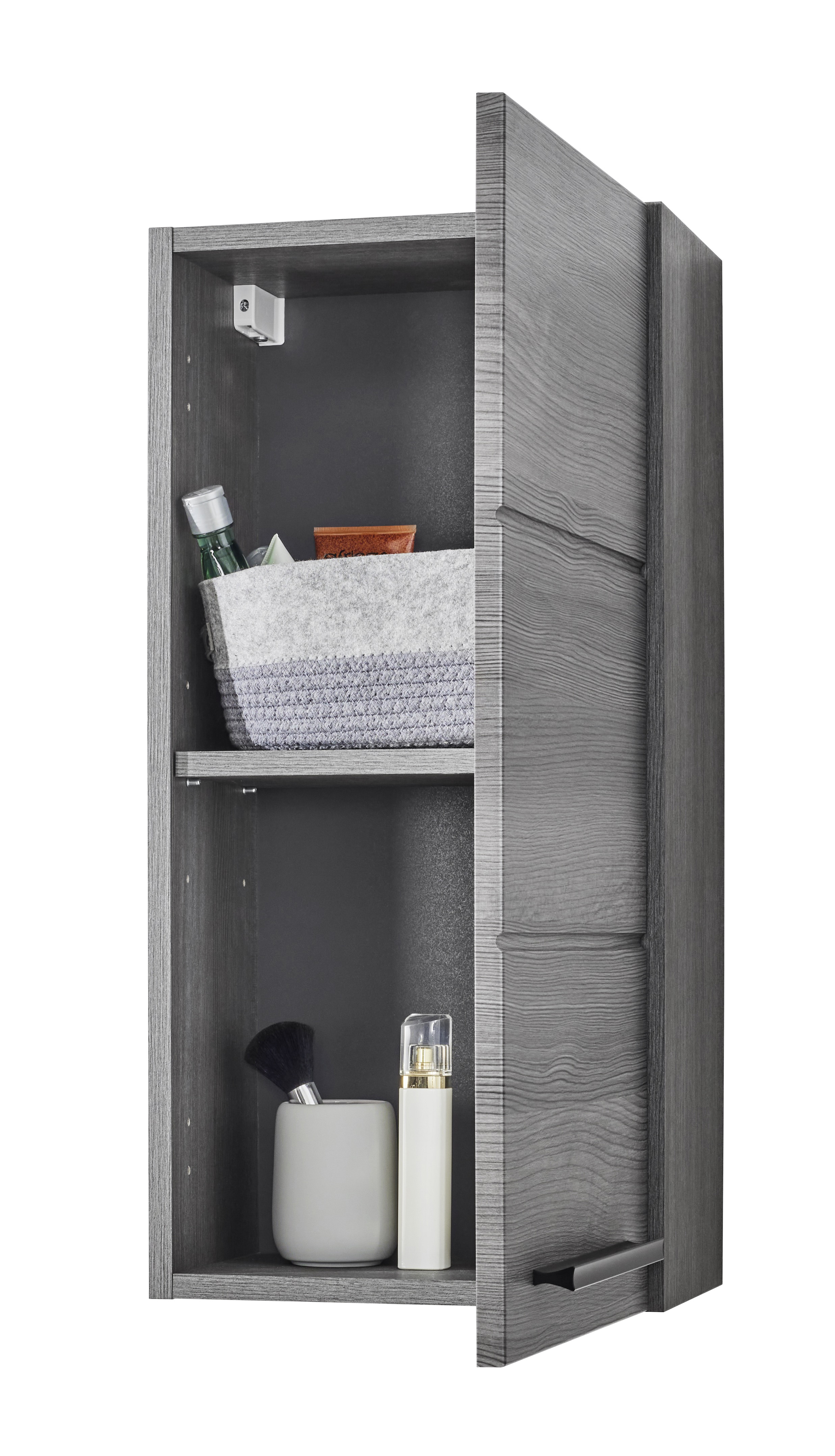 Cette armoire suspendue moderne en argent fumé allie un espace de rangement fonctionnel à un design élégant et est idéale pour les salons ou les salles de bains modernes. Le corps et la façade en argent fumé lui confèrent un aspect intemporel et haut de gamme, tandis que les poignées noires ajoutent une touche d'élégance. La porte avec fonction de fermeture douce permet une ouverture et une fermeture silencieuses et confortables. À l'intérieur, une étagère offre un espace de rangement pratique pour les produits de soin, les serviettes ou les objets du quotidien. L'armoire suspendue est la solution parfaite pour un aménagement intérieur ordonné et moderne.