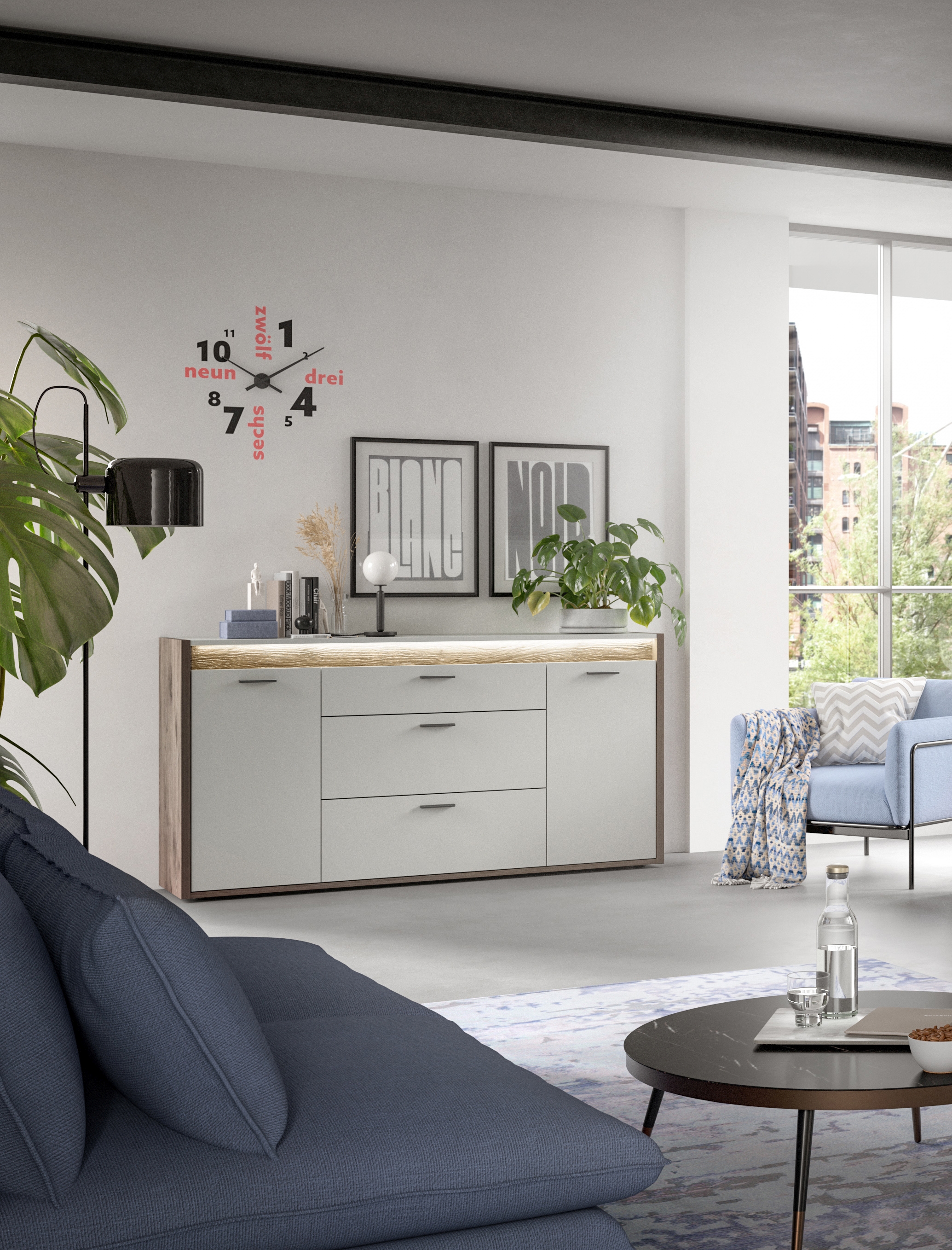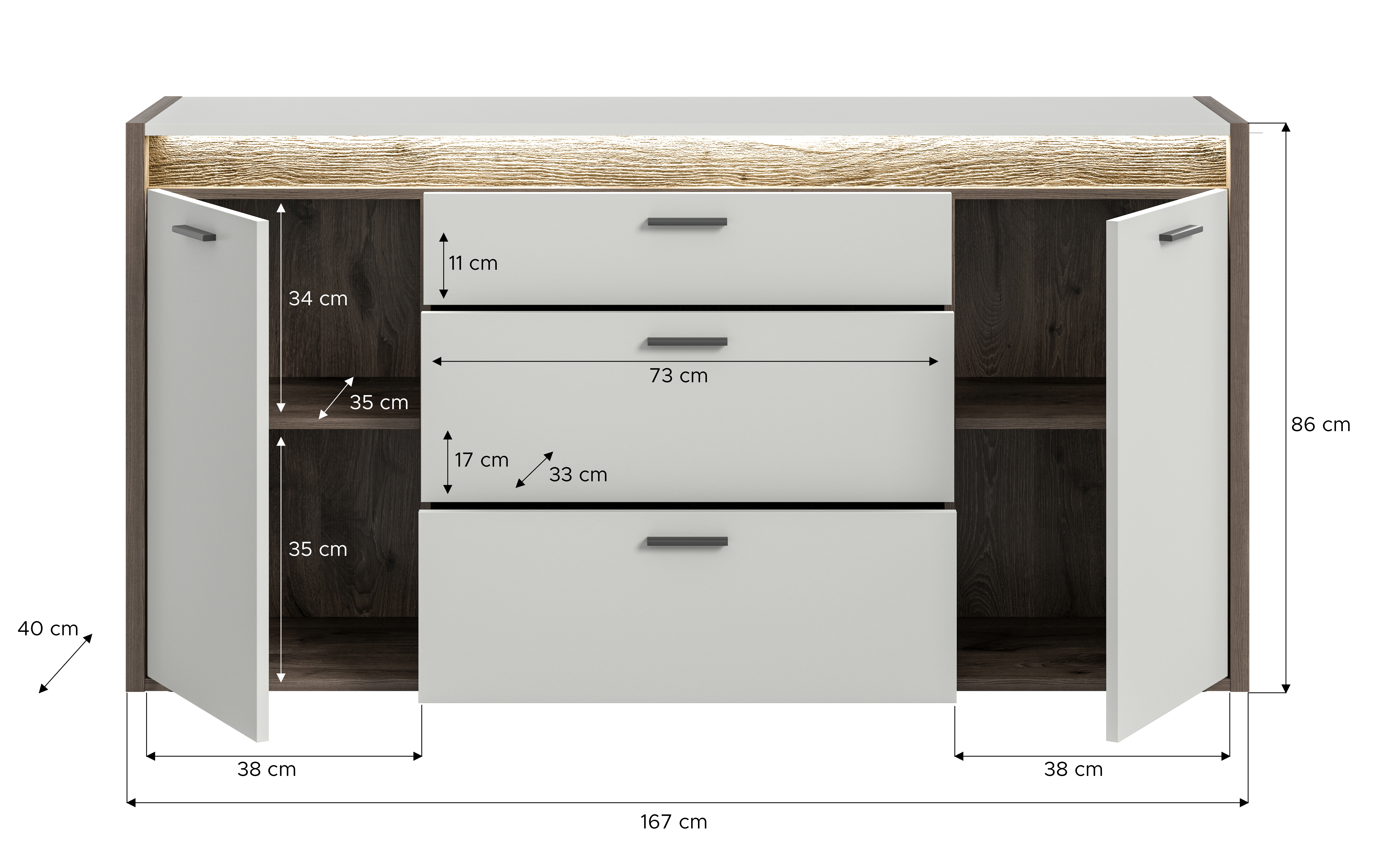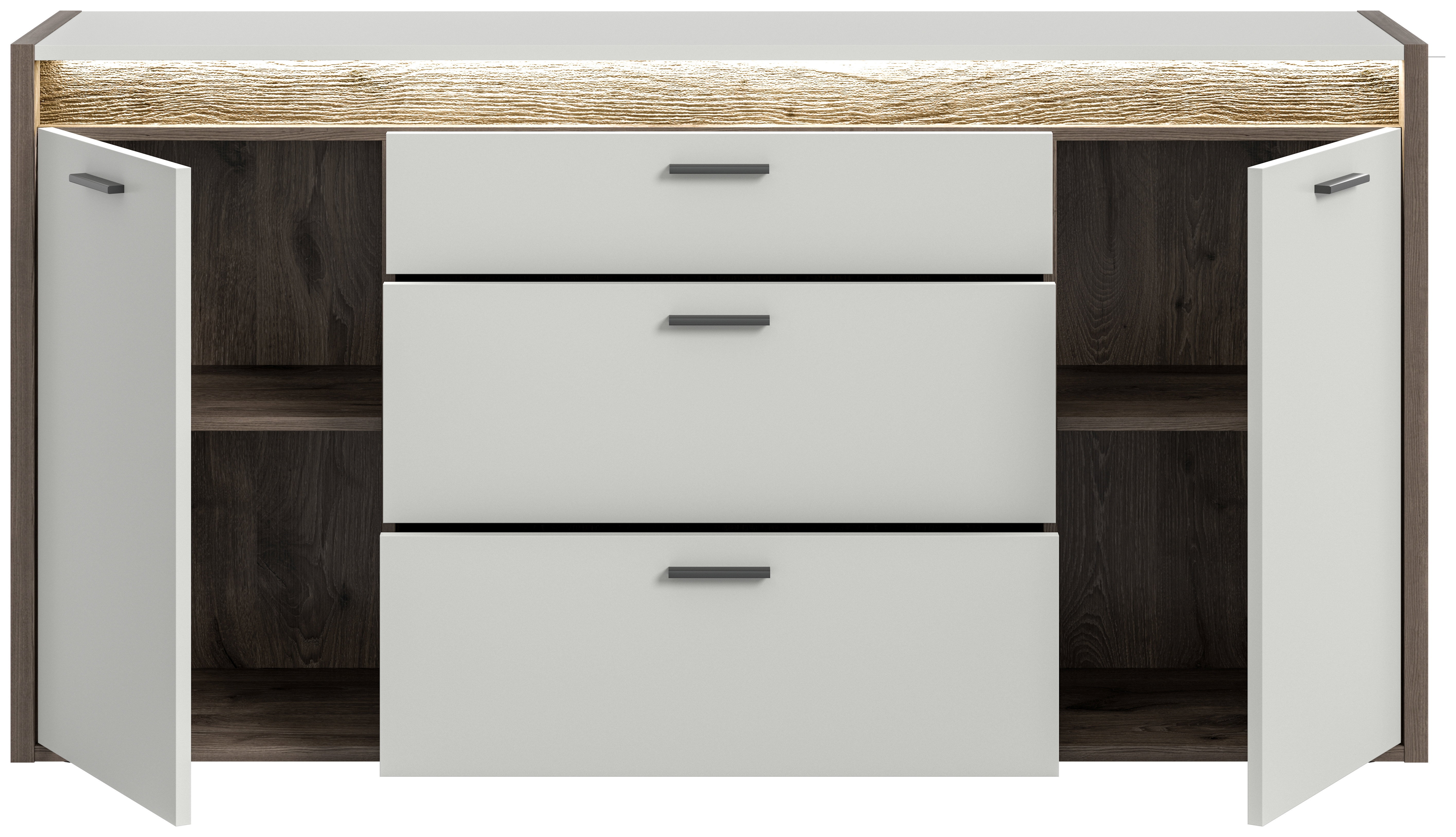 - Design/style : bahut stylé décor chêne Nox foncé et ton gris clair dans un look moderne et attrayant grâce à l’alliance d’un ton bois chaleureux et d’un gris intemporel.