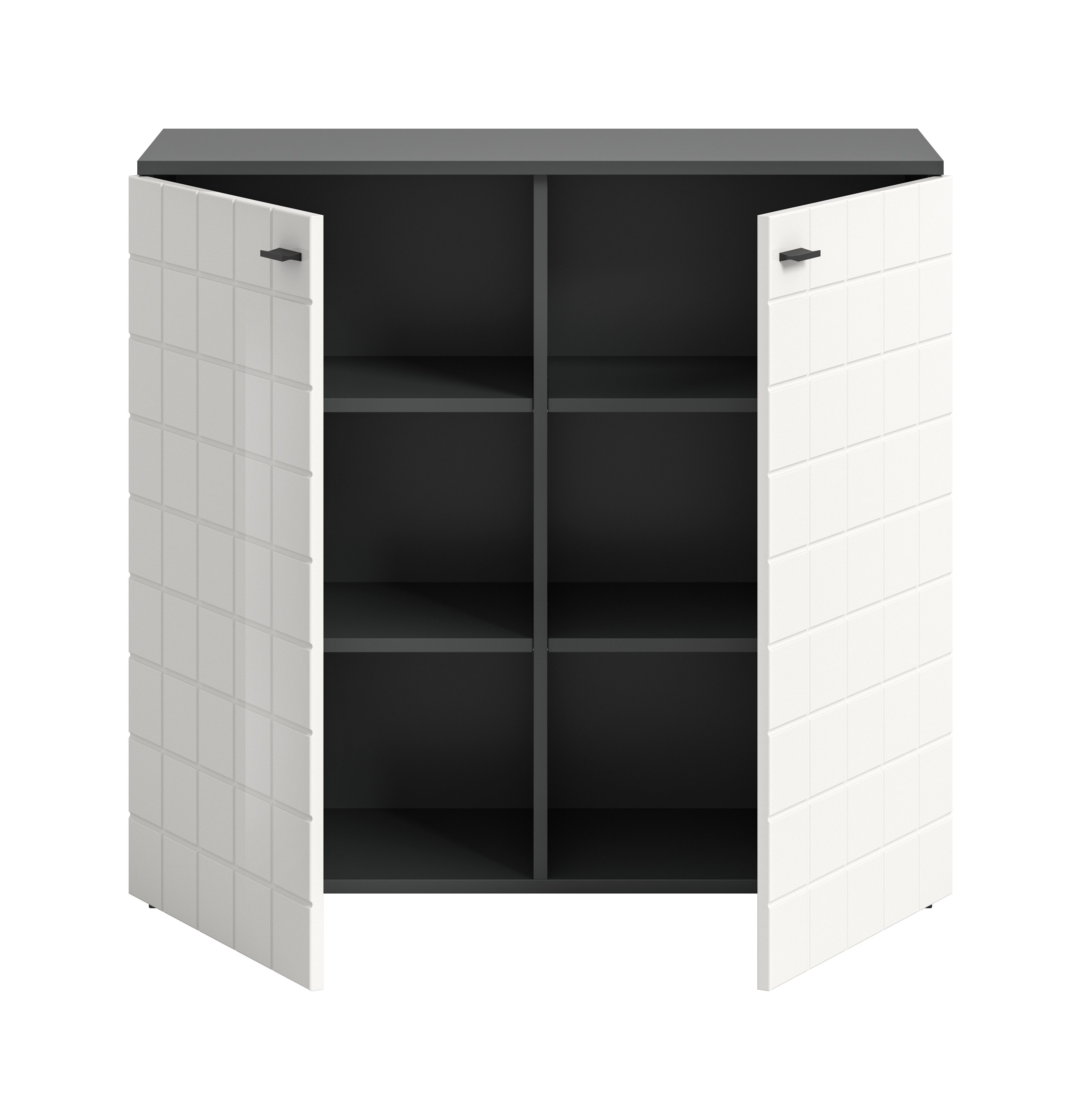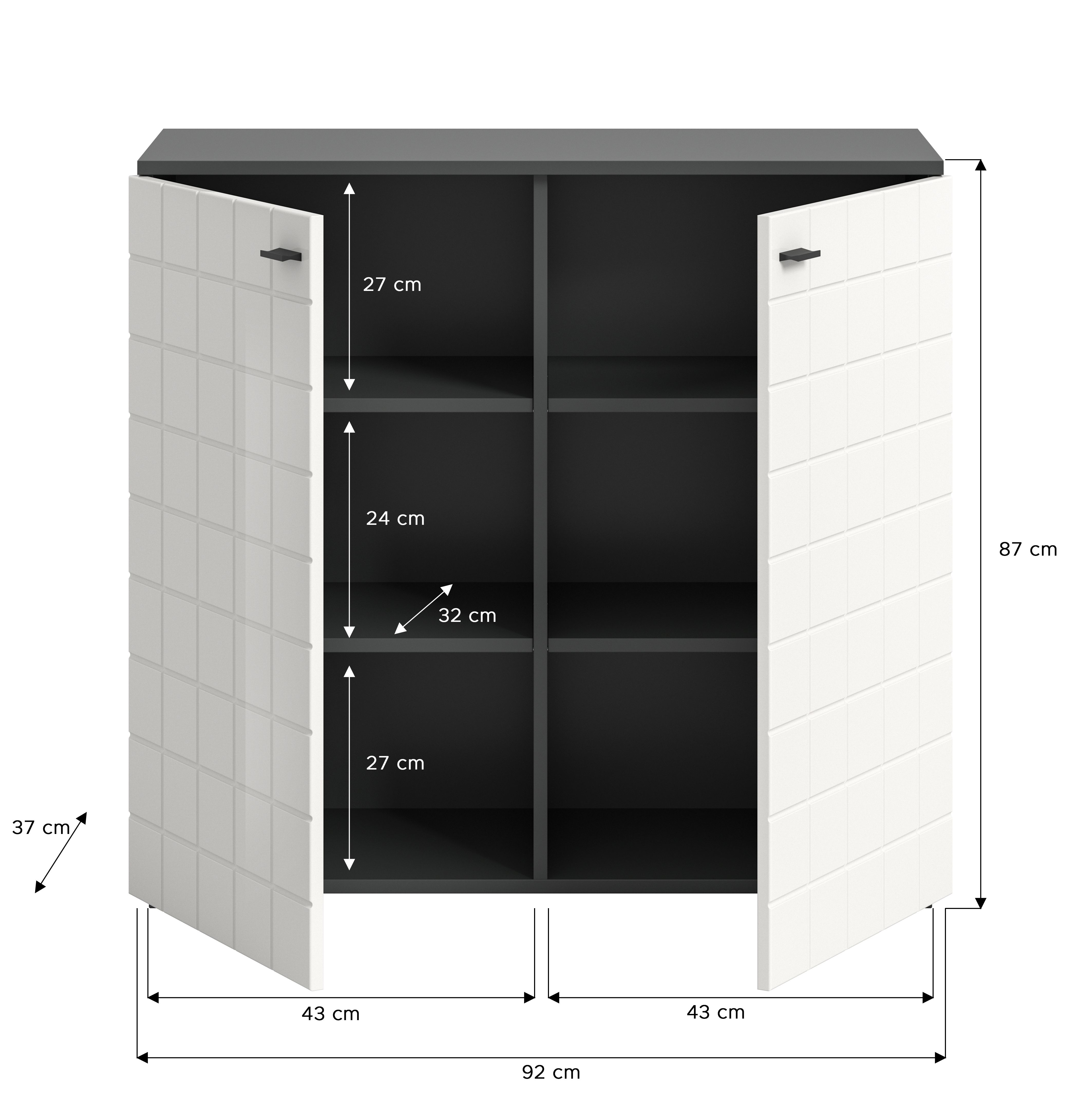 Un bahut aux dimensions 92x86x37 cm dans une finition ton blanc ultra brillant et décor anthracite est un meuble élégant et pratique pour votre intérieur. Sa taille offre un espace de rangement suffisant. L’association du MDF ton blanc ultra brillant et du décor anthracite confère au bahut une apparence moderne et stylée qui s'intègre parfaitement dans différents styles d'intérieurs. L'effet ultra brillant ajoute une touche d'élégance tandis que le décor anthracite souligne le joli contraste.
