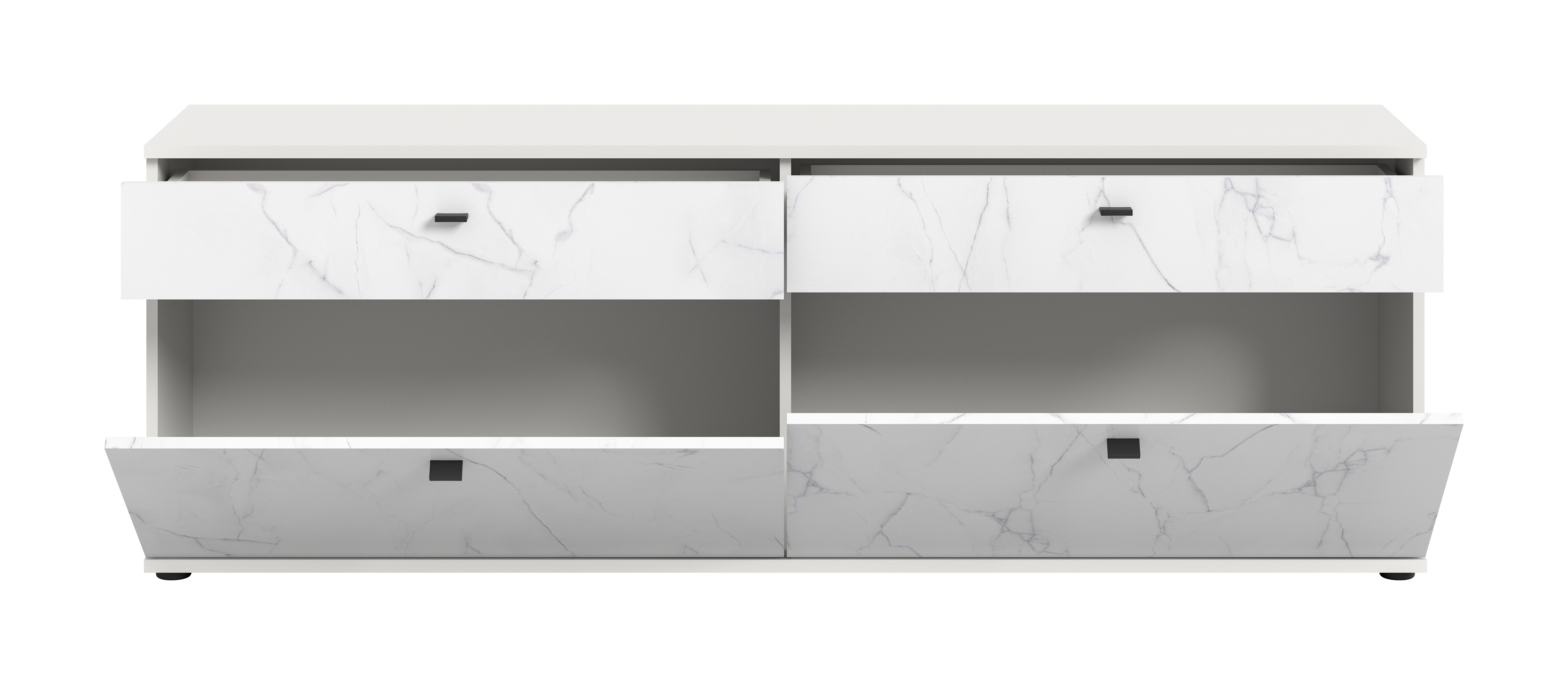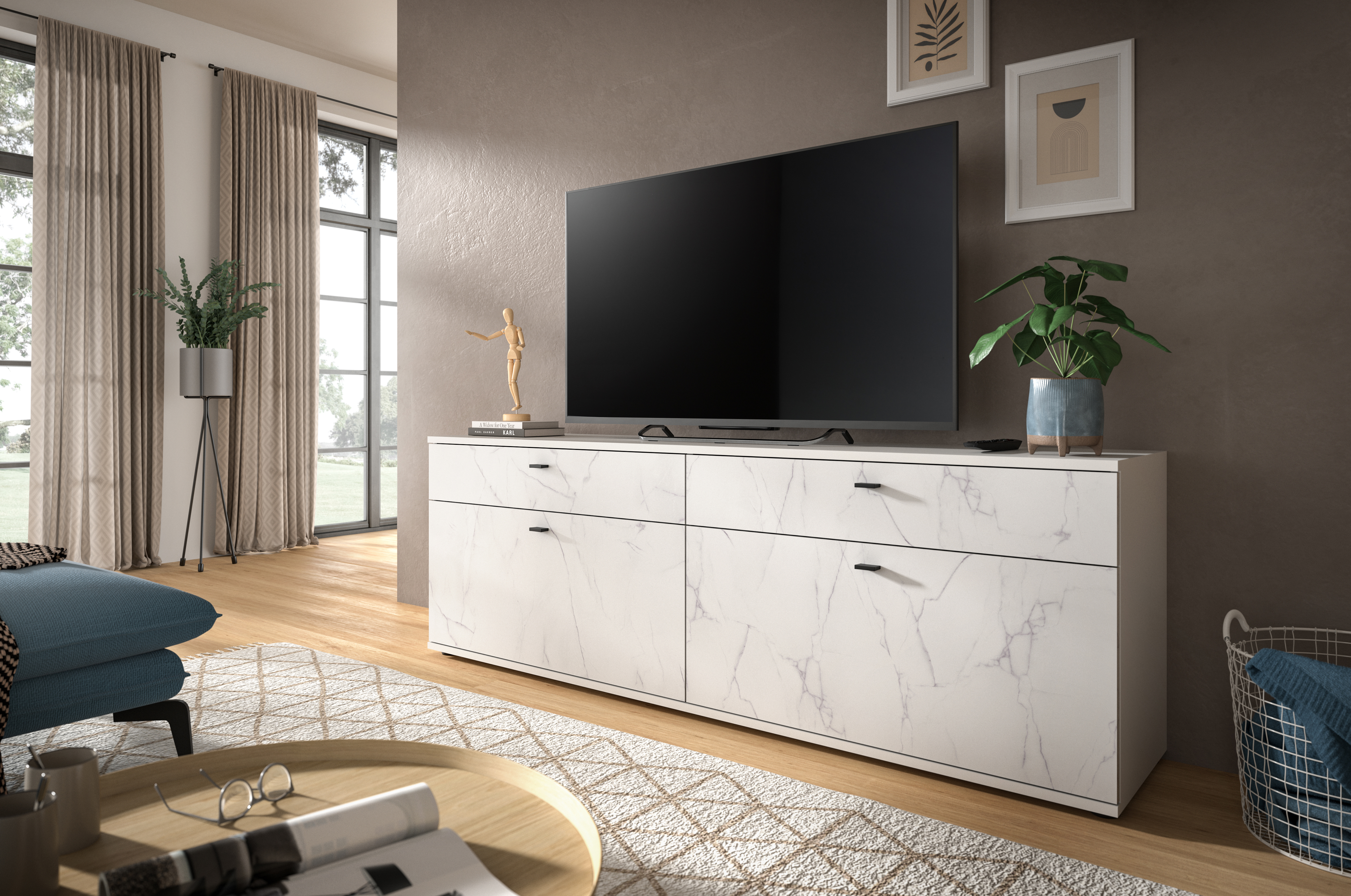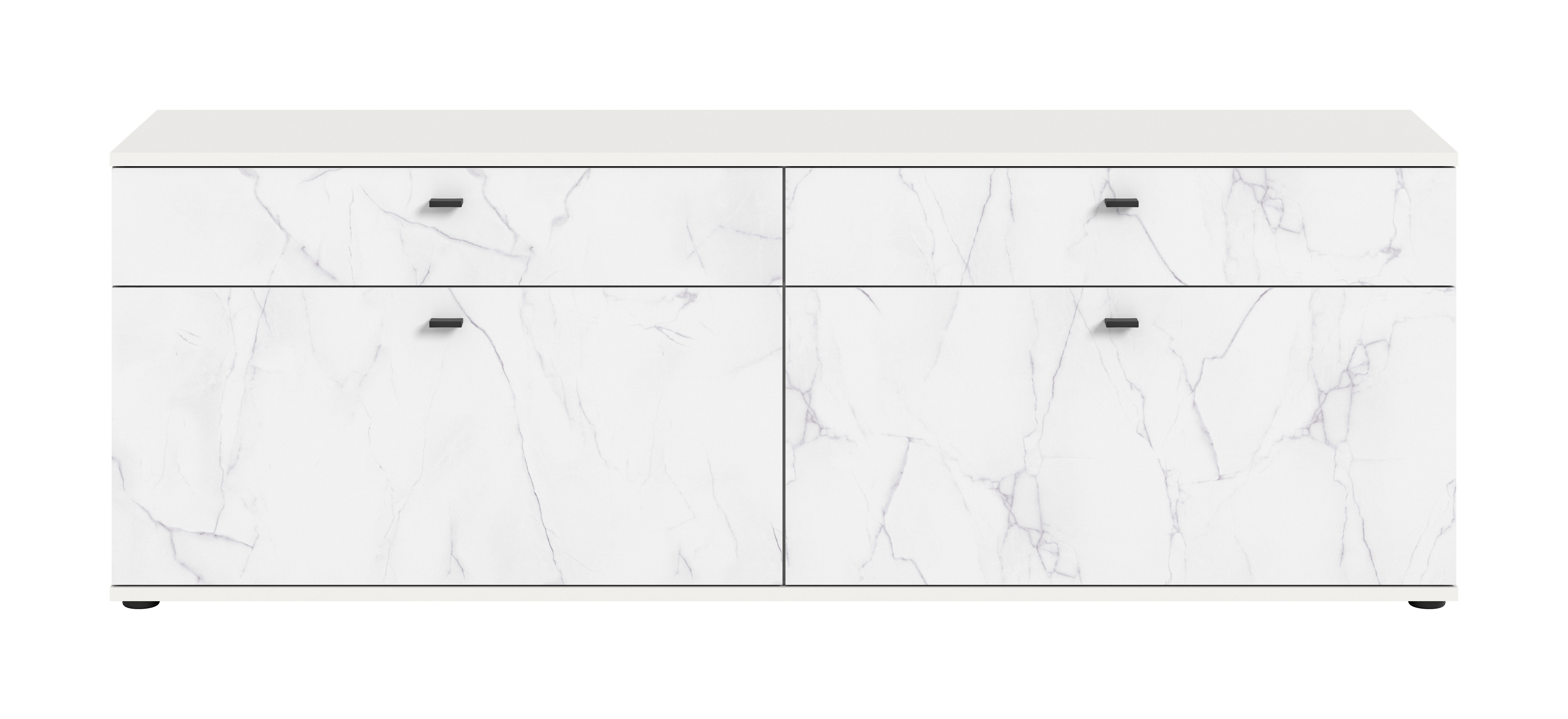 Découvrez cet élégant bahut bas en décor marbre blanc au format idéal pour votre intérieur !