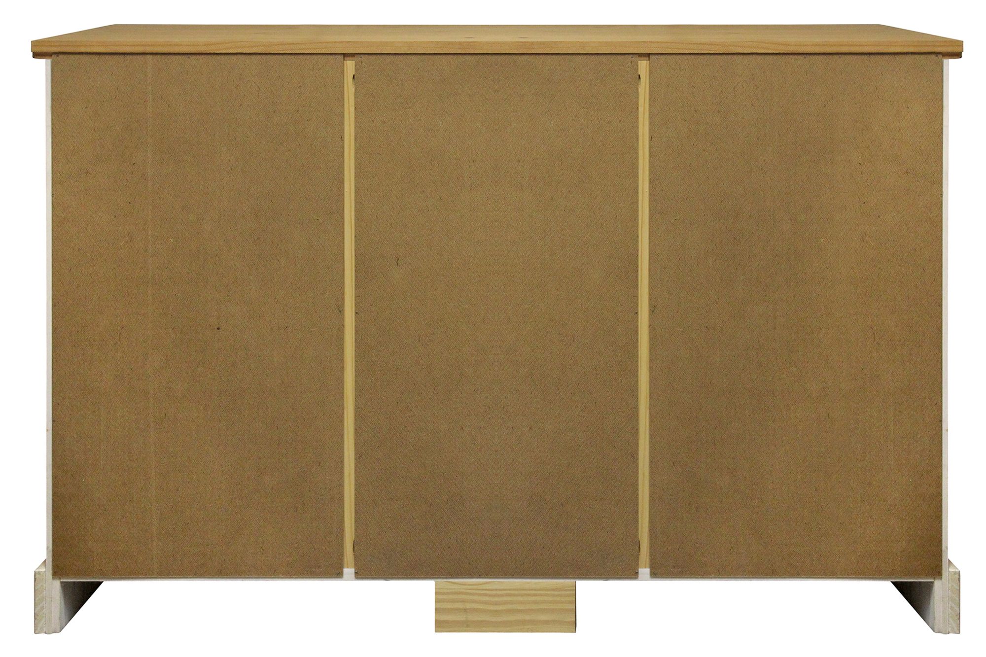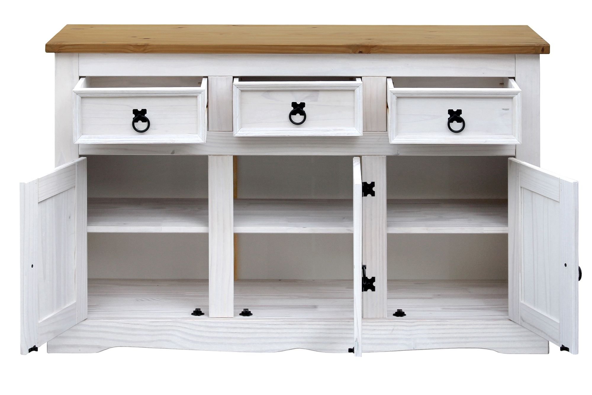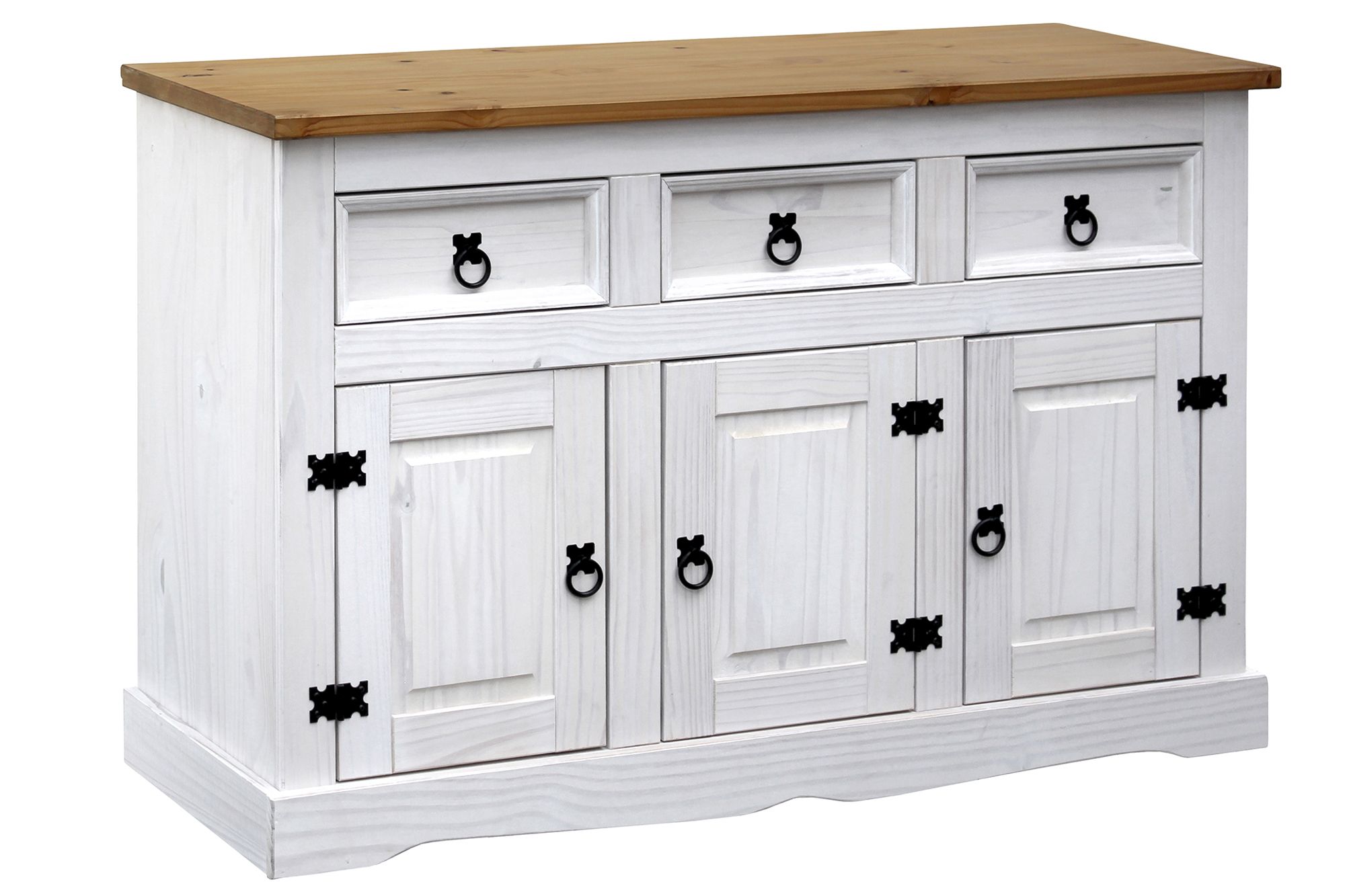 Le bahut est fabriqué en pin massif dans un style rustique. La surface est cirée dans un ton blanc, le plateau est ciré dans un ton miel chaleureux. L'enfilade offre un bel espace de rangement dans 3 tiroirs et derrière les 3 portes avec une tablette amovible chacune. Le socle est dans une forme ondulée. Le bahut attirera tous les regards dans votre salon, votre salle à manger ou votre entrée. Les décorations en métal laqué ton noir confèrent à cette enfilade un charme fou.