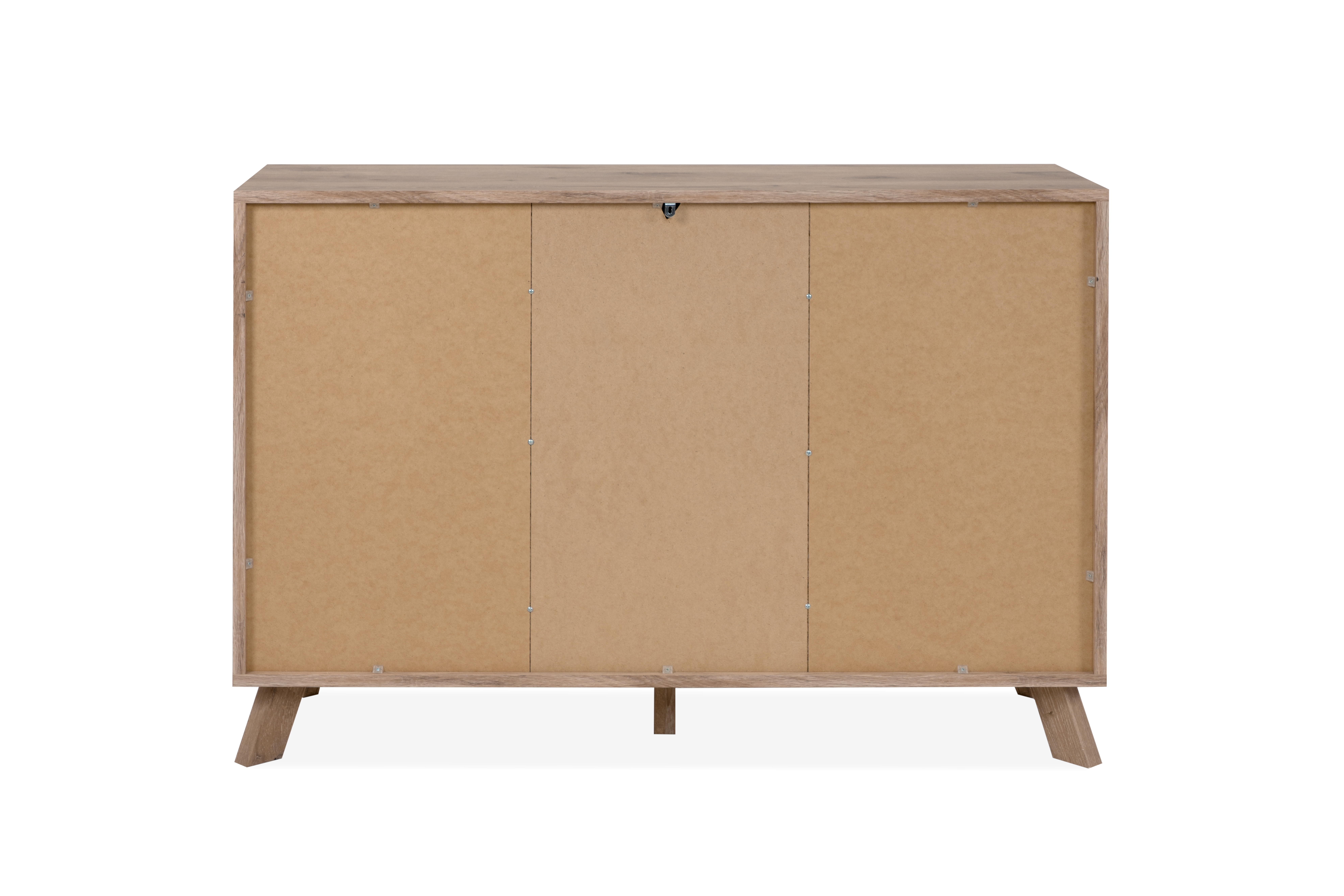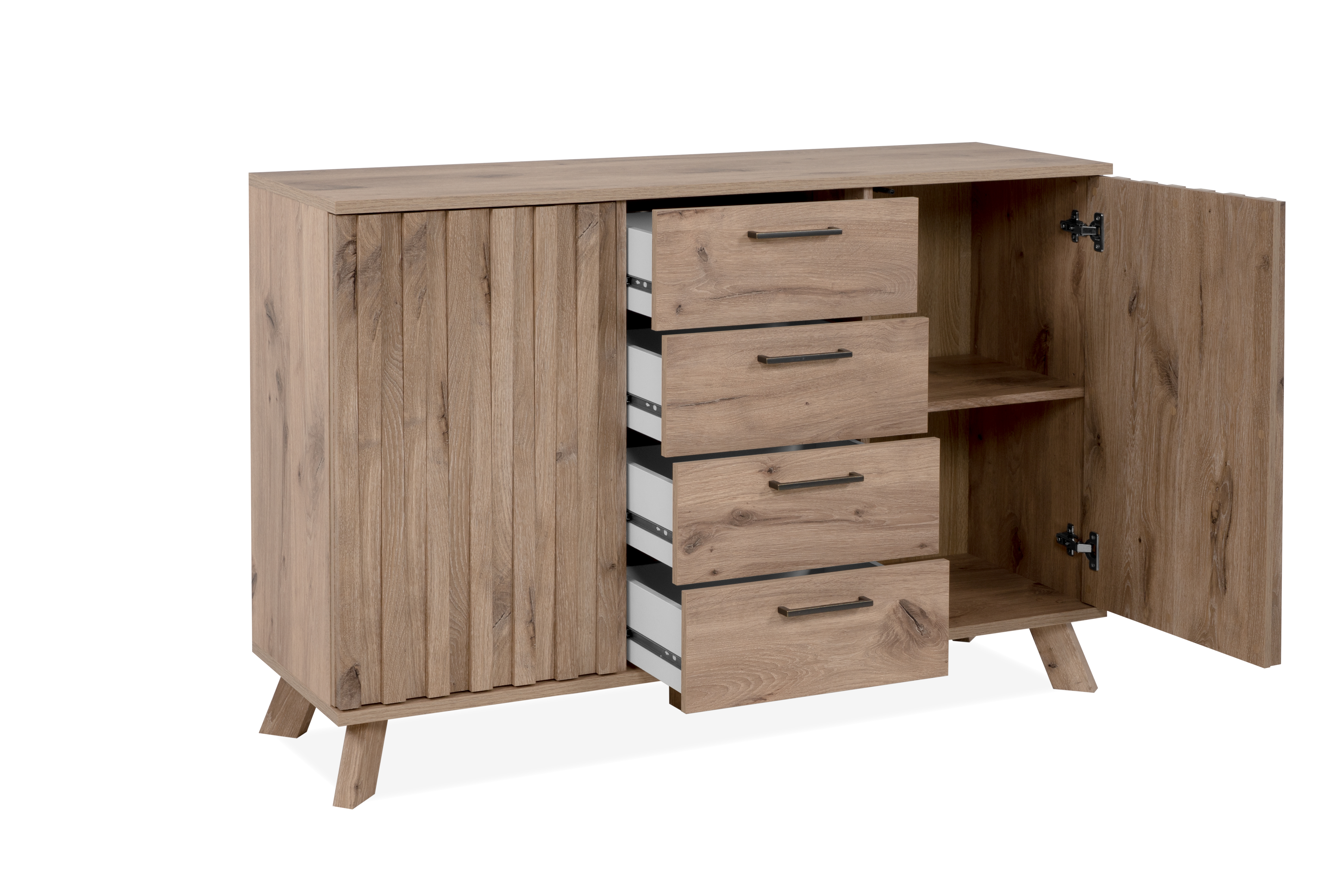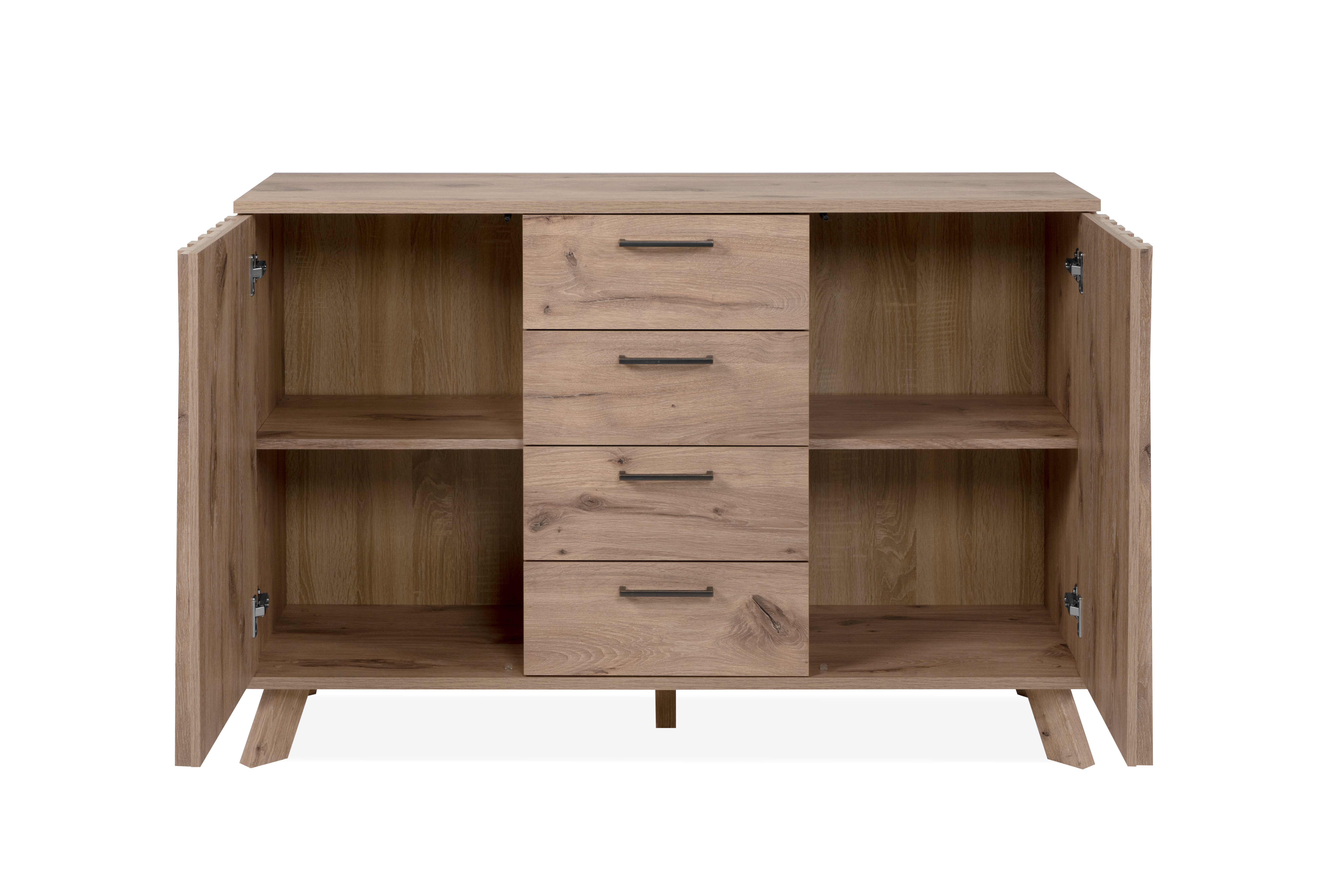 À gauche et à droite : de chaque côté, 1 porte avec effet relief 3D et ouverture par simple pression ; derrière chacune d'elles, 1 tablette amovible