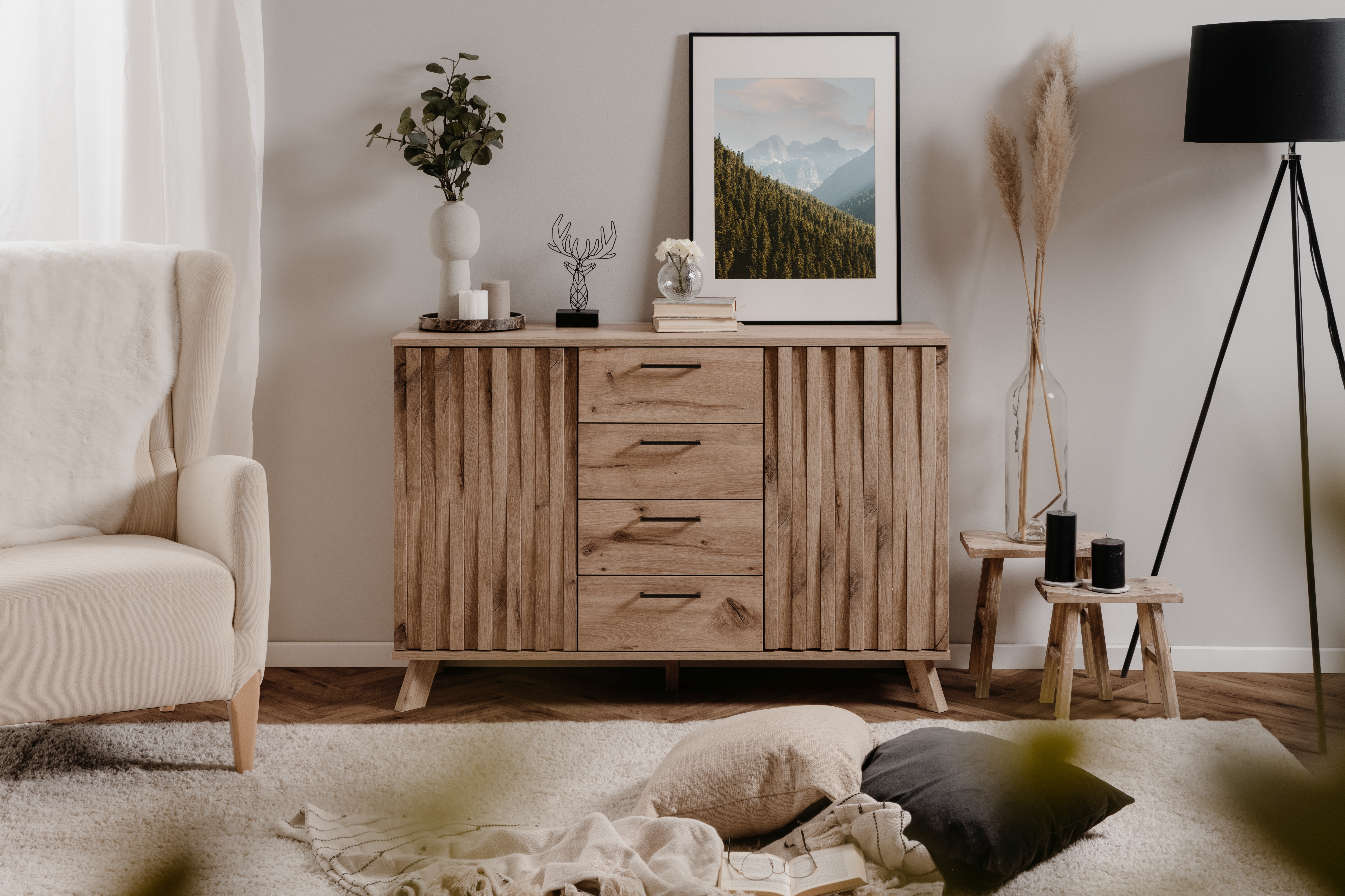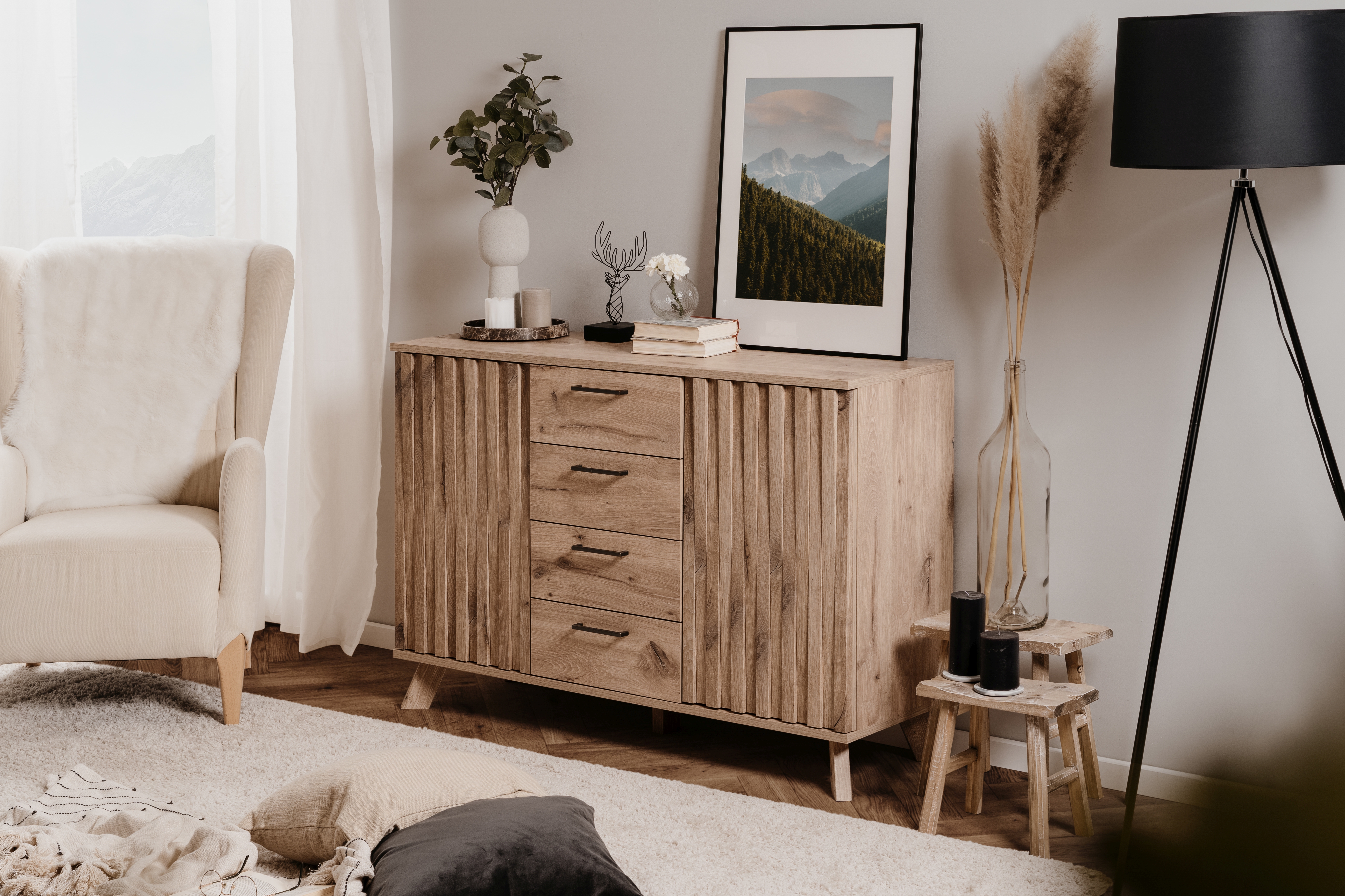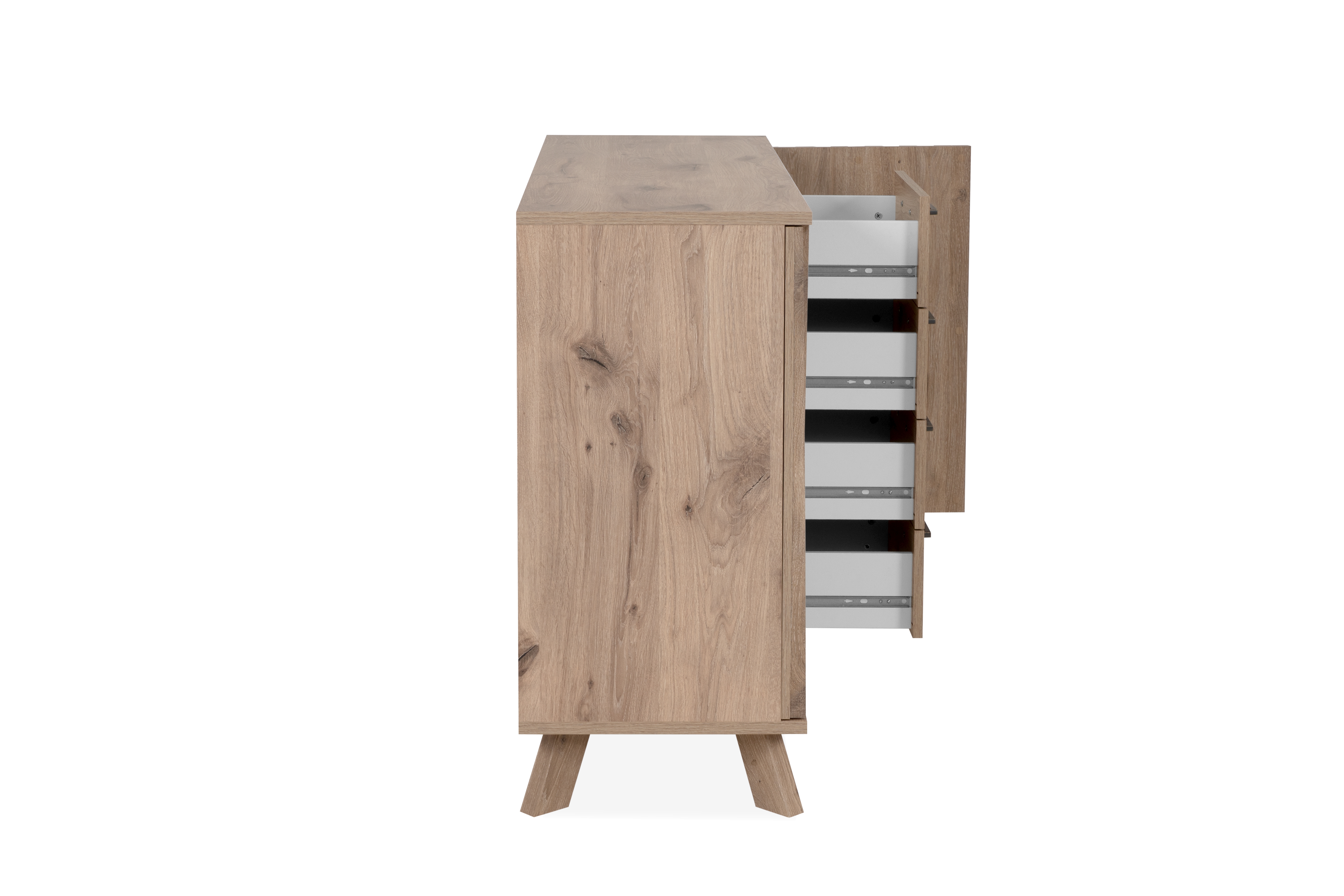 À gauche et à droite : de chaque côté, 1 porte avec effet relief 3D et ouverture par simple pression ; derrière chacune d'elles, 1 tablette amovible