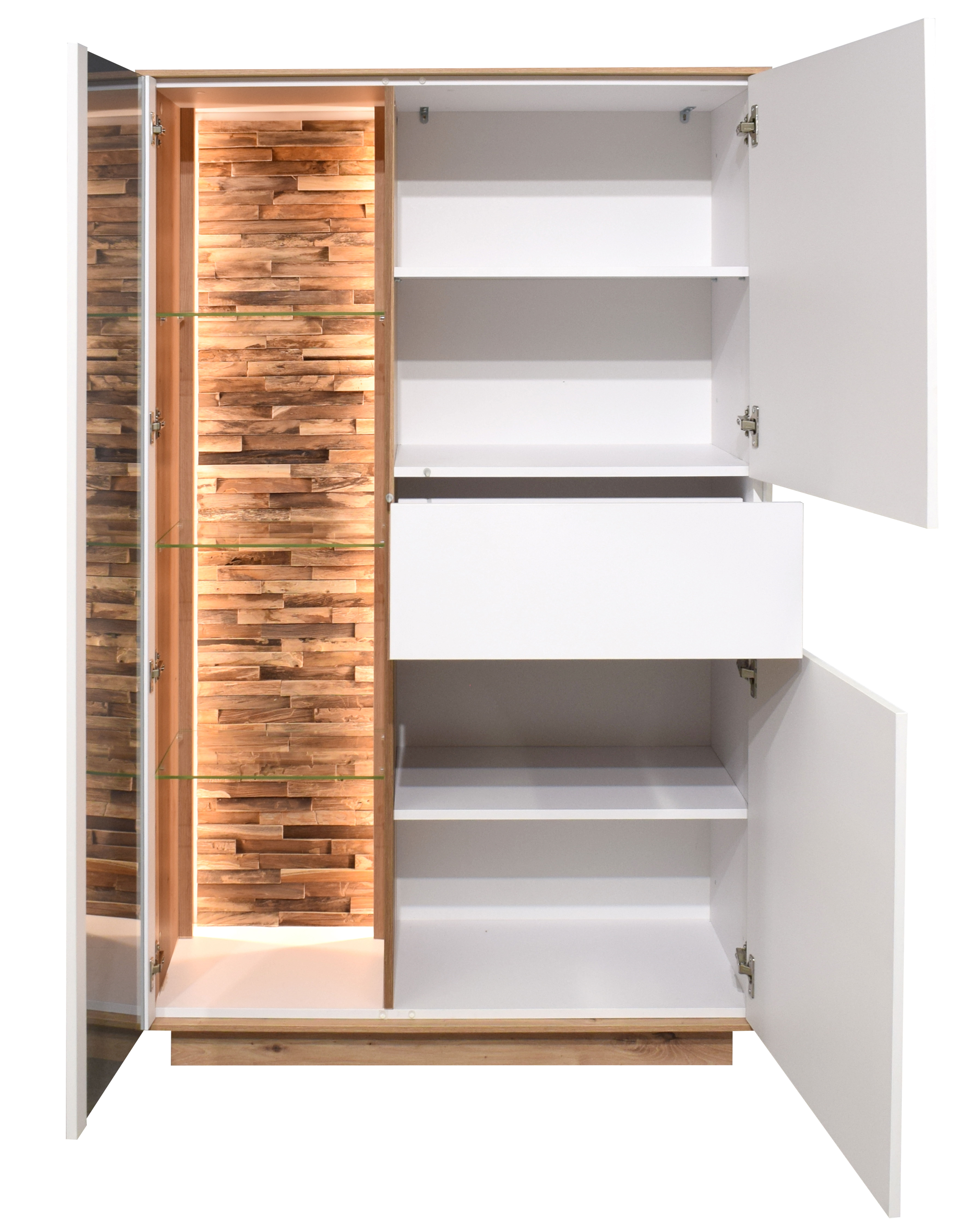 À gauche : 1 porte vitrée, 3 tablettes amovibles en verre, 1 décor bois (5 éléments)