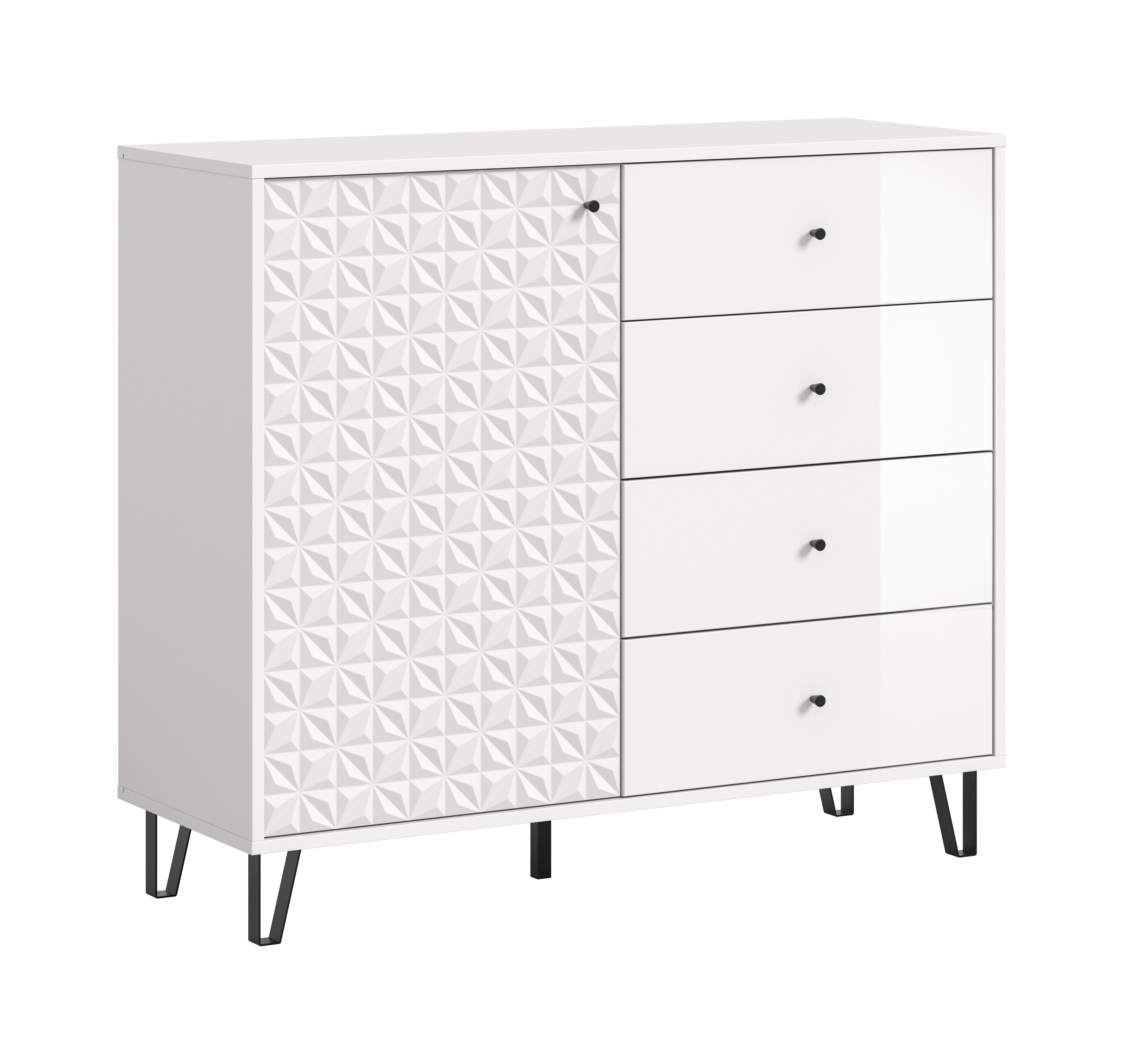 L’association entre décor blanc mat et ton blanc ultra brillant élégant attirera tous les regards dans la pièce. Avec ses dimensions compactes (env. 110 x 96 x 40 cm), il offre un vaste espace de rangement : derrière une porte se trouvent deux tablettes réglables en hauteur qui permettent d’adapter l’espace selon vos besoins. Trois casiers ouverts et qutare tiroirs pratiquent viennent compléter l’ensemble pour un rangement clair et organisé.