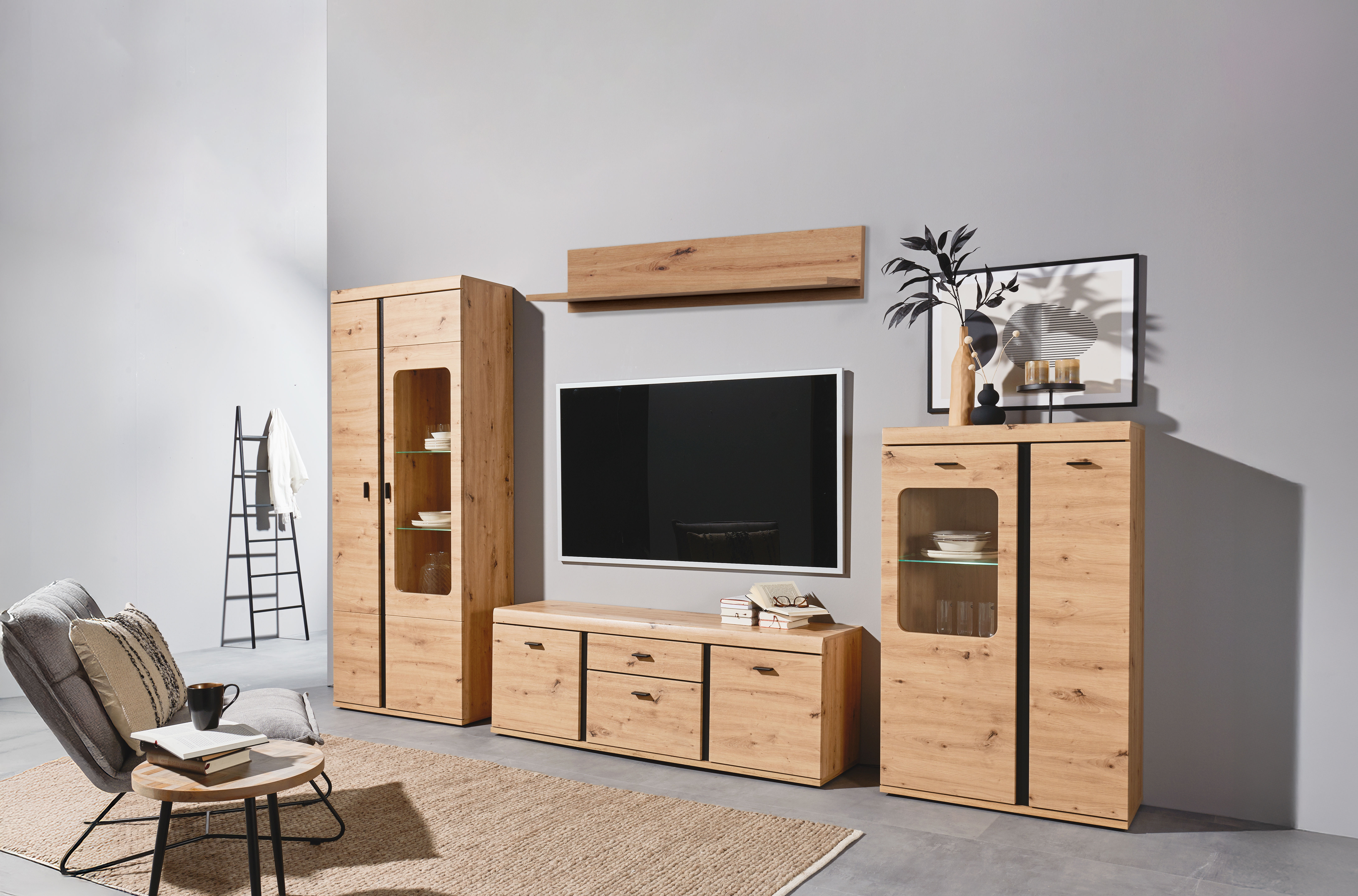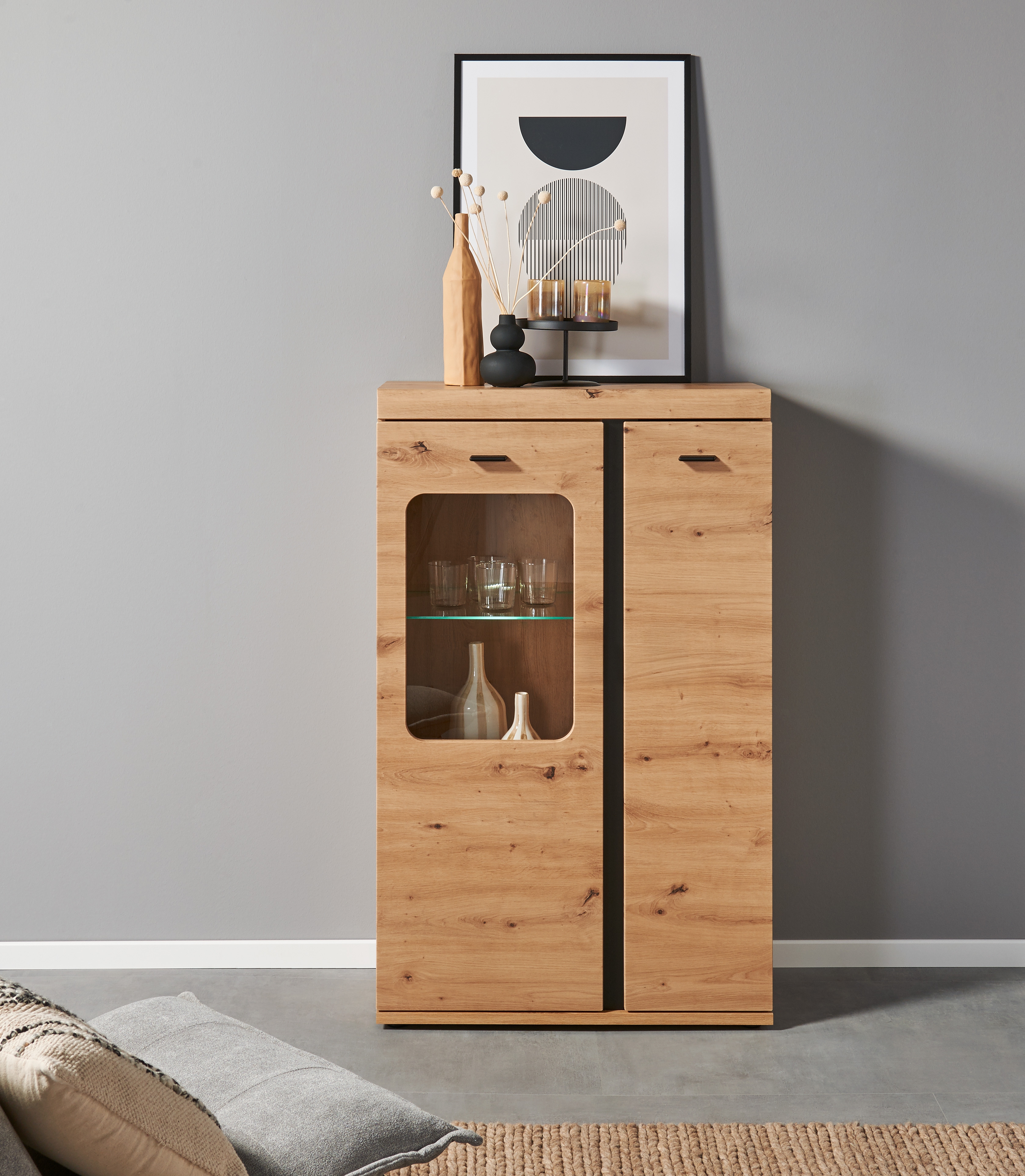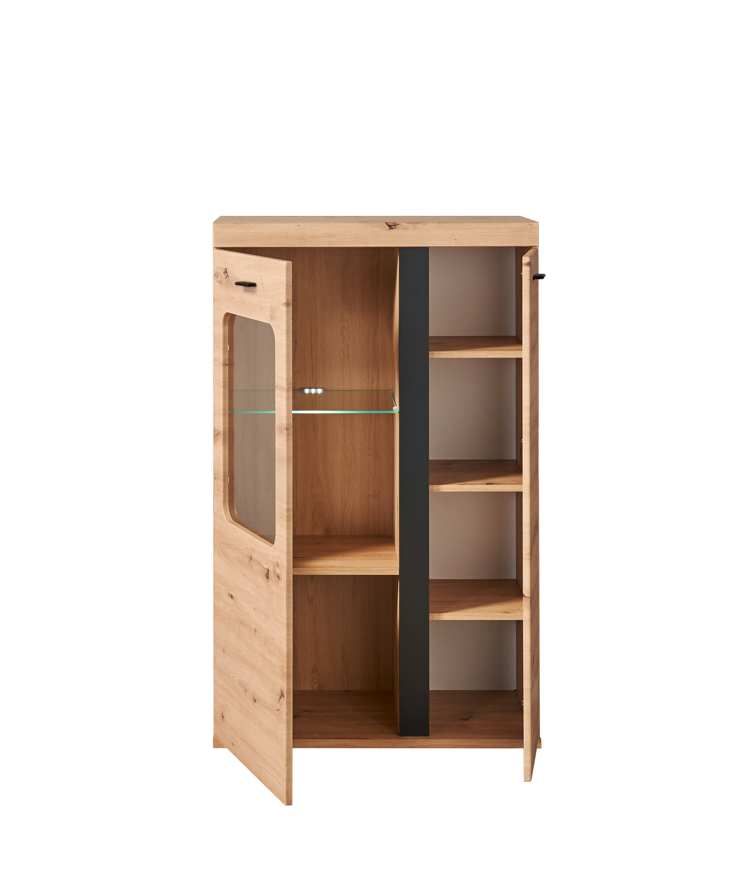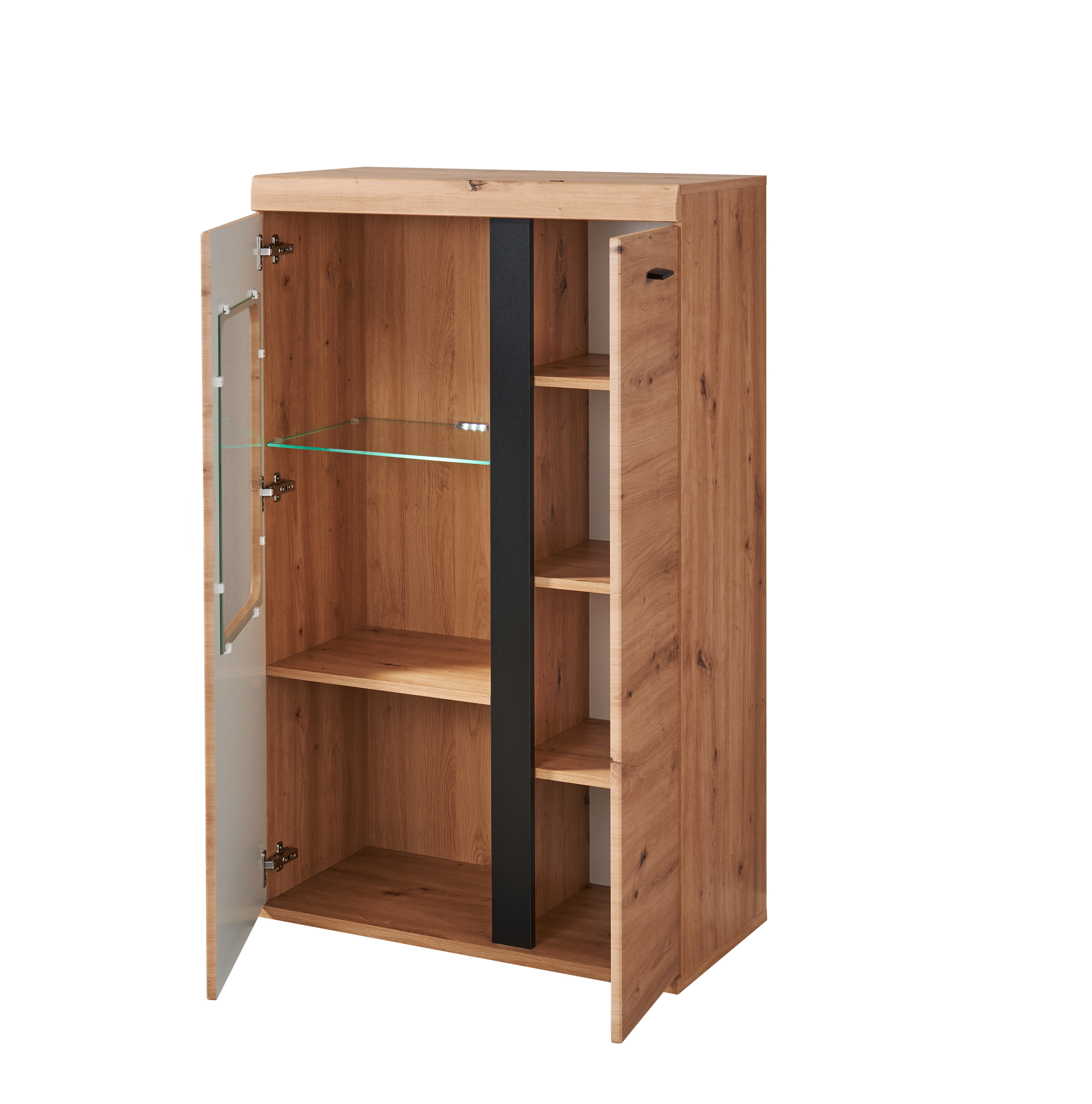 Façade : décor chêne Artisan, MDF (panneau de fibres de bois de densité moyenne) pelliculé avec contrastes ton noir (panneaux de particules mélaminés) / verre