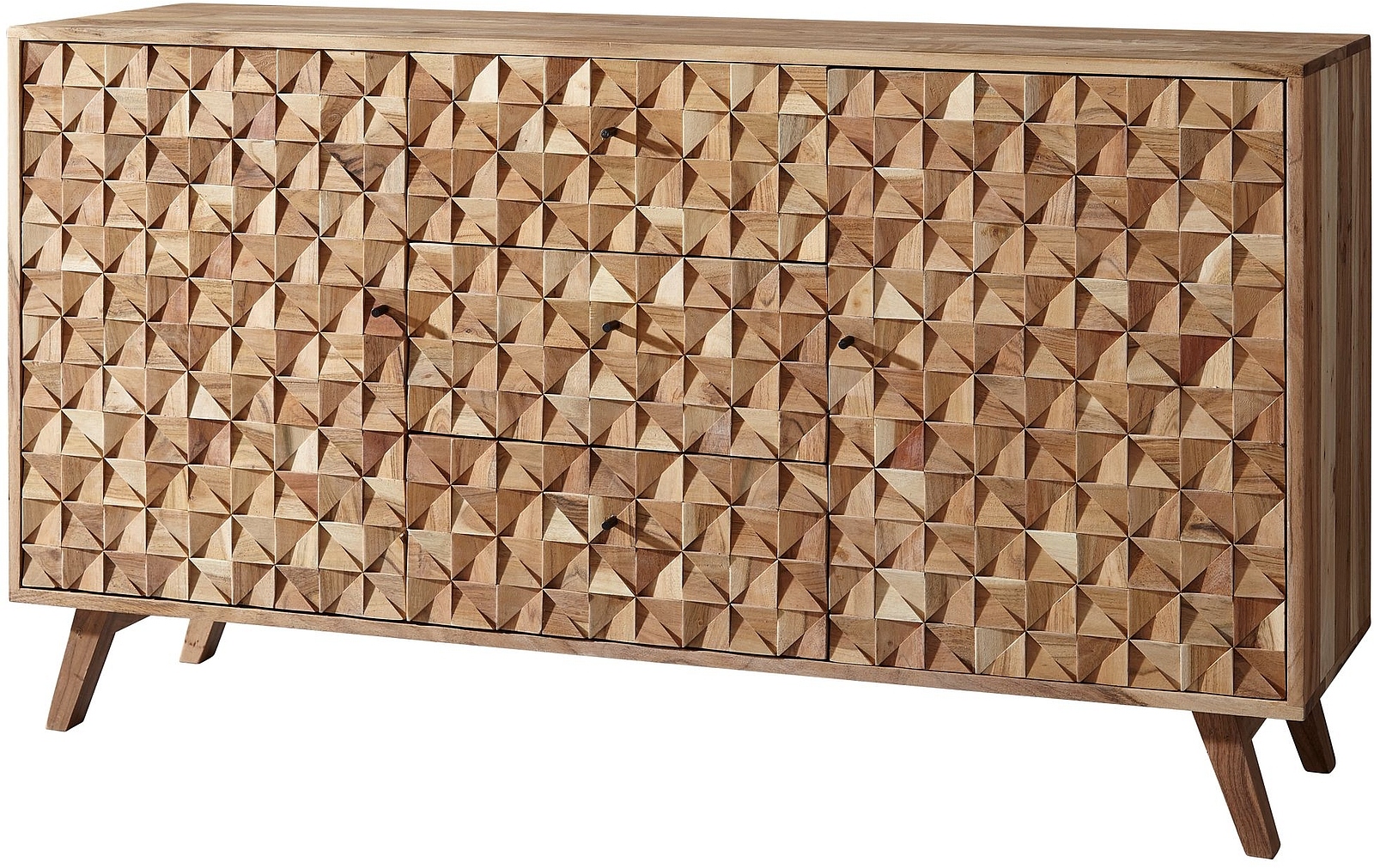 - PLAISIR POUR LES YEUX ✔ Les bahuts et commodes peuvent aussi être des œuvres d’art - le buffet à tiroirs REWA en est la preuve incontestable. La façade superbement travaillée fait immédiatement battre le cœur de tout amateur de meubles. Chaque petit triangle en acacia s'associe avec le triangle voisin afin de créer une façade absolument splendide pour ce meuble offrant un bel espace de rangement à l'intérieur de vos rêves !