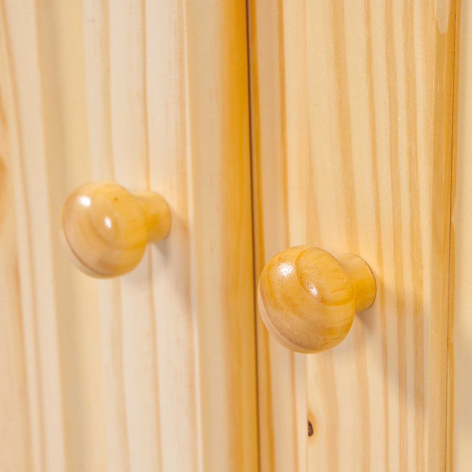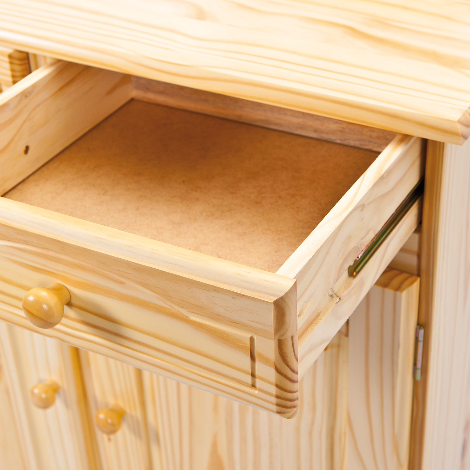 La surface en pin massif (pin Tadea) est scellée avec un vernis transparent à faible teneur en COV (composés volatils organiques) en substances nocives. Cela rend le bois facile d’entretien, hydrofuge et particulièrement durable. Chaque commode est fabriquée à partir de bois massif soigneusement sélectionné et traité selon des critères de qualité stricts. Le résultat : un meuble de qualité, durable et produit selon les normes environnementales européennes.