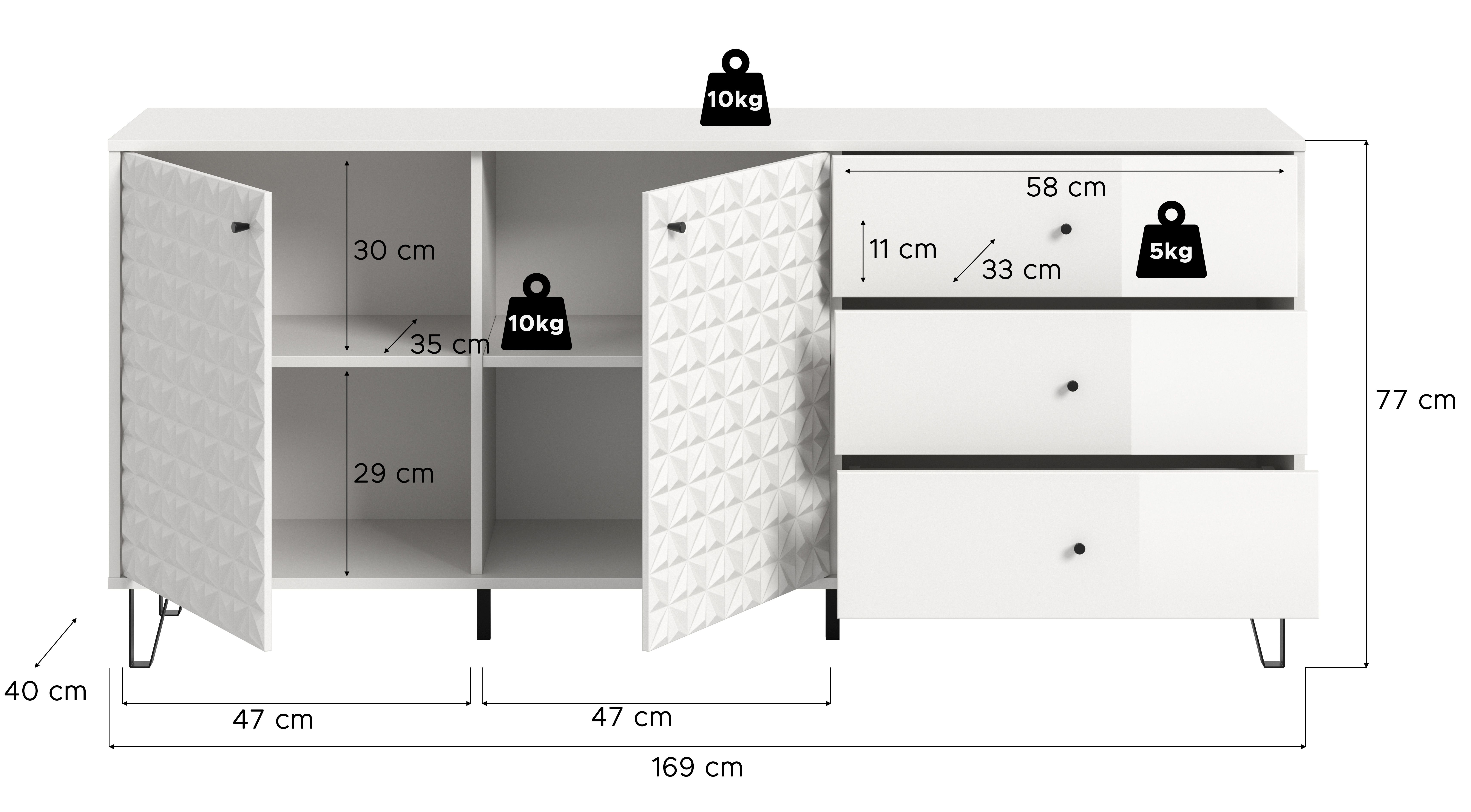 L’association entre décor blanc et ton blanc ultra brillant élégant attirera tous les regards dans la pièce. Avec ses dimensions généreuses (env. 170 x 76 x 40 cm), il offre un vaste espace de rangement : derrière deux portes se trouvent deux tablettes réglables en hauteur qui permettent d’adapter l’espace selon vos besoins. Quatre casiers ouverts et trois tiroirs viennent compléter l’ensemble pour un rangement clair et organisé.