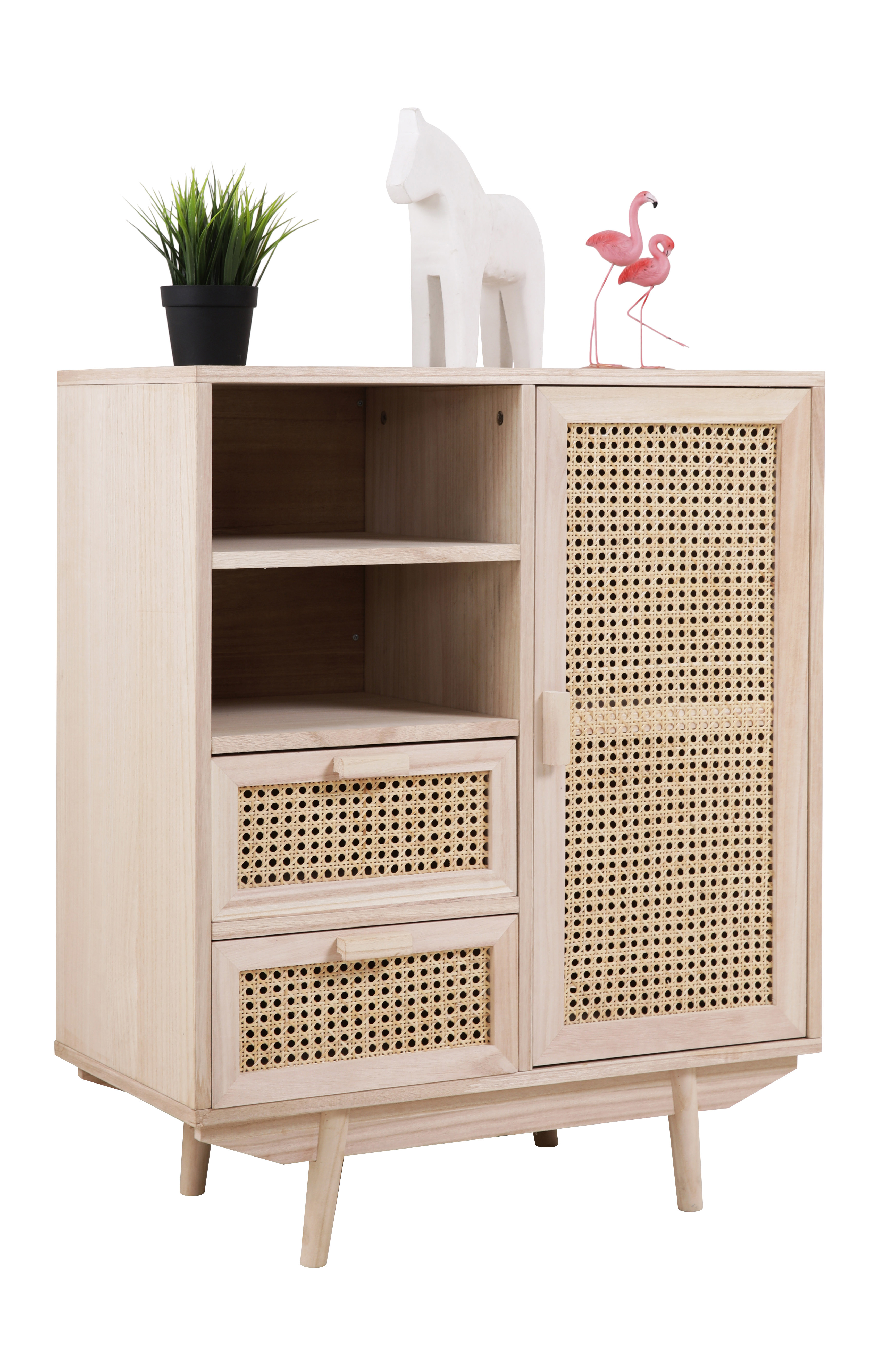 Ce bahut au design naturel attirera tous les regards dans votre intérieur. La couleur naturelle confère à ce buffet une touche particulière. Dans deux tiroirs et derrière une porte ornée de cannage, vous trouverez un grand espace de rangement fermé pour les petites choses du quotidien. Deux casiers ouverts vous offrent de la place supplémentaire. Le caisson en MDF est recouvert d'un placage en bois de paulownia. Les 4 pieds sont également en bois de paulownia. Sur le plateau, il y a suffisamment de place pour les articles de décoration ou les fleurs. Les meubles en matériaux naturels sont tout à fait dans l'air du temps. La commode sera toujours tendance tout en se combinant à merveille avec l'ameublement déjà existant.