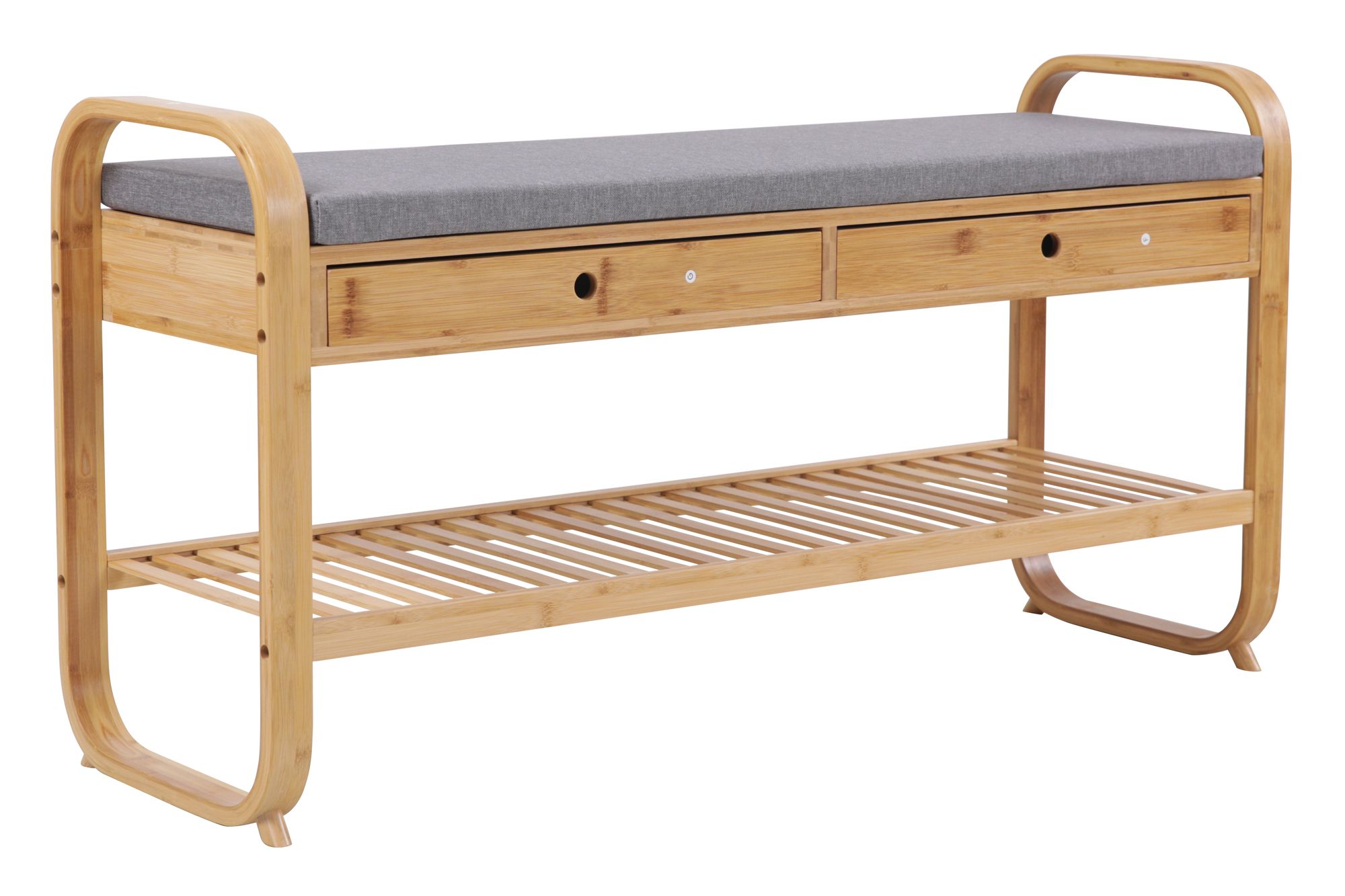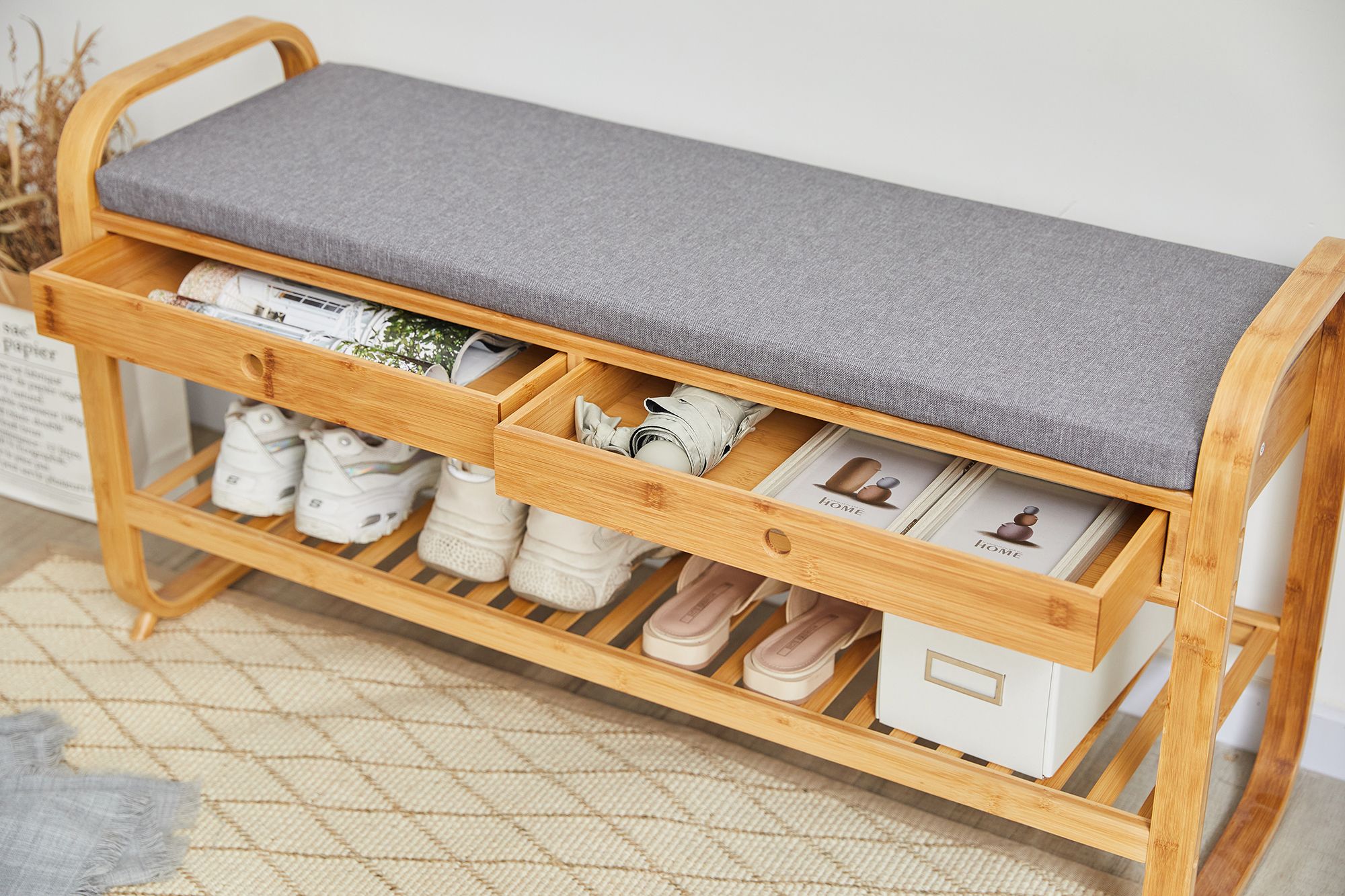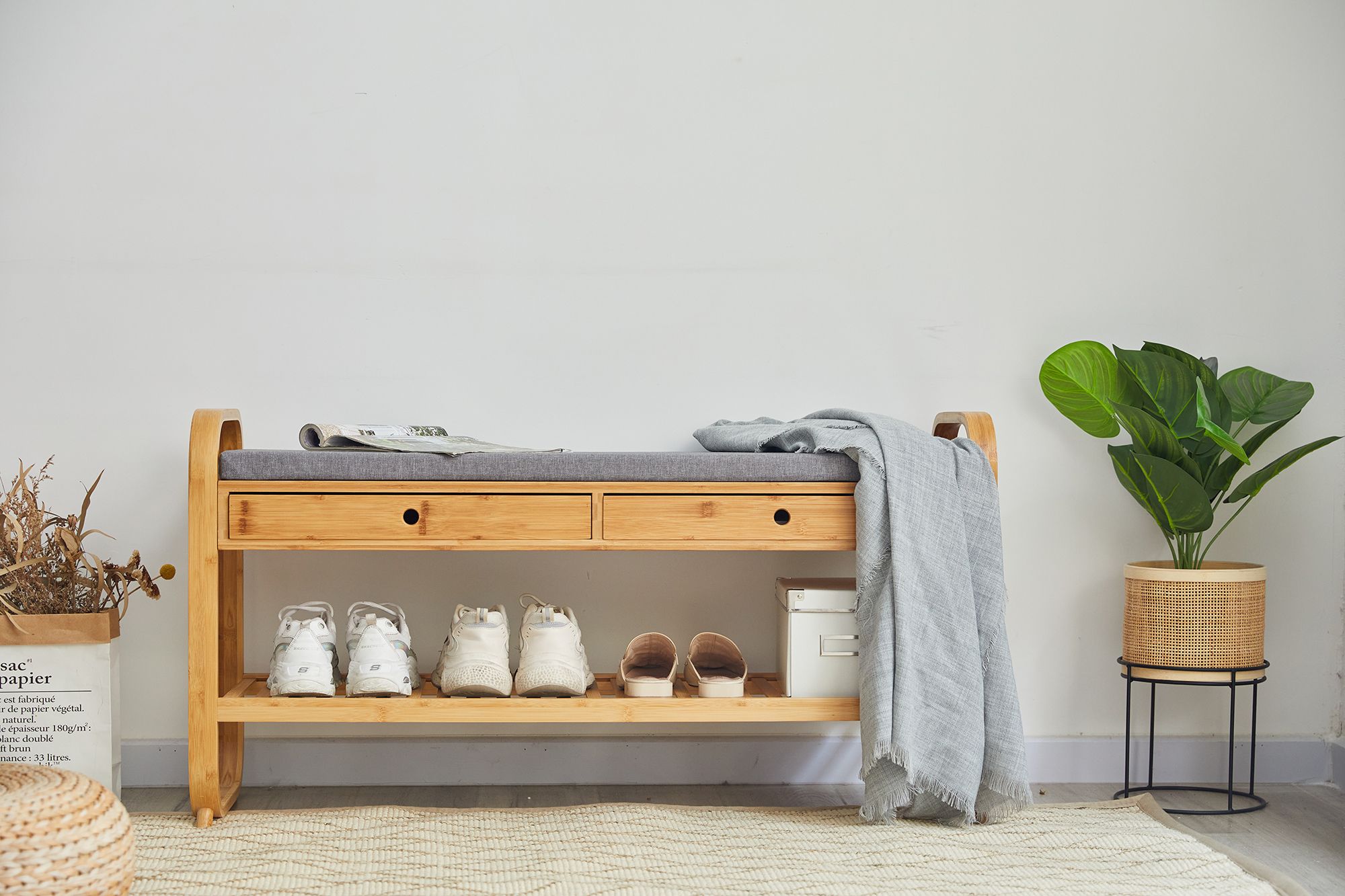 Banc à chaussures stylé avec une surface d'assise pratique : ce banc de vestiaire associe confort et espace de rangement de façon moderne. La structure est fabriquée en bois de bambou robuste et durable, un matériau idéal pour une utilisation quotidienne. Grâce au coussin d'assise moelleux, le meuble d'entrée ne permet pas seulement de ranger jusqu'à 5 paires de chaussures, il se transforme également en un banc à l'assise confortable. Quatre petits pieds au niveau des arceaux latéraux empêchent le banc de basculer et garantissent une excellente stabilité. Deux tiroirs offrent un espace de rangement supplémentaire pour les petits accessoires. Le design sobre en bambou naturel et tissu gris s'intègre facilement dans tout type d'entrée.