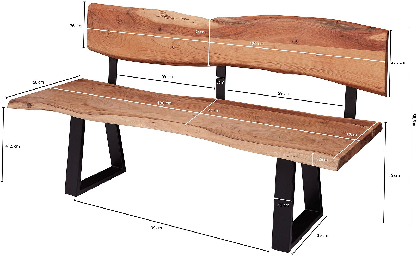 - La profondeur et la hauteur du dossier peuvent être légèrement modifiées du fait de la conception du banc
